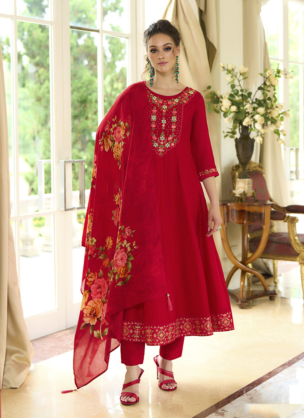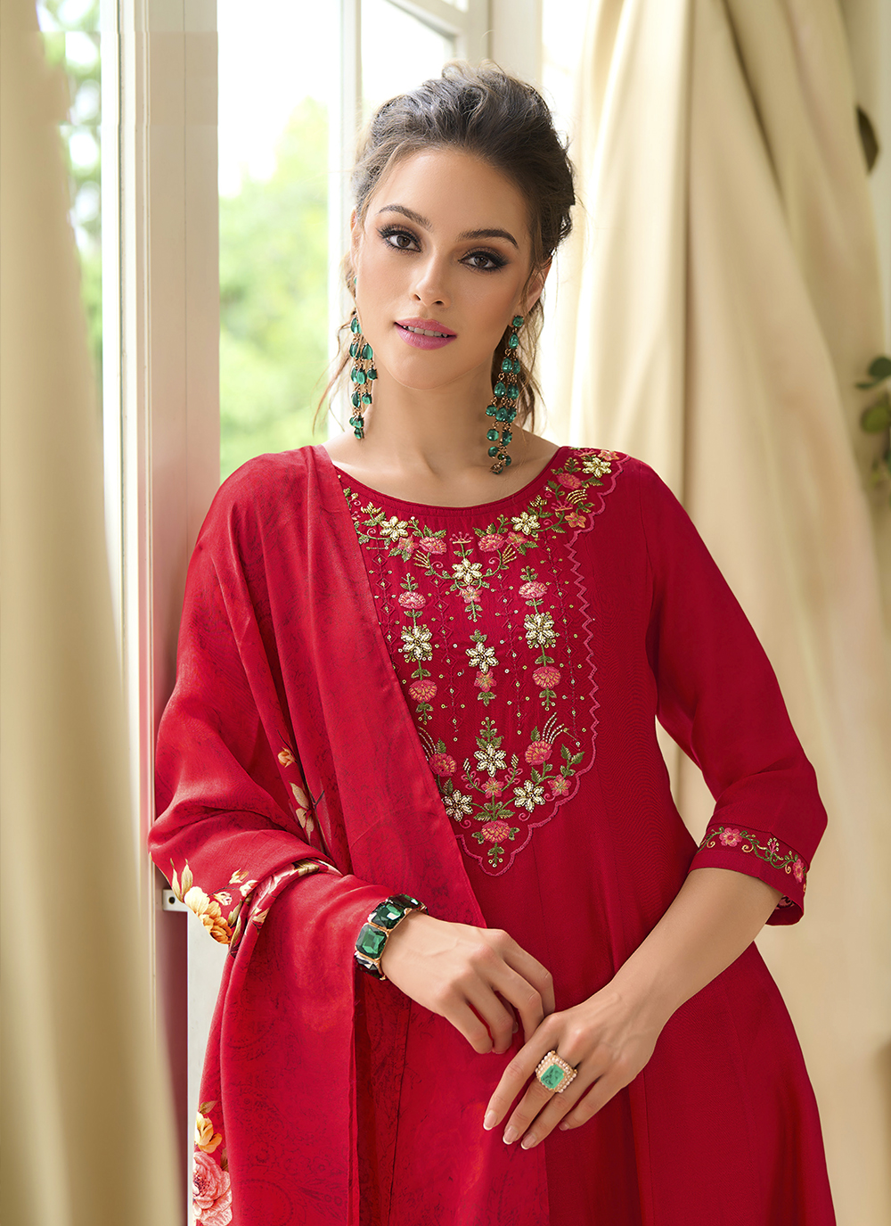 Red Color Beautiful Embroidered Vichitra Silk Fabric Ceremonial Suit