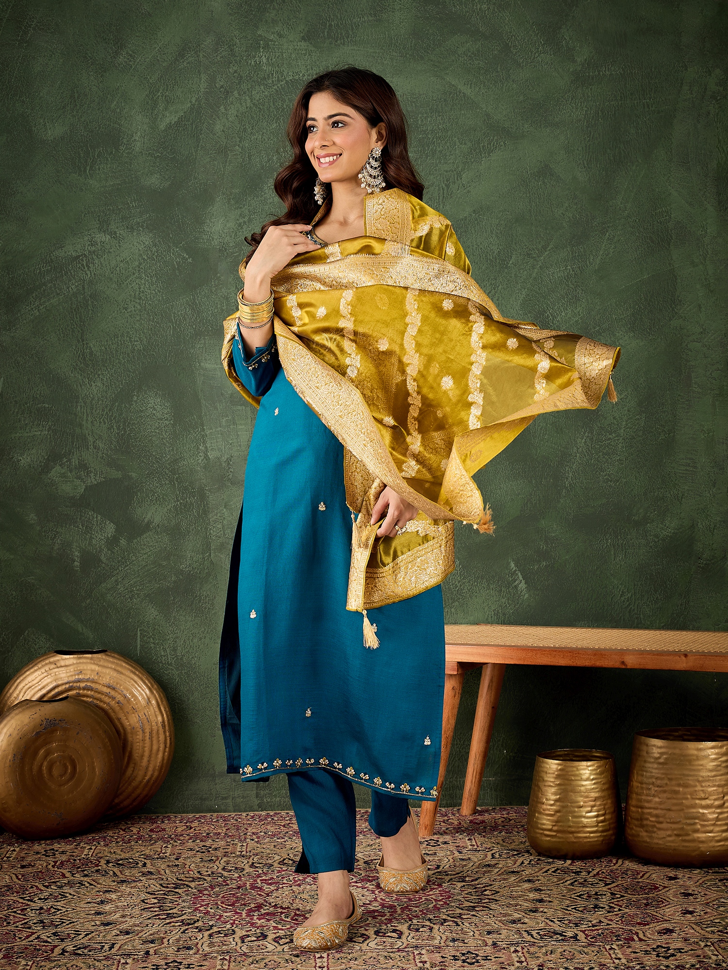 Teal Blue Color Smart Viscose Rayon Fabric Designer Embroidery Work Ceremonial Kurta Set