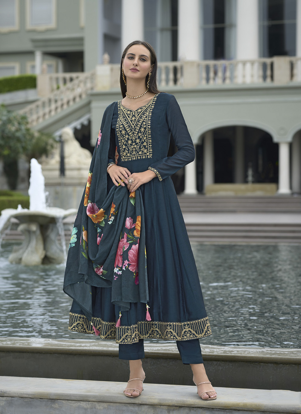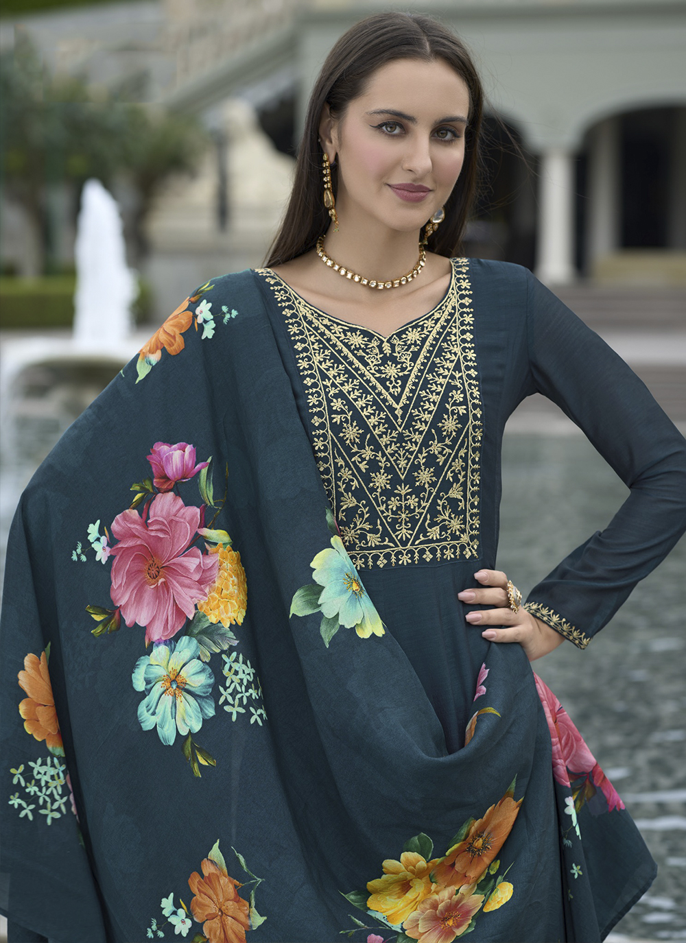 Attractive These Beautiful Looking Readymade Suits.These Top Are Vichitra Silk And Bottom Are Vichitra Silk And Dupatta Are Russion Silk Fabricated.Its Beautified With Jari,Sequance Embroidery Work With Digital Printed Dupatta.