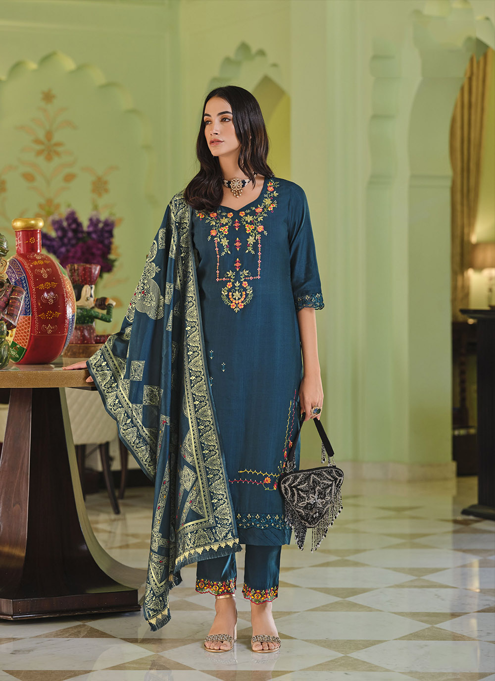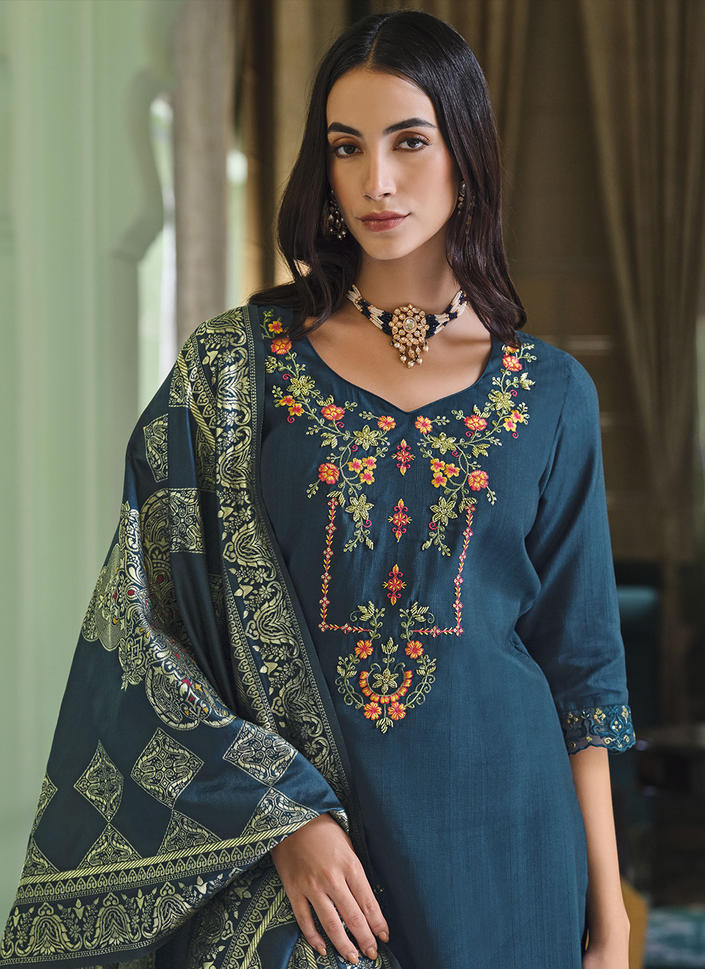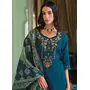 Teal Blue Color Viscose Fabric Woven Designer Readymade Suit With Hand Work