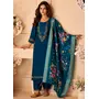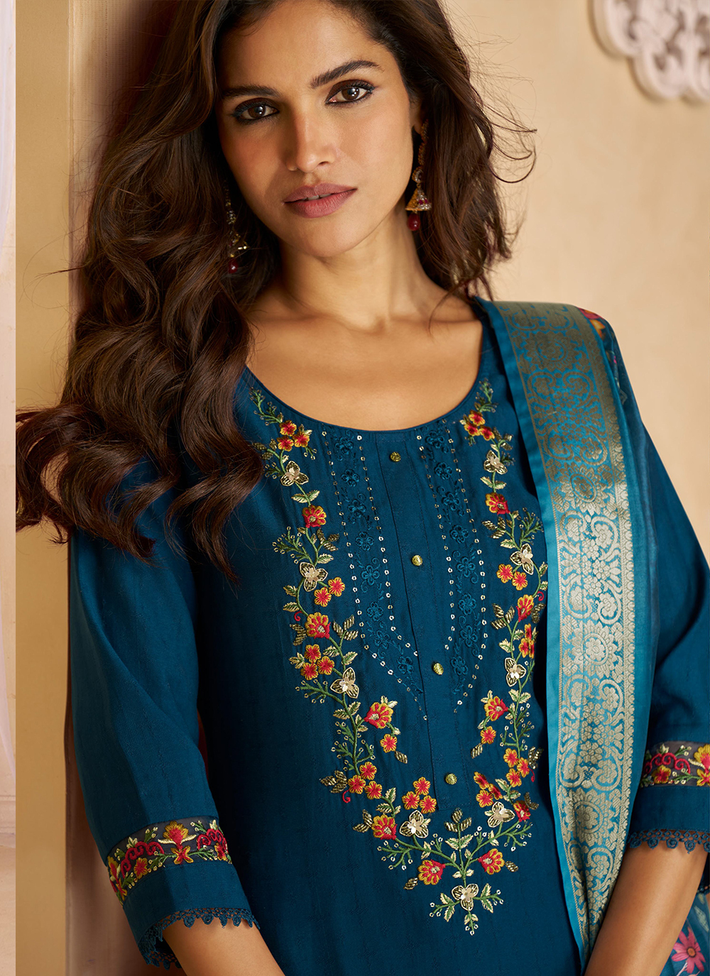 Teal Blue Color Viscose Silk Fabric Designer Embroidered Ceremonial Salwar Kameez