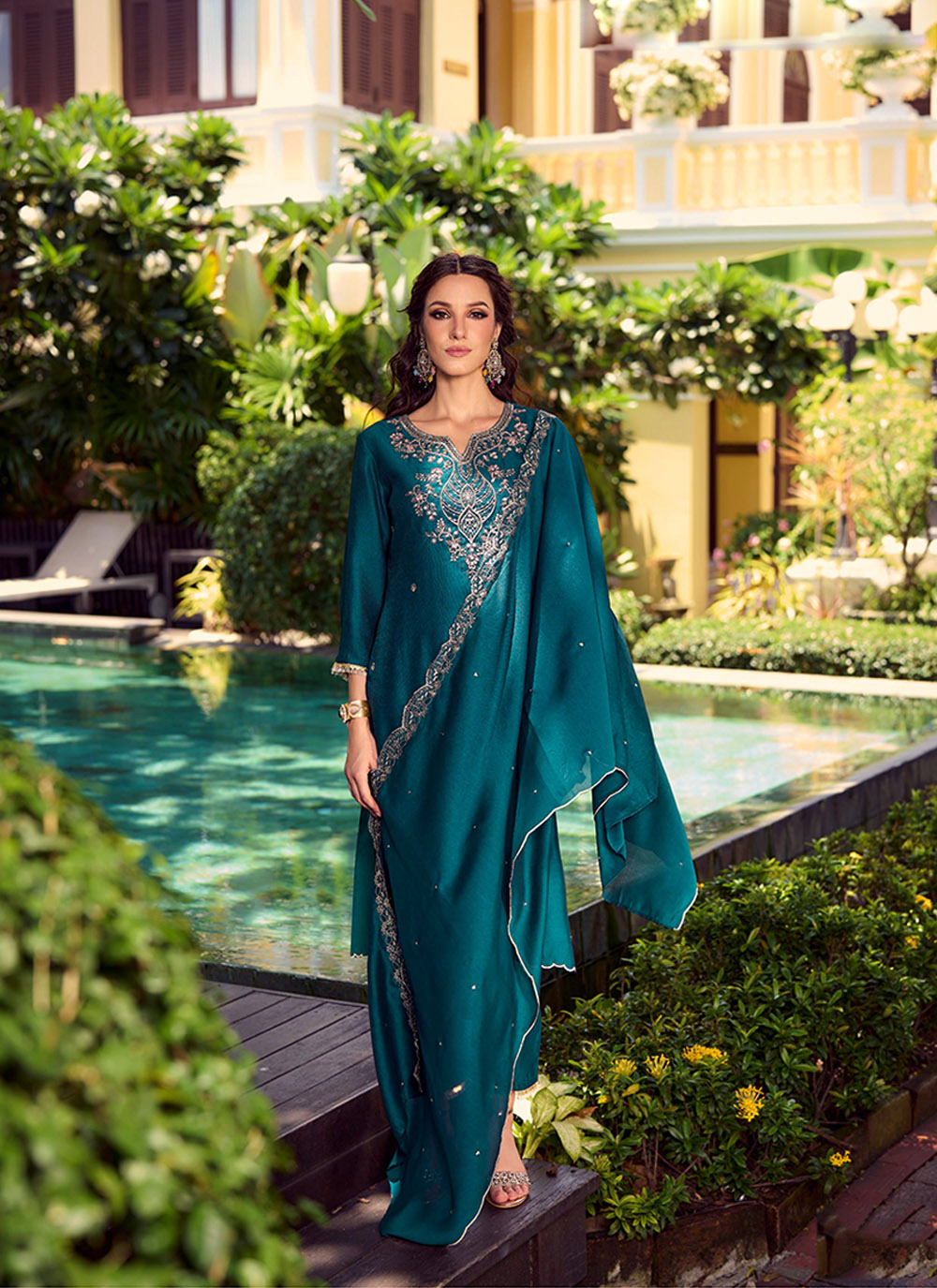 Teal Color Beautiful Ceremonial Shimmer Silk Fabric Embroidered Girls Suit