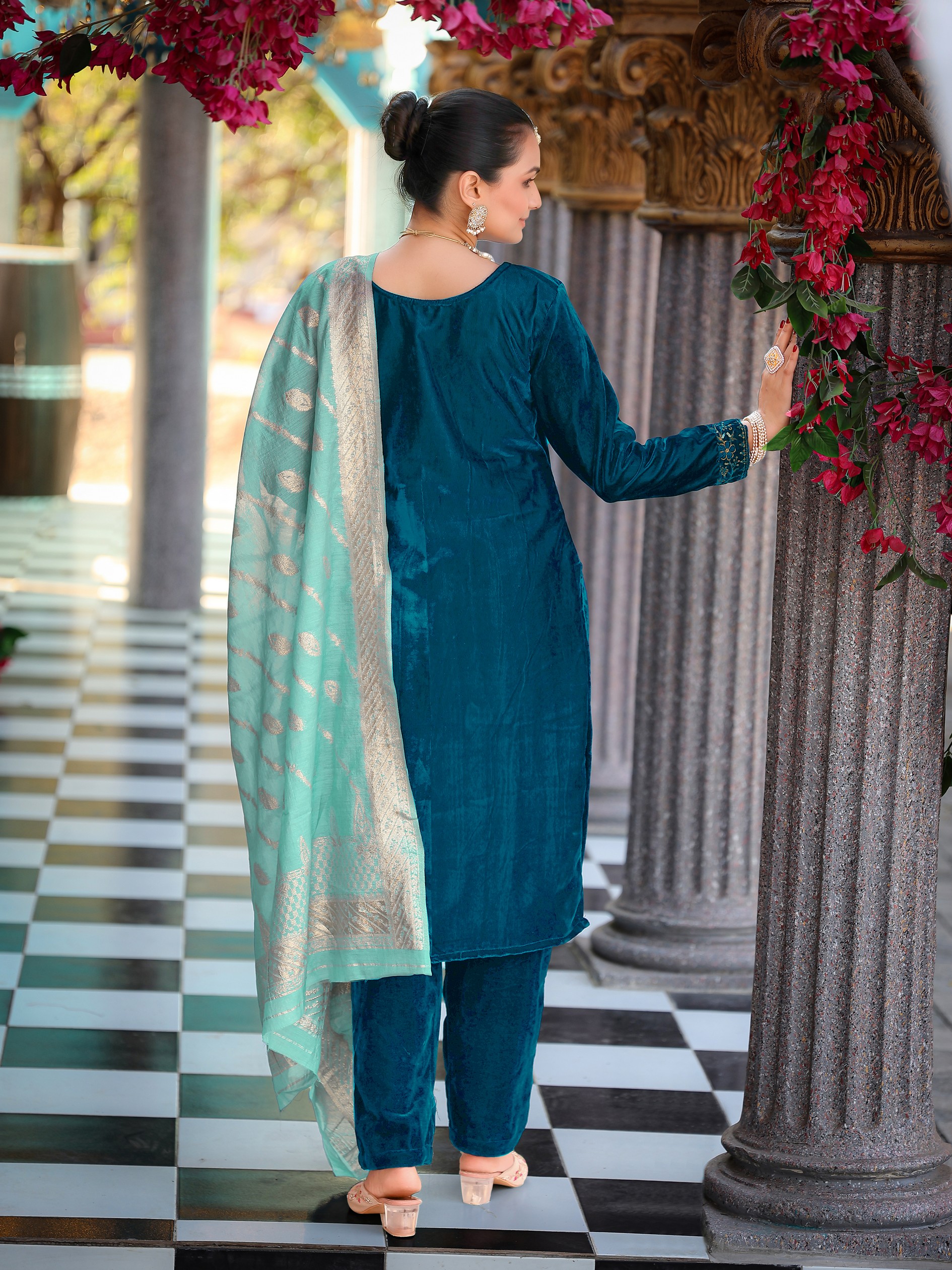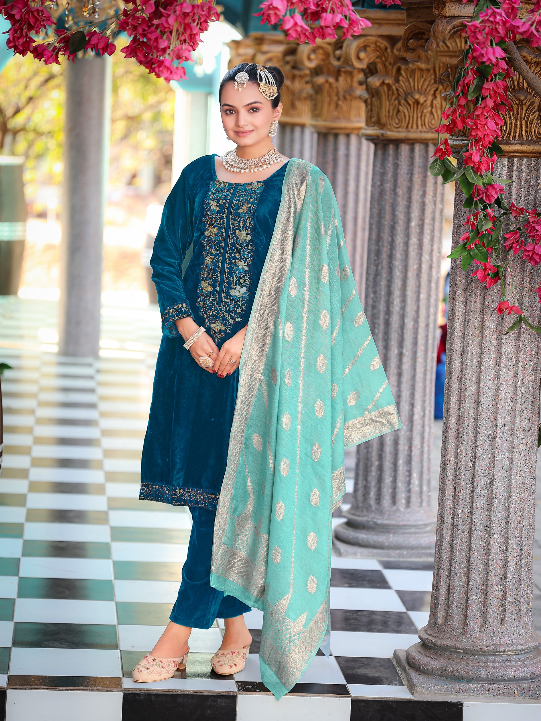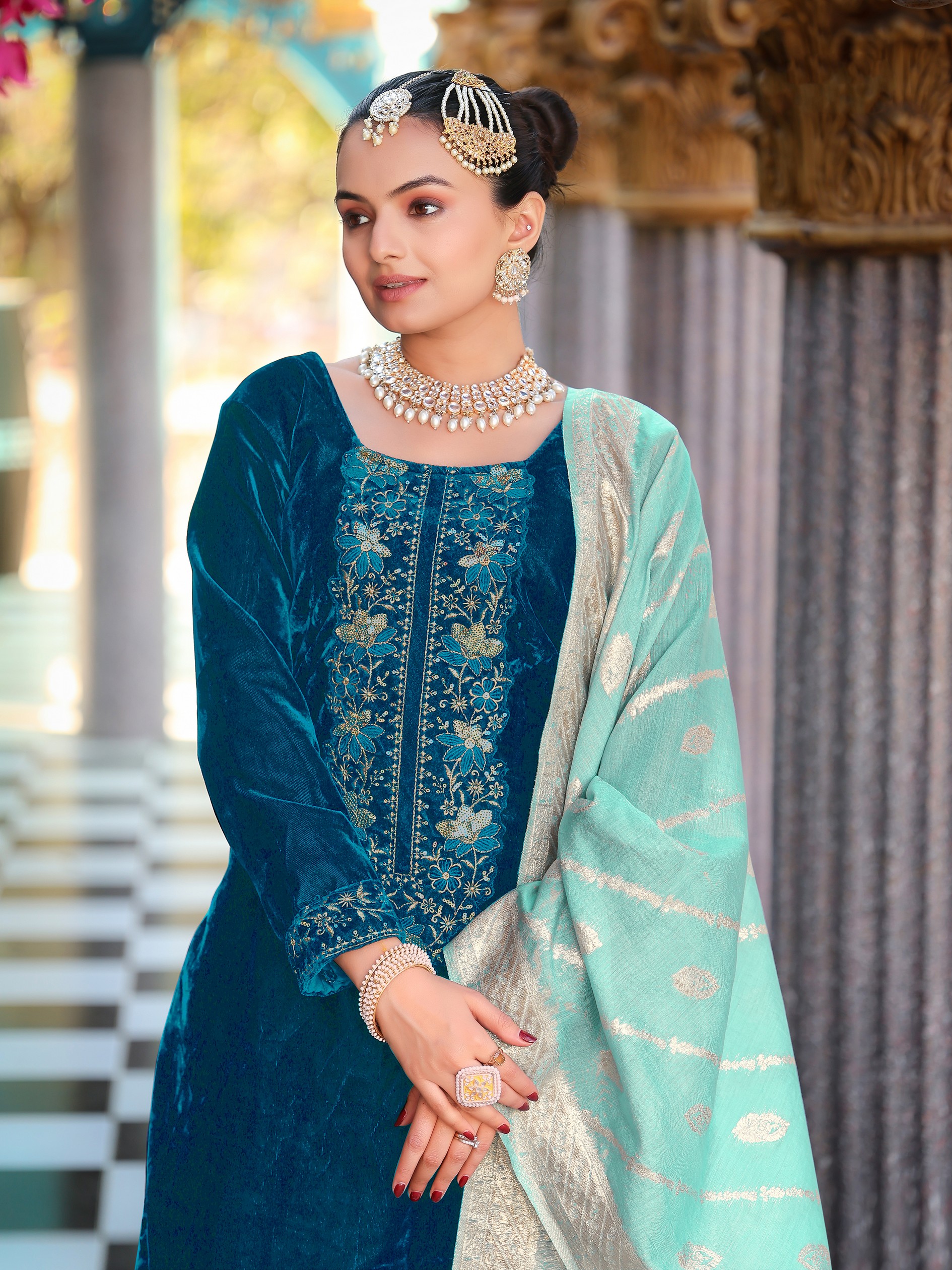 Teal Color Velvet Fabric Heavy Wedding Ceremonial Salwar Kameez