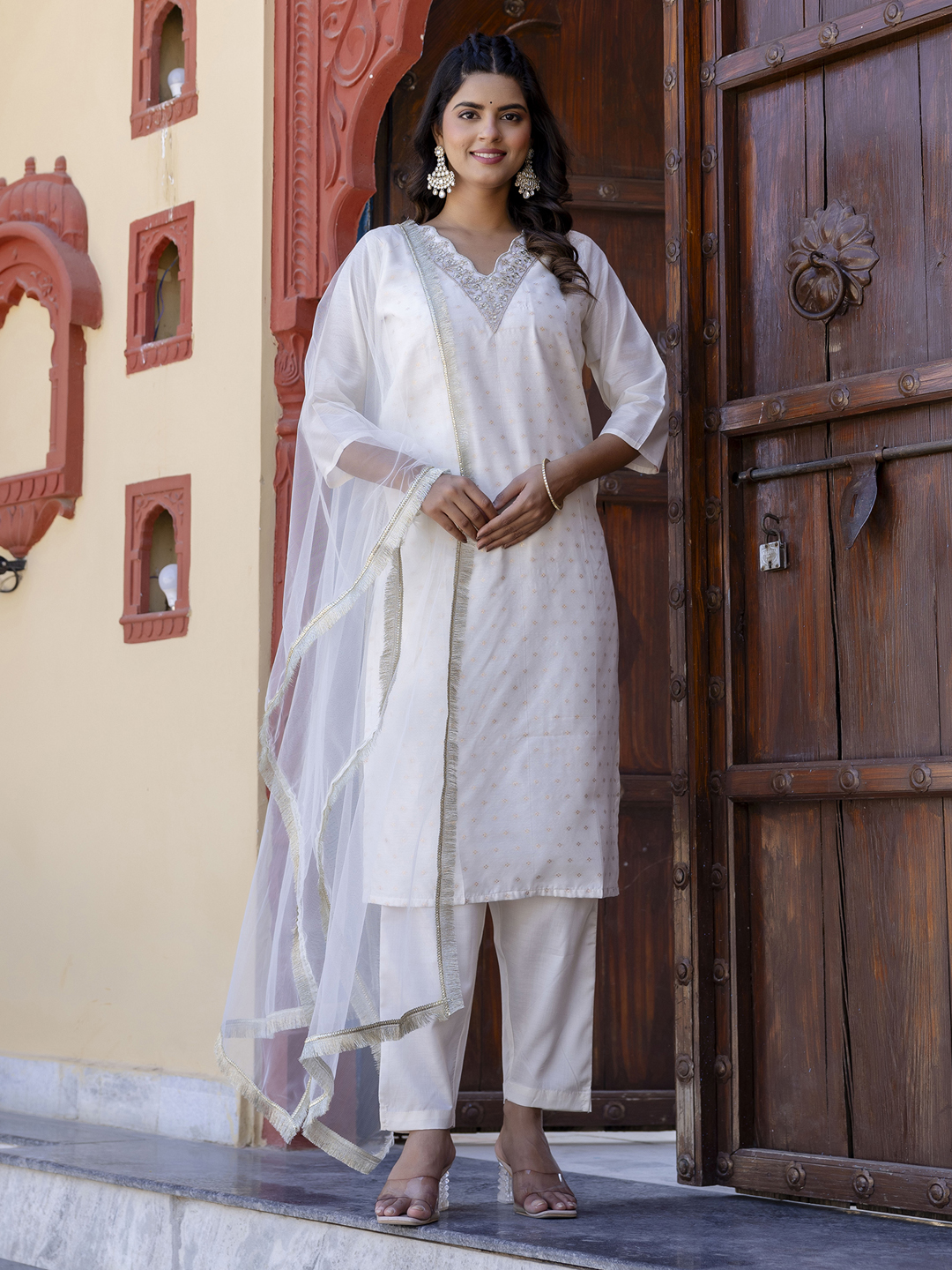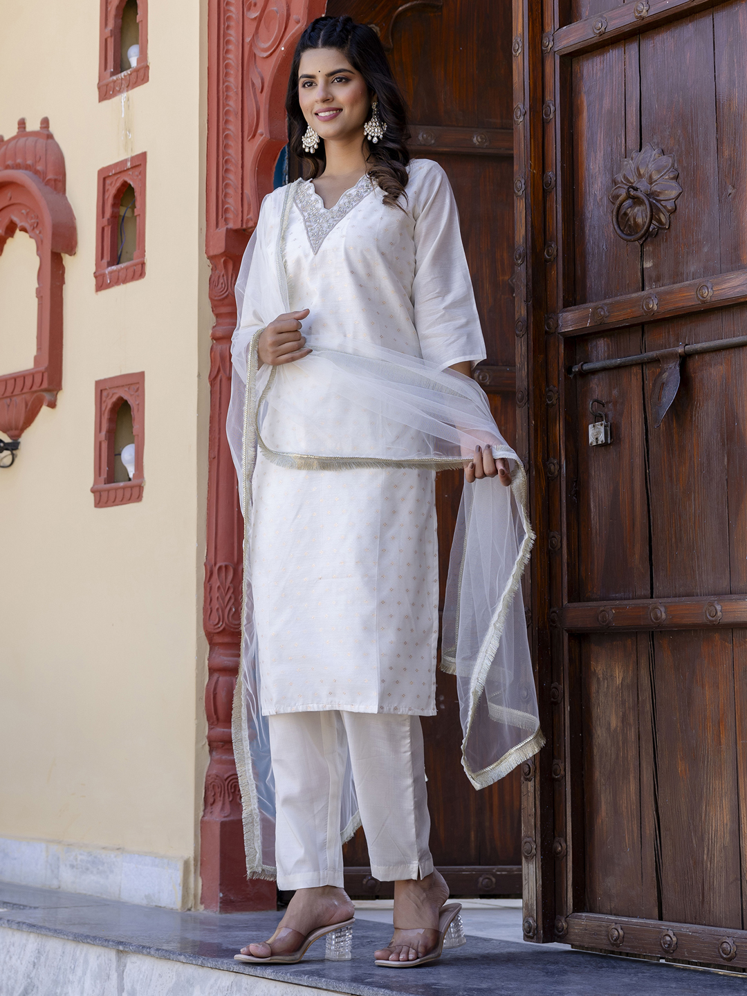 White Color Chanderi Silk Fabric Beautiful Festive Wear Readymade Kurta Set