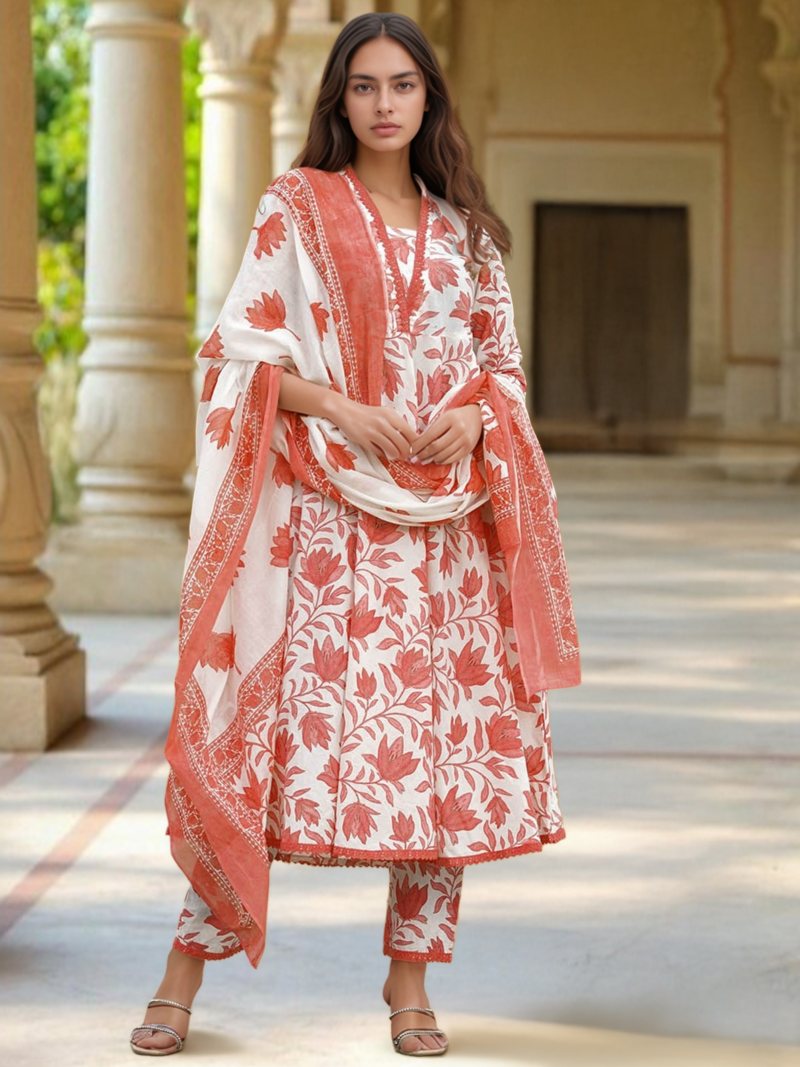 White Color Cotton Slub Fabric Ethnic Reaymade Kurta Set With Dupatta