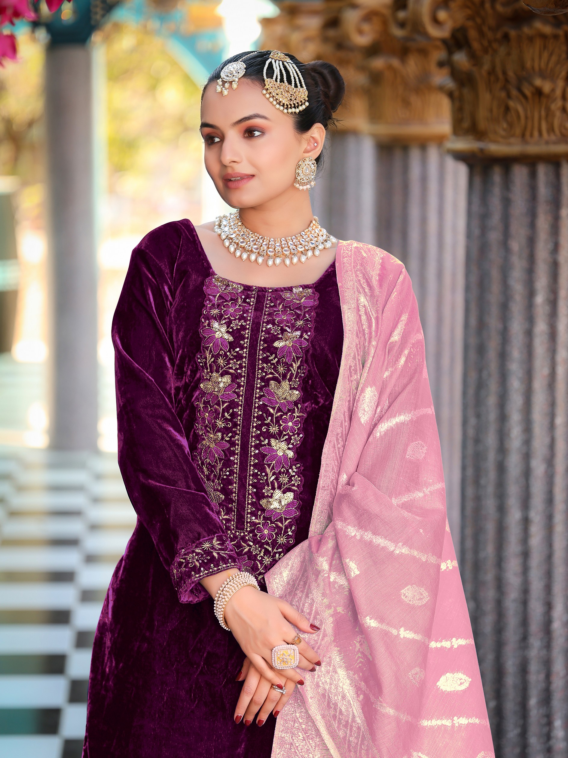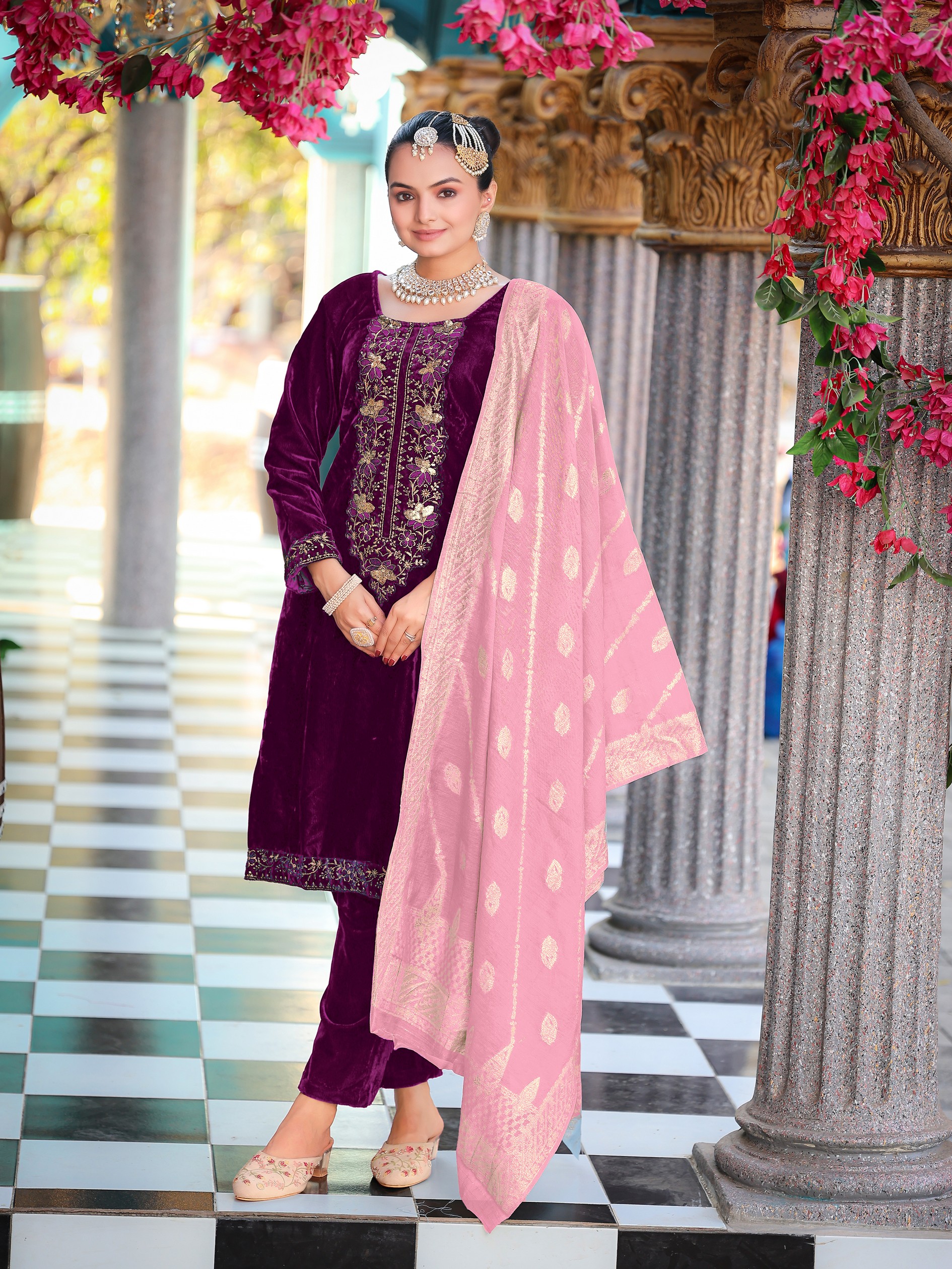 Wine Color Velvet Fabric Heavy Wedding Ceremonial Salwar Kameez