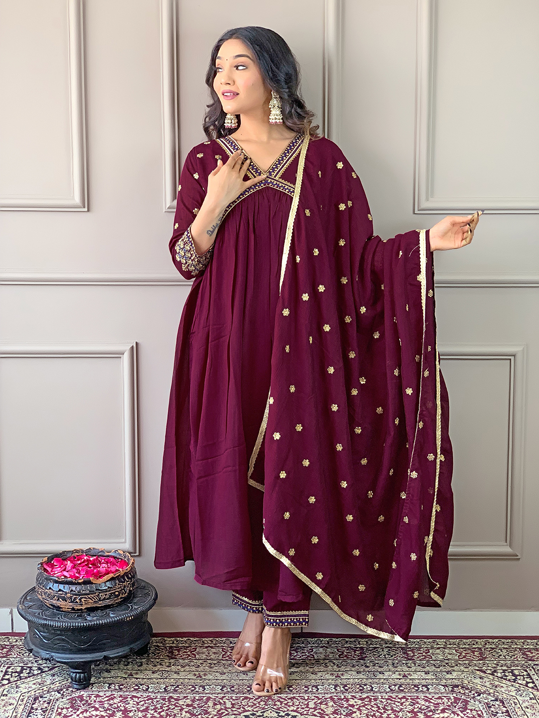 Wine Color Vichitra Silk Fabric Ceremonial Wear Embroidery Work Kurta Set