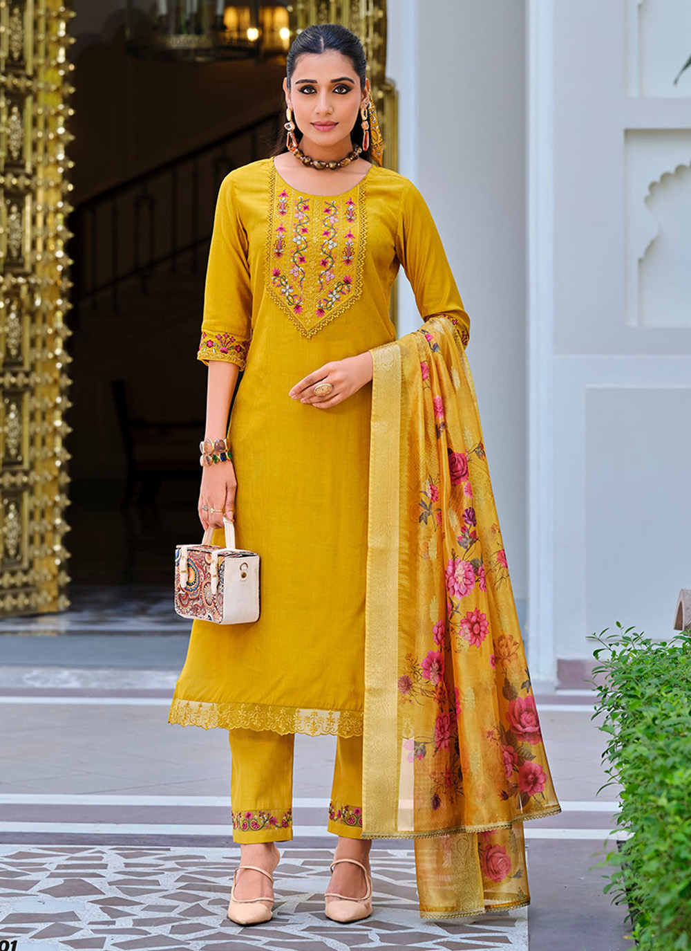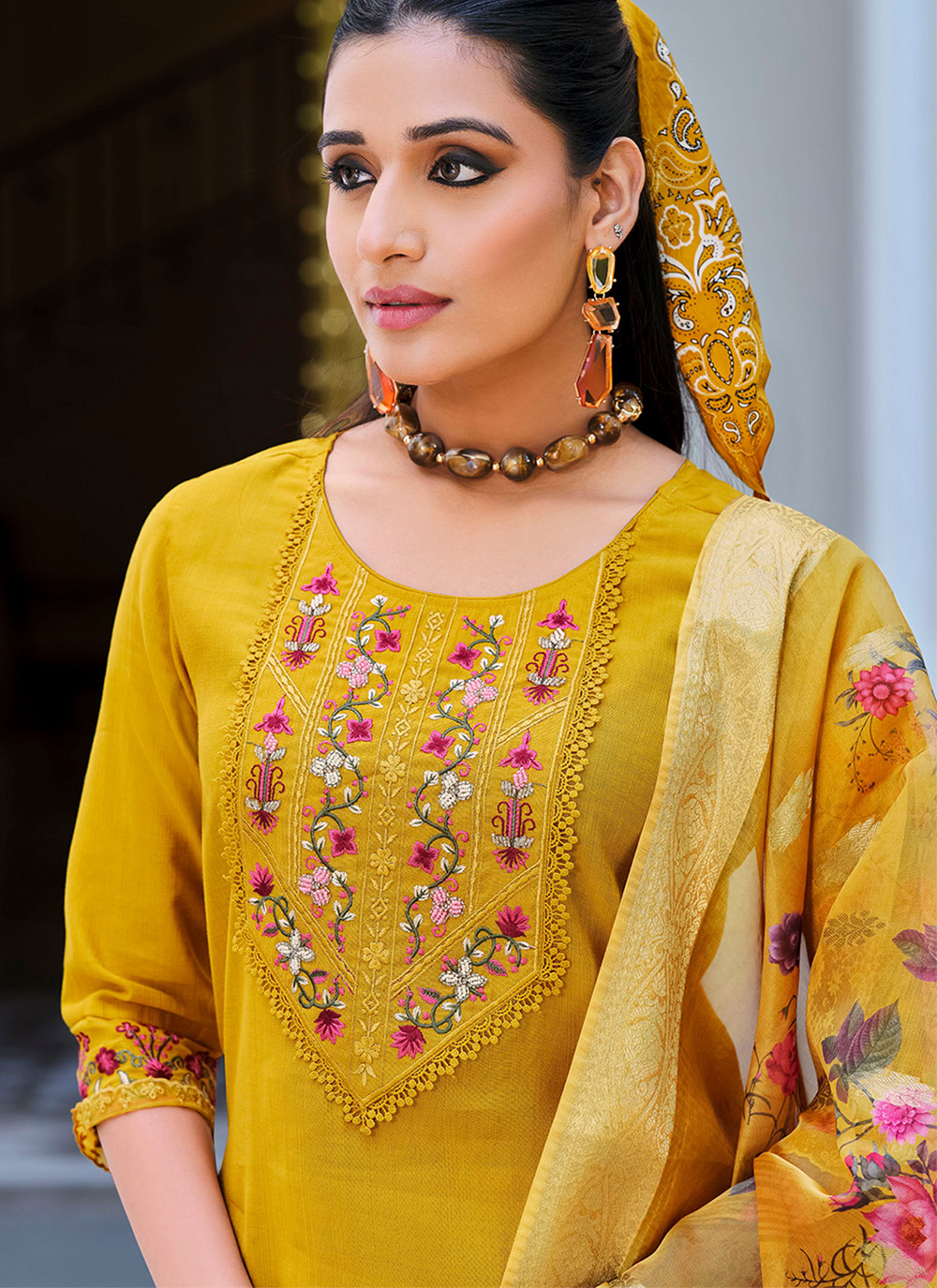 Yellow Color Viscose Fabric Designer Embroidered Readymade Suit