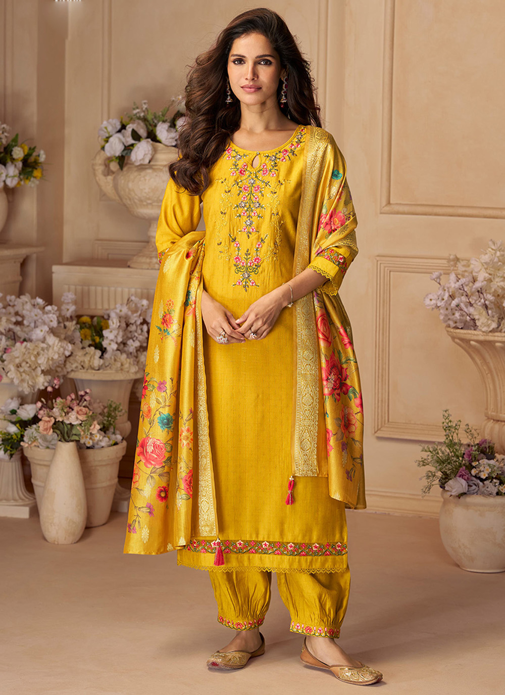 Yellow Color Viscose Silk Fabric Designer Embroidered Ceremonial Salwar Kameez