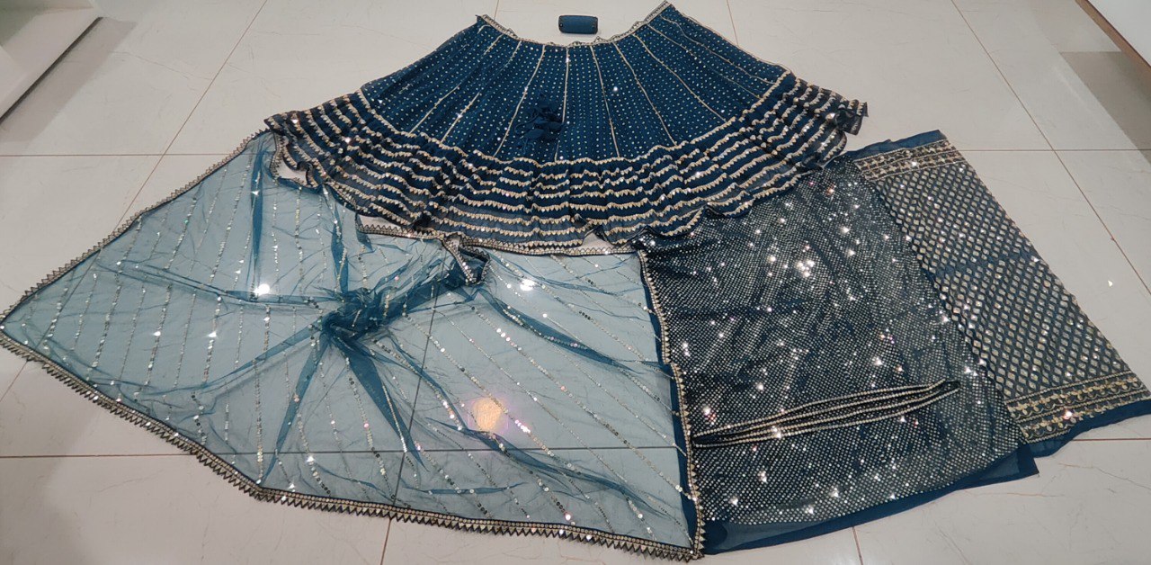 LEHNGA(BOTTOM): -FABRIC: - FAUX GEORGETTEINNER: - MICRO FABRICWORK: - 3MM, 5MM AND 9MM SEQUINS WITH ZARI EMBROIDERY WORKSTITCH: - SEMI STITCHED WITH CANCAN AND CANVASSIZE: - 42 HEIGHT AND 42 WAIST FLAIR: - 4 METERCHOLI(TOP): -FABRIC: - FAUX GEORGETTESIZE: - 0.70 METER CHOLI ALLOVER EMBOIDERED FABRIC 0.40 METER SLEEVES ALLOVER EMBROIDERED FABRICWORK: - 5MM SEQUINS EMBROIDERY WORK IN BLOUSE, 3MM, 5MM AND 9MM SEQUINS EMBROIDERY WORK IN SLEEVES STITCH: - UNSTITCHED FABRICDUPATTA: -FABRIC: - NETWORK: - 5MM, 9MM SEQUENCE AND JARI EMBROIDERY WORK SIZE: - 2.25 METER DUPATTASTITCH: - FULL STITCHADDITIONALWASH CARE: - DRY CLEAN ONLYCOLOR: - PRODUCT COLOR MAY SLIGHTLY VARY DUE TO PHOTOGRAPHIC LIGHTNING SOURCES OR YOUR DEVICE DISPLAY SETTINGSTHESE ARE MADE TO ORDER DESIGNER STYLES, HENCE EXPECT A SLIGHT VARIATION FROM THE IMAGE DISPLAYEDIN THE BOX 1 LEHENGA 1 DUPATTA 0.70 METER BLOUSE FABRIC 0.40 METER SLEEVES FABRIC (1 SET OF HAND MADE TASSELS)ALTERNATIVEHANDMADE TASSELS MAY DIFFER FROM THE PHOTOS AND VIDEOS. TASSELS WILL BE AVAILABLE AS LONG AS THE CURRENT STOCK LASTS. ALTERNATIVELY, NEW STOCK MAY TAKE SOME TIME TO ARRIVE. WE ARE NOT STRICTLY BOUND TO PROVIDE TASSELS.