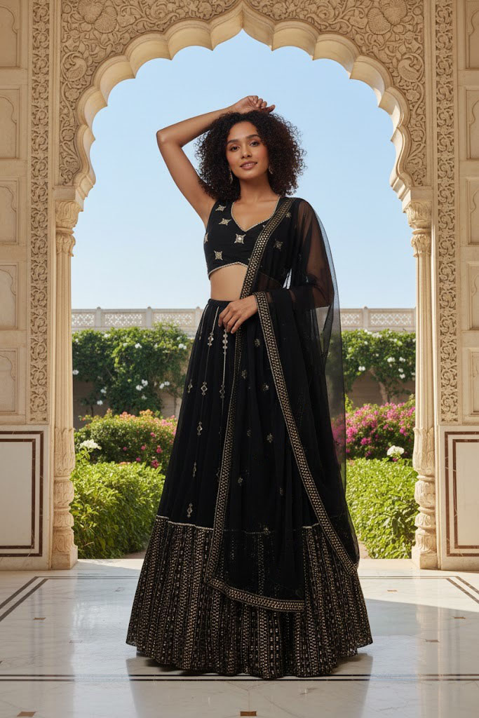 LEHENGA(BOTTOM)FABRIC:- GEROGETTEINNER:- MICROWORK:- 3MM 5MM SEQUINS WITH JARI AND PAPER MIRROR EMBROIDERY WORKSTITCH:- SEMI STITCHED(WITH KENKEN AND KENVAS)SIZE:- 42HEIGHT AND 42 TO 44 WAISTFLAIR:- 4.20 METER FLAIRCHOLI(TOP)FABRIC:- GEORGETTEBLOUSE SIZE:- 1 METER FABRICWORK:- JARI WITH PAPER MIRROR EMBROIDERY WORK STITCH:- UN STITCHED FABRIC WITH INNER FABRICSDUPATTAFABRIC:- GEORGETTEWORK:- 3MM5MM SEQUINS LACE BORDER EMBROIDERY WORKSIZE:- 2.25 METER DUPATTASTITCH:- FULL STITCHEDADDITIONALWASH CARE: - DRY CLEAN ONLYCOLOR: - PRODUCT COLOR MAY SLIGHTLY VARY DUE TO PHOTOGRAPHIC LIGHTNING SOURCES OR YOUR DEVICE DISPLAY SETTINGSTHESE ARE MADE TO ORDER DESIGNER STYLES, HENCE EXPECT A SLIGHT VARIATION FROM THE IMAGE DISPLAYEDIN THE BOX 1 PIECE LEHENGA 1 PIECE DUPATTA 1 PIECE BLOUSE FABRIC (1 SET OF HAND MADE TASSELS)ALTERNATIVEHANDMADE TASSELS MAY DIFFER FROM THE PHOTOS AND VIDEOS. TASSELS WILL BE AVAILABLE AS LONG AS THE CURRENT STOCK LASTS. ALTERNATIVELY, NEW STOCK MAY TAKE SOME TIME TO ARRIVE. WE ARE NOT STRICTLY BOUND TO PROVIDE TASSELS.