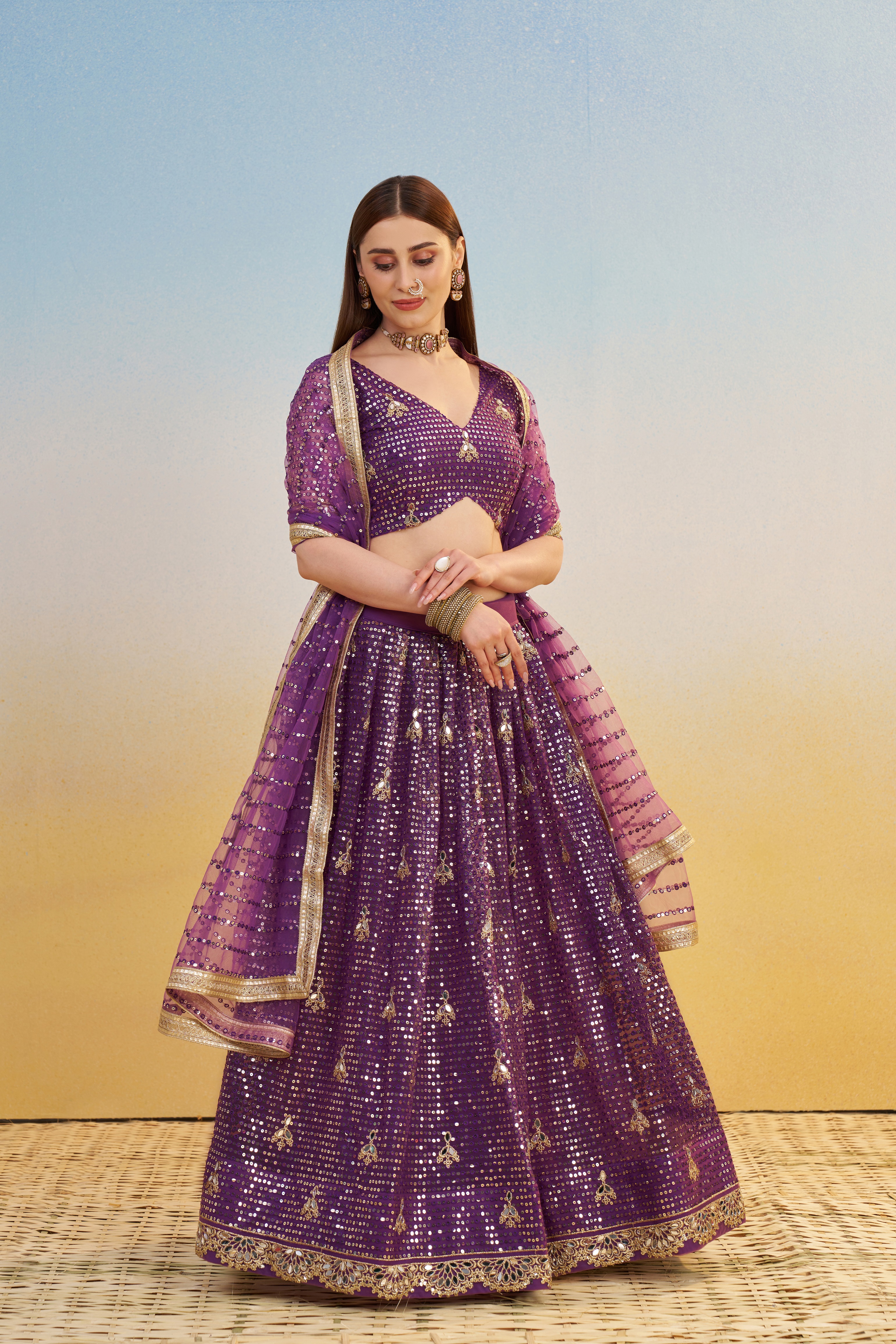 Designer Lehenga Choli Set with Dupatta Butterfly Net Fabric Tone To Tone Thread Work, Zari Work And Sequence Work Embroidery With Readymade Fancy Lace for Women – Darkpurple Color