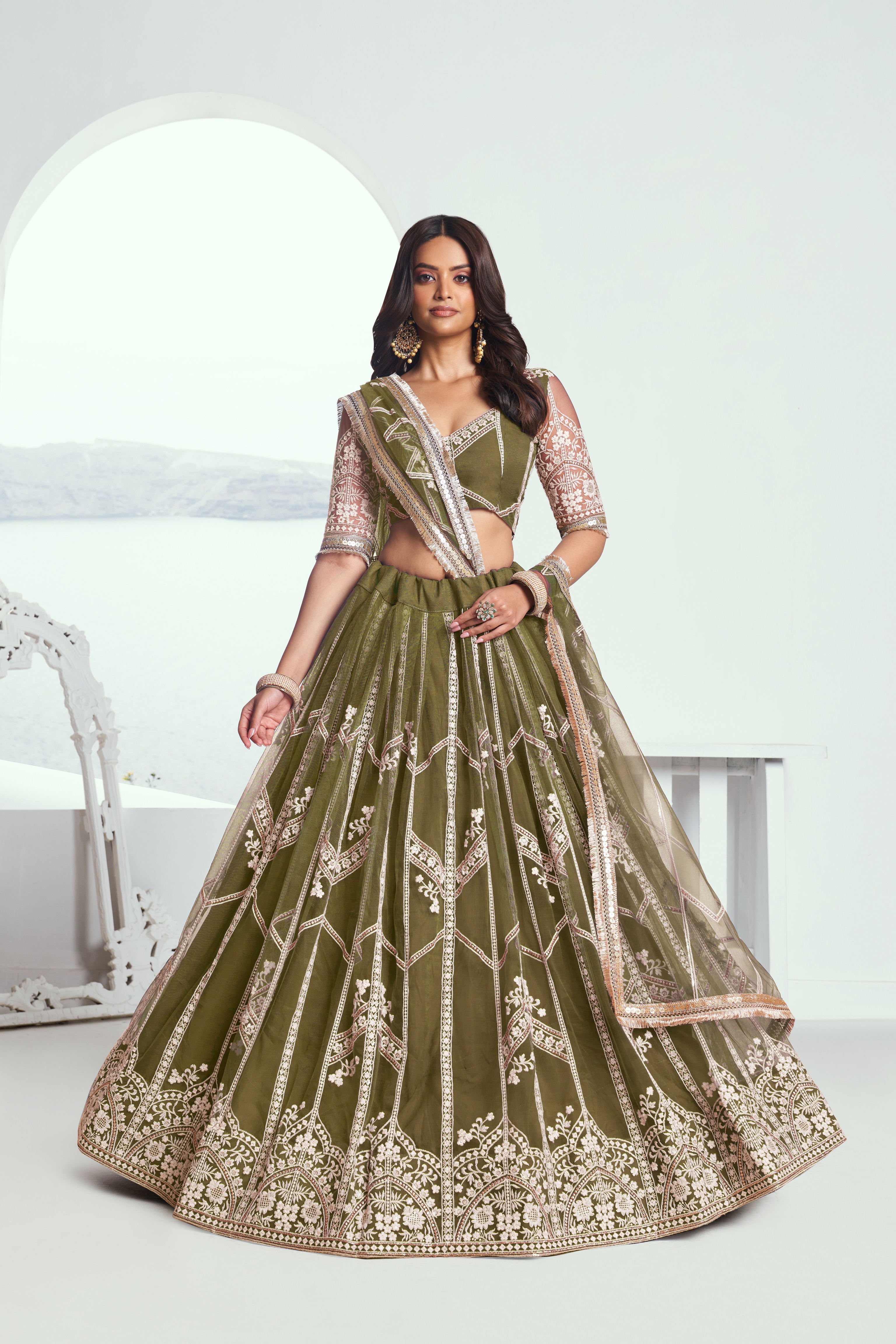 Designer Lehenga Choli Set with Dupatta Butterfly Net Fabric Zari Work And Sequence Work Embroidery for Women – Mehandigreen Color