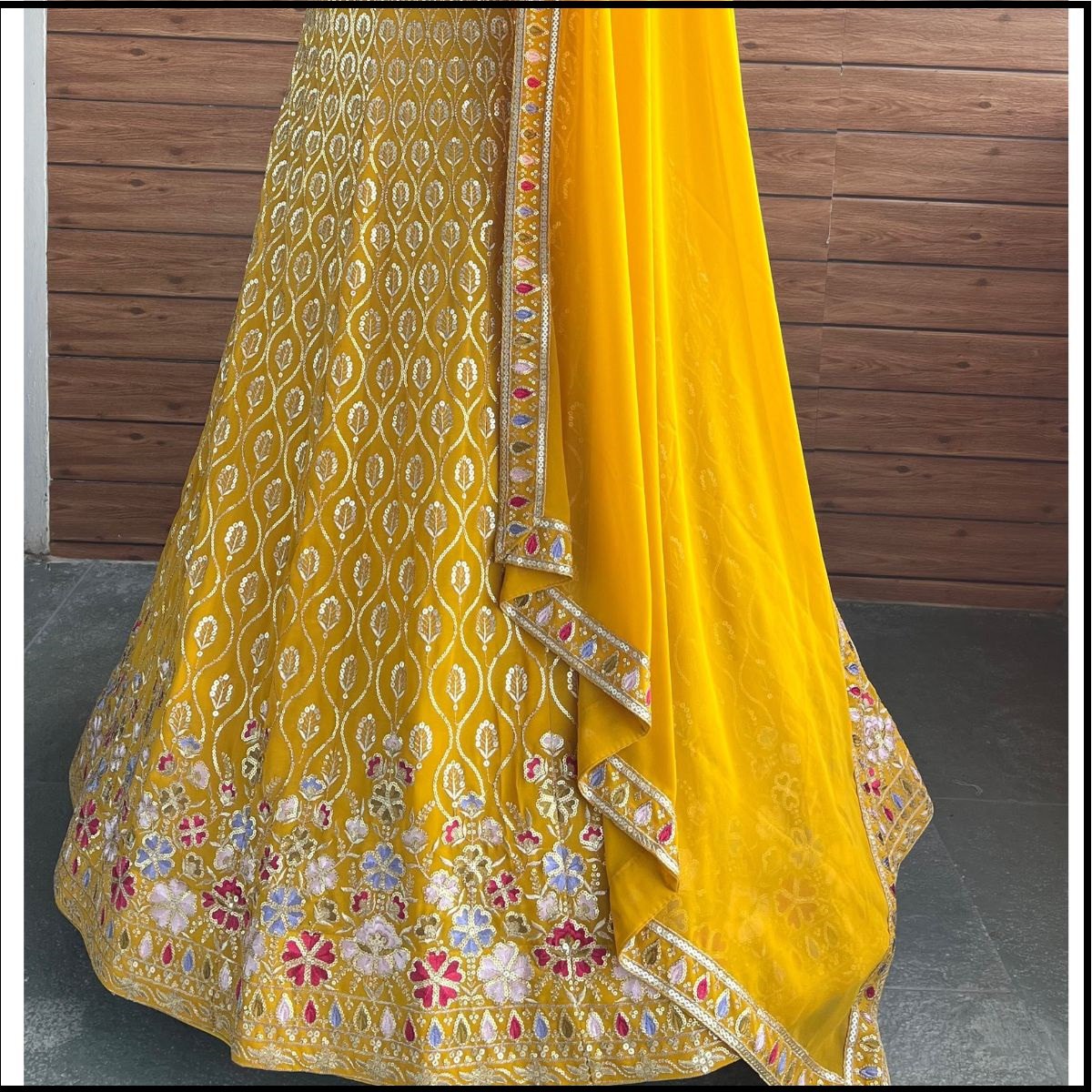 LEHENGA(BOTTOM), FABRIC:- FAUX GEORGETTE, FLAIR:- 3.5 METER, INNER:- MICRO, WORK:- THREAD AND SEQUENCE EMBROIDERY WORK, STITCH:- SEMI STITCHED (WITH PREMUIM CANCAN AND CANVAS), SIZE:- 42HEIGHT AND 42 TO 44 WAIST, CHOLI(TOP), FABRIC:- FAUX GEORGETTE, BLOUSE SIZE:- 1 METER FABRIC (BUST SIZE UPTO 46 INCHES), WORK:- THREAD AND SEQUENCE EMBROIDERY WORK, STITCH:- UN STITCHED FABRIC, (IT MAY HAVE MINOR DIFFERENCE IN WORK SIZE DUE TO STOCK CHANGES), DUPATTA, FABRIC:- FAUX GEORGETTE, WORK:- THREAD AND SEQUENCE EMBROIDERY WORK WITH LACE BORDER WORK, SIZE:- 2.50 METER DUPATTA, STITCH:- FULL STITCHED, ADDITIONAL, WASH CARE: - DRY CLEAN ONLY, COLOR: - PRODUCT COLOR MAY SLIGHTLY VARY DUE TO PHOTOGRAPHIC LIGHTNING SOURCES OR YOUR DEVICE DISPLAY SETTINGS, THESE ARE MADE TO ORDER DESIGNER STYLES, HENCE EXPECT A SLIGHT VARIATION FROM THE IMAGE DISPLAYED.