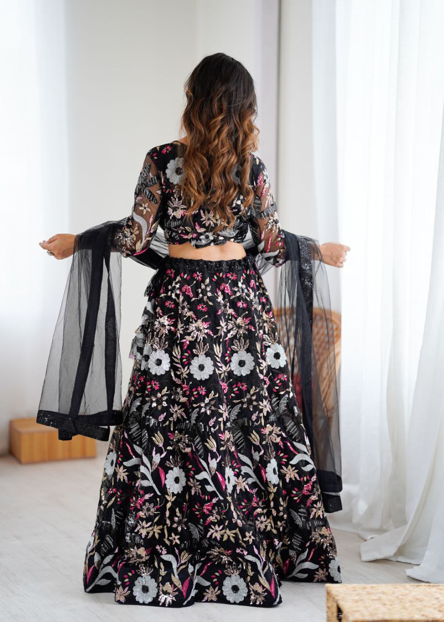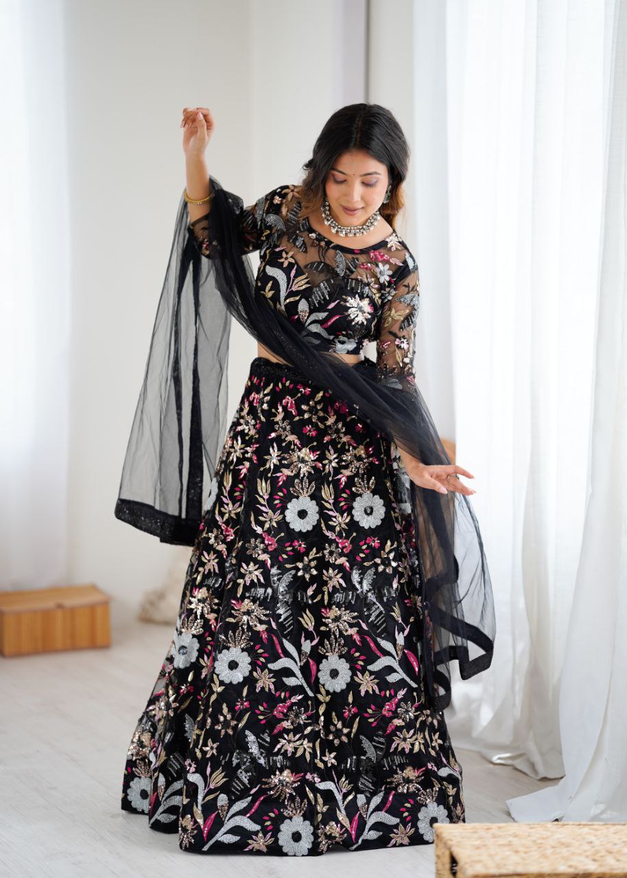 Lehenga : Premium Butterfly Net Lehenga Embellished With Beautiful Heavy Thread Embroidery Work With Heavy Four Sequins Work All Over With Heavy Cancan And Canvas With Double Inner Covering With 3.5 Mtr Flair( Semi Stitched. )Blouse : Premium Butterfly Net Embellished With Beautiful Heavy Thread Embroidery Work With Beautiful Four Sequins Work Both Side Work Front And Back WithWork sleeves With Satin Inner( Unstitched )Dupatta: Premium Butterfly Net Embellished With Beautiful Sequins Work Border Lace( 2.5 MTR ).