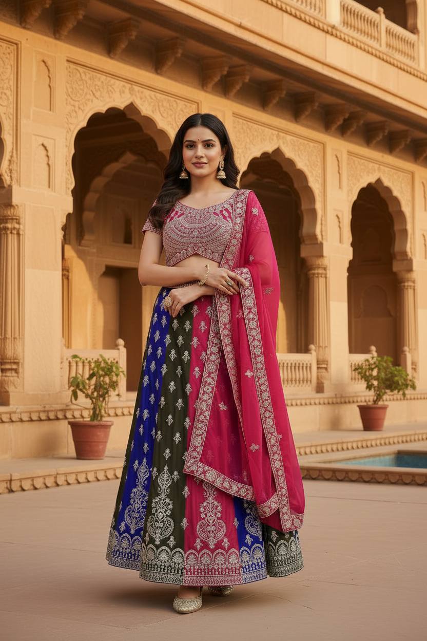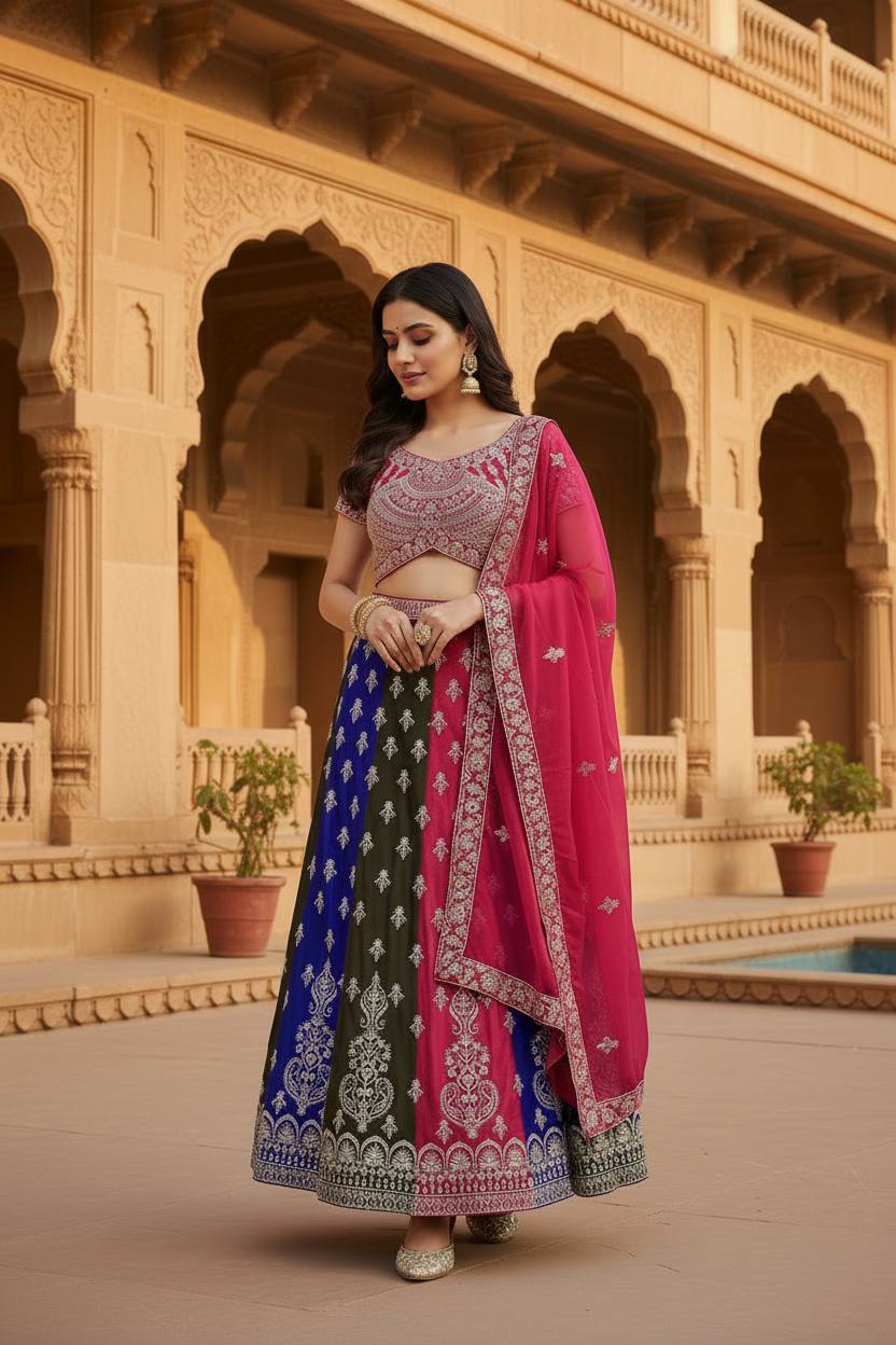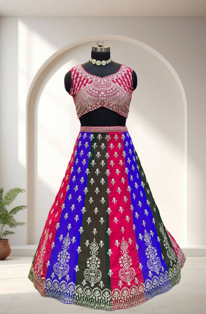 Radiance in every twirl this vibrant multy colours lehenga with intricate silver embroidery is pure festive elegance.