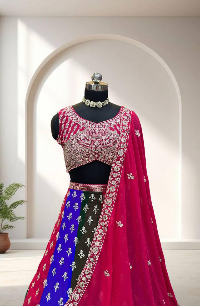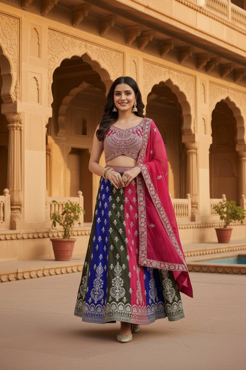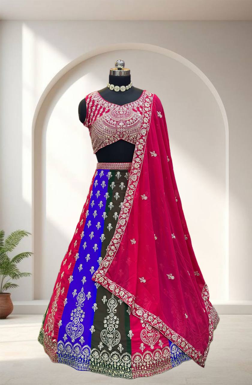Radiance in every twirl this vibrant multy colours lehenga with intricate silver embroidery is pure festive elegance.