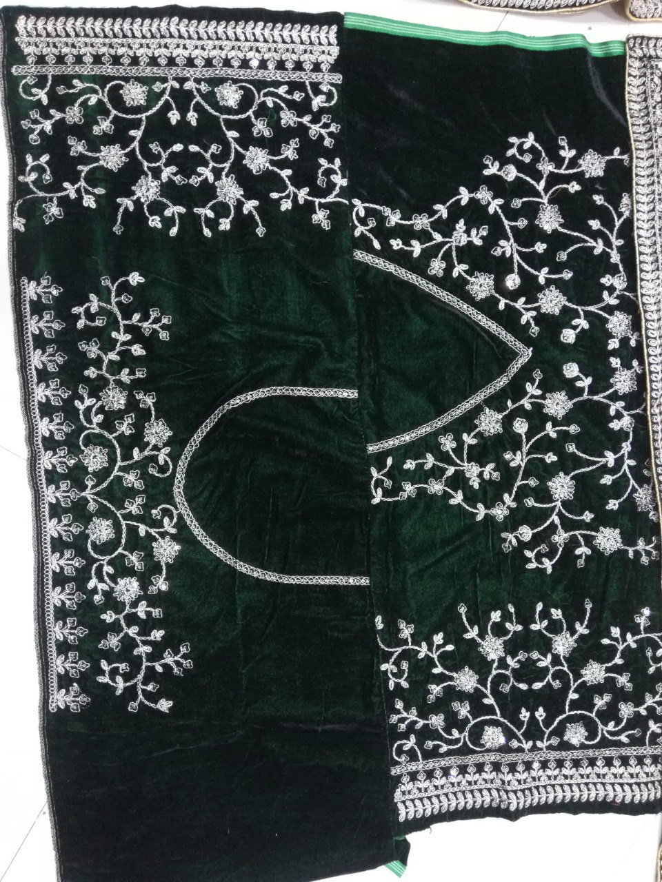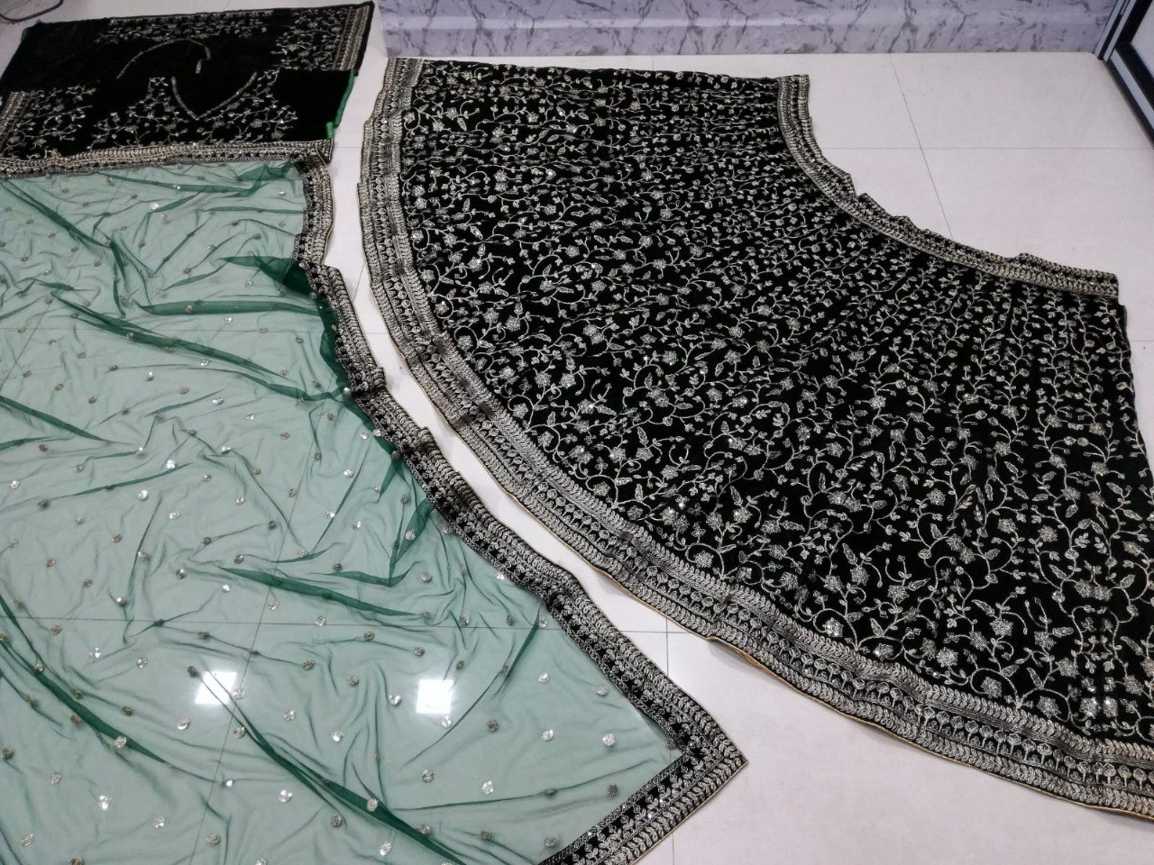 LEHENGA(BOTTOM)FABRIC:- 9000 VELVET FABRICINNER:- MICRO FABRICWORK:- 3MM SEQUINS WITH JARI AND CODDING DORI EMBROIDERY WORKSTITCH:- SEMI STITCHED WITH CANCAN AND CANVASSIZE:- 42 HEIGHT AND 42 WAIST FLAIR:- 3.00 TO 3.20 METERCHOLI(TOP)FABRIC:- 9000 VELVET FABRICSIZE:- 0.80 METER FABRICWORK:- 3MM SEQUINS WITH JARI AND CODDING DORI EMBROIDERY WORKSTITCH:- UN STITCHED FABRICEBROIDERY WORK SIZE:- FRONT HEIGHT-14 WIDTH-22, , BACK HEIGHT-14 WIDTH-22, , SLEVES HEIGHT-8 WIDTH-13.50DUPATTAFABRIC:- NETWORK:- 3MM SEQUINS WITH JARI AND CODDING DORI EMBROIDERY LACE BORDERWORKSIZE:- 2.25 METER DUPATTASTITCH:- FULL STITCHEDADDITIONALWASH CARE: - DRY CLEAN ONLYCOLOR: - PRODUCT COLOR MAY SLIGHTLY VARY DUE TO PHOTOGRAPHIC LIGHTNING SOURCES OR YOUR DEVICE DISPLAY SETTINGSTHESE ARE MADE TO ORDER DESIGNER STYLES, HENCE EXPECT A SLIGHT VARIATION FROM THE IMAGE DISPLAYEDIN THE BOX 1 PIECE LEHENGA 1 PIECE DUPATTA 1 PIECE BLOUSE FABRIC.