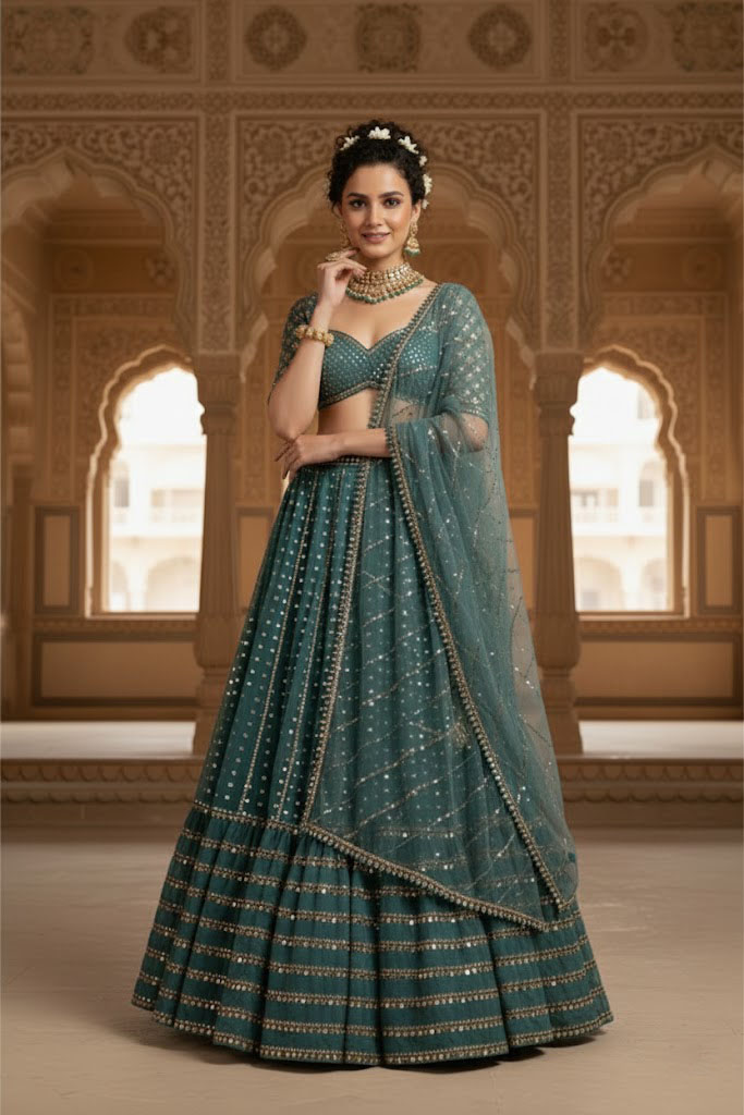 LEHNGA(BOTTOM): -FABRIC: - FAUX GEORGETTEINNER: - MICRO FABRICWORK: - 3MM, 5MM AND 9MM SEQUINS WITH ZARI EMBROIDERY WORKSTITCH: - SEMI STITCHED WITH CANCAN AND CANVASSIZE: - 42 HEIGHT AND 42 WAIST FLAIR: - 4 METERCHOLI(TOP): -FABRIC: - FAUX GEORGETTESIZE: - 0.70 METER CHOLI ALLOVER EMBOIDERED FABRIC 0.40 METER SLEEVES ALLOVER EMBROIDERED FABRICWORK: - 5MM SEQUINS EMBROIDERY WORK IN BLOUSE, 3MM, 5MM AND 9MM SEQUINS EMBROIDERY WORK IN SLEEVES STITCH: - UNSTITCHED FABRICDUPATTA: -FABRIC: - NETWORK: - 5MM, 9MM SEQUENCE AND JARI EMBROIDERY WORK SIZE: - 2.25 METER DUPATTASTITCH: - FULL STITCHADDITIONALWASH CARE: - DRY CLEAN ONLYCOLOR: - PRODUCT COLOR MAY SLIGHTLY VARY DUE TO PHOTOGRAPHIC LIGHTNING SOURCES OR YOUR DEVICE DISPLAY SETTINGSTHESE ARE MADE TO ORDER DESIGNER STYLES, HENCE EXPECT A SLIGHT VARIATION FROM THE IMAGE DISPLAYEDIN THE BOX 1 LEHENGA 1 DUPATTA 0.70 METER BLOUSE FABRIC 0.40 METER SLEEVES FABRIC (1 SET OF HAND MADE TASSELS)ALTERNATIVEHANDMADE TASSELS MAY DIFFER FROM THE PHOTOS AND VIDEOS. TASSELS WILL BE AVAILABLE AS LONG AS THE CURRENT STOCK LASTS. ALTERNATIVELY, NEW STOCK MAY TAKE SOME TIME TO ARRIVE. WE ARE NOT STRICTLY BOUND TO PROVIDE TASSELS.