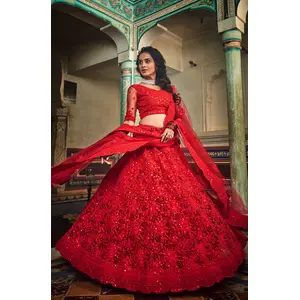 Womens Red Net Sequience Work Lehenga...