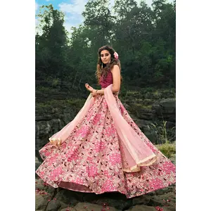 Womens Pink Net Zari Work Lehenga Set