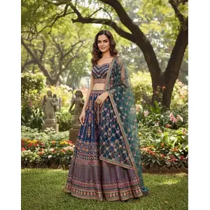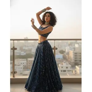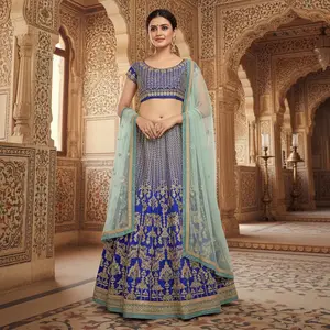 Blue Embroidered Chinon Lehenga Set