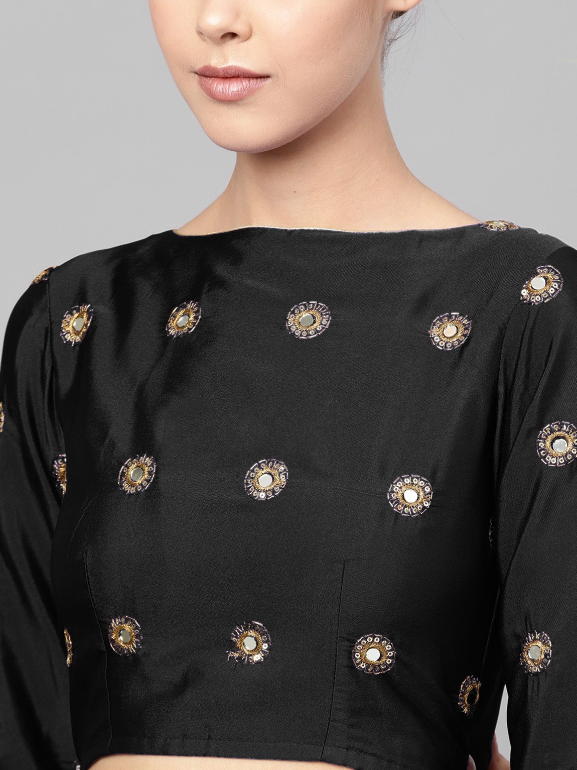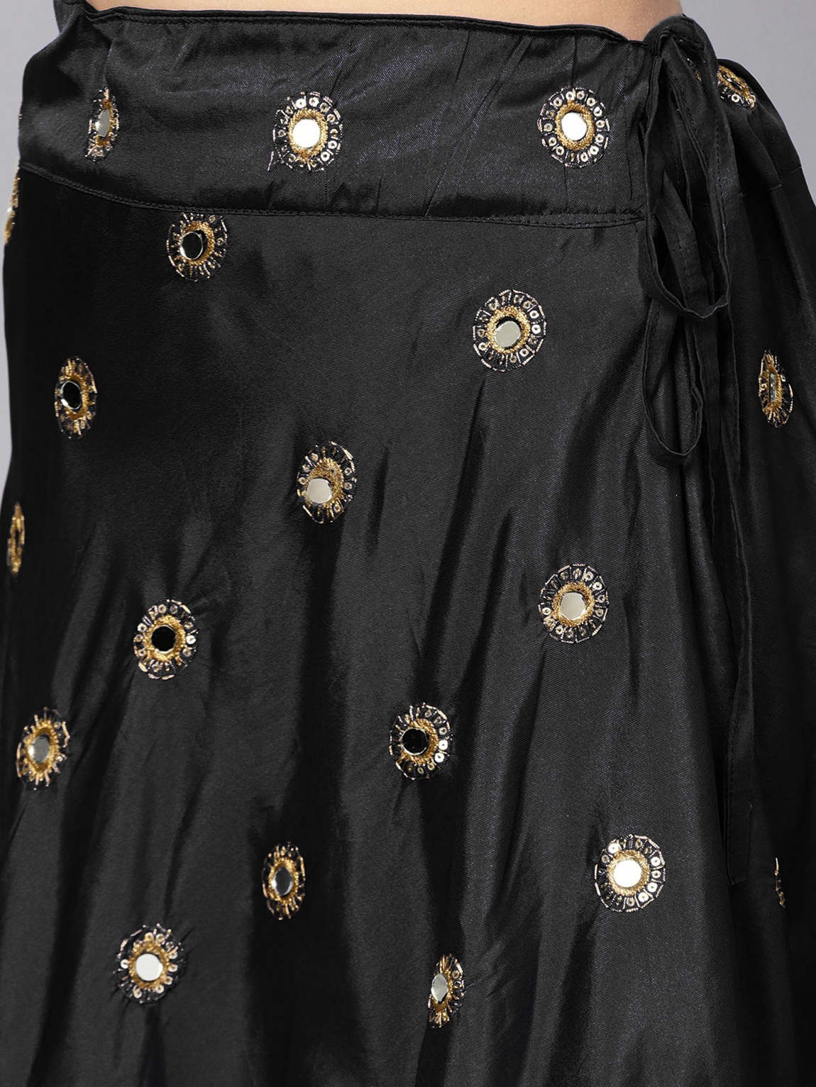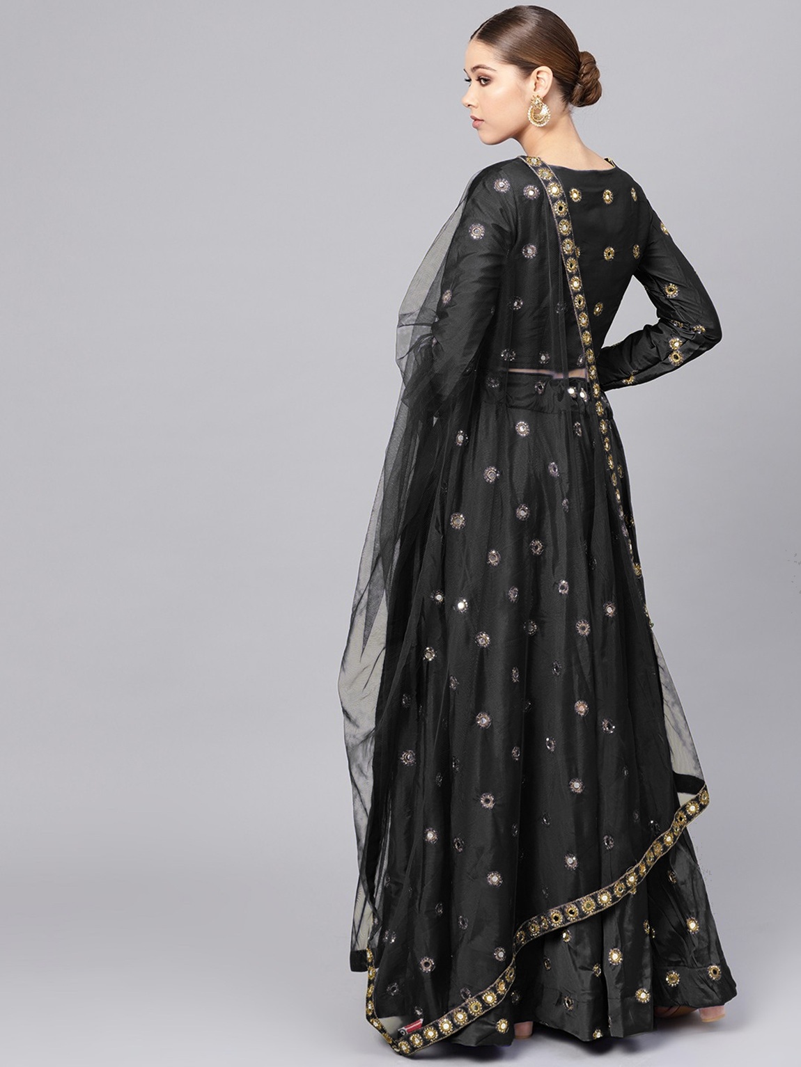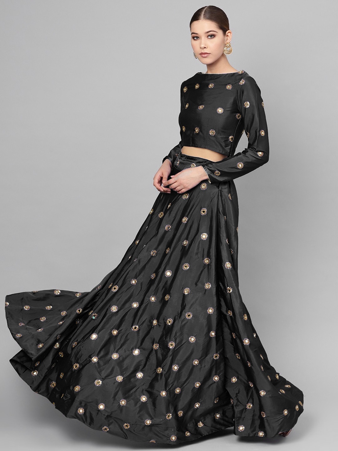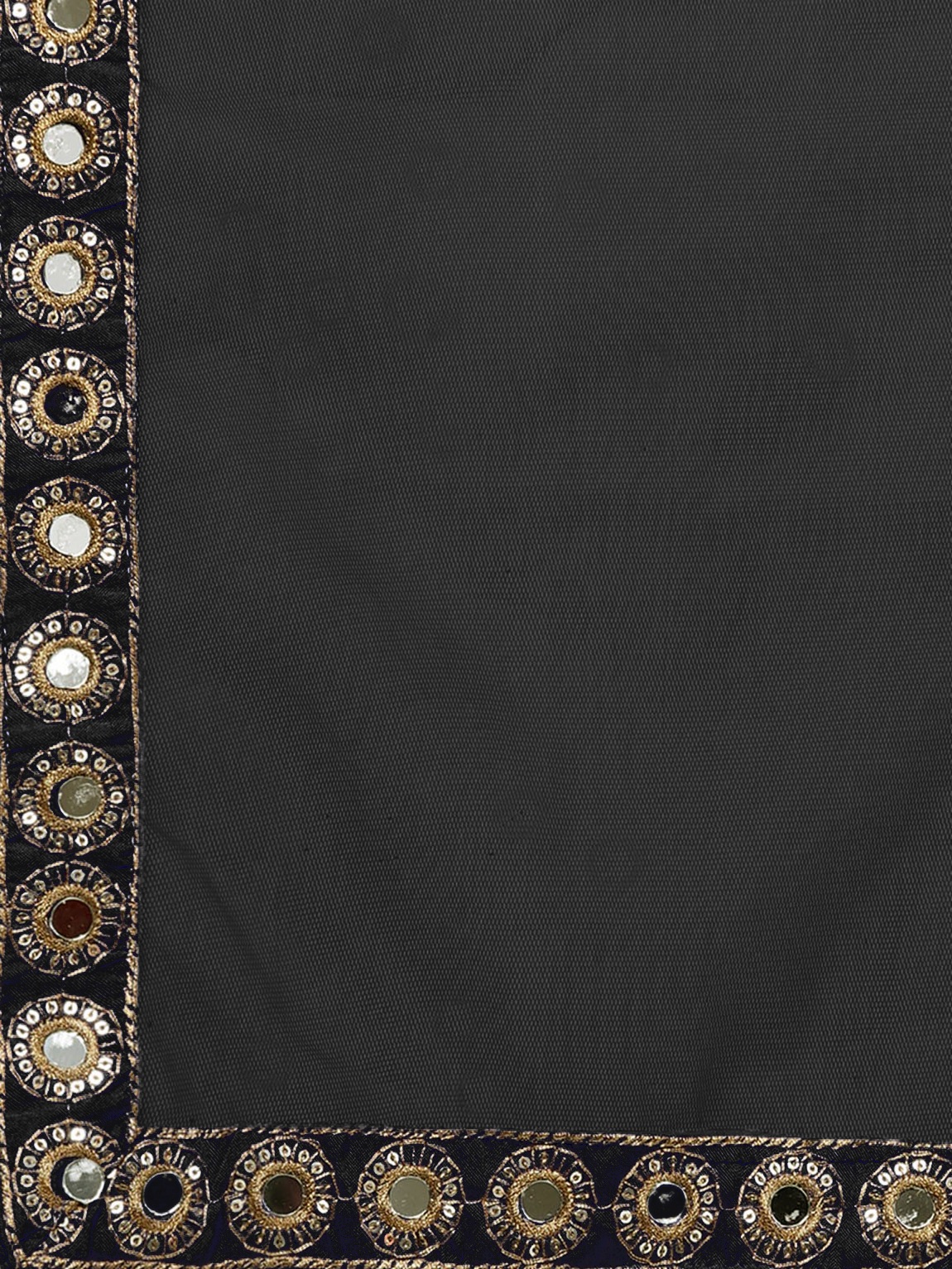 Elevate your ethnic look with this black taffeta lehenga featuring mirror work. Designed for festive occasions and celebrations, it offers a graceful flow and timeless appeal.Crafted from lightweight taffeta fabric with a semi-stitched finish, this lehenga ensures comfort and easy customization. Dry clean recommended.