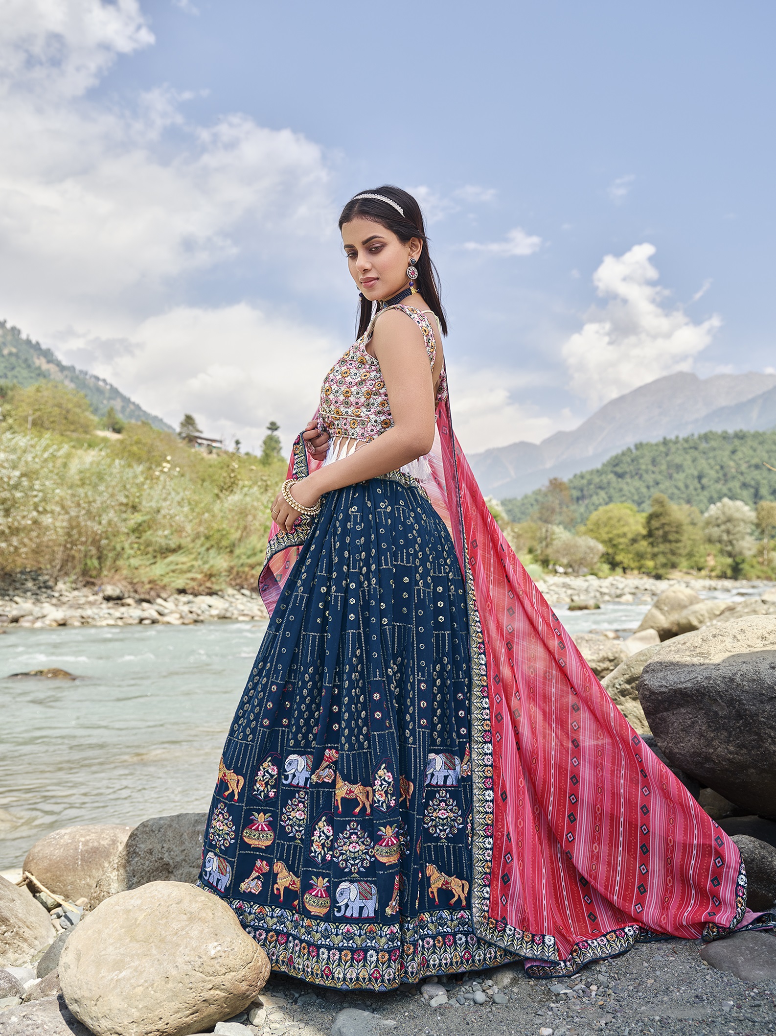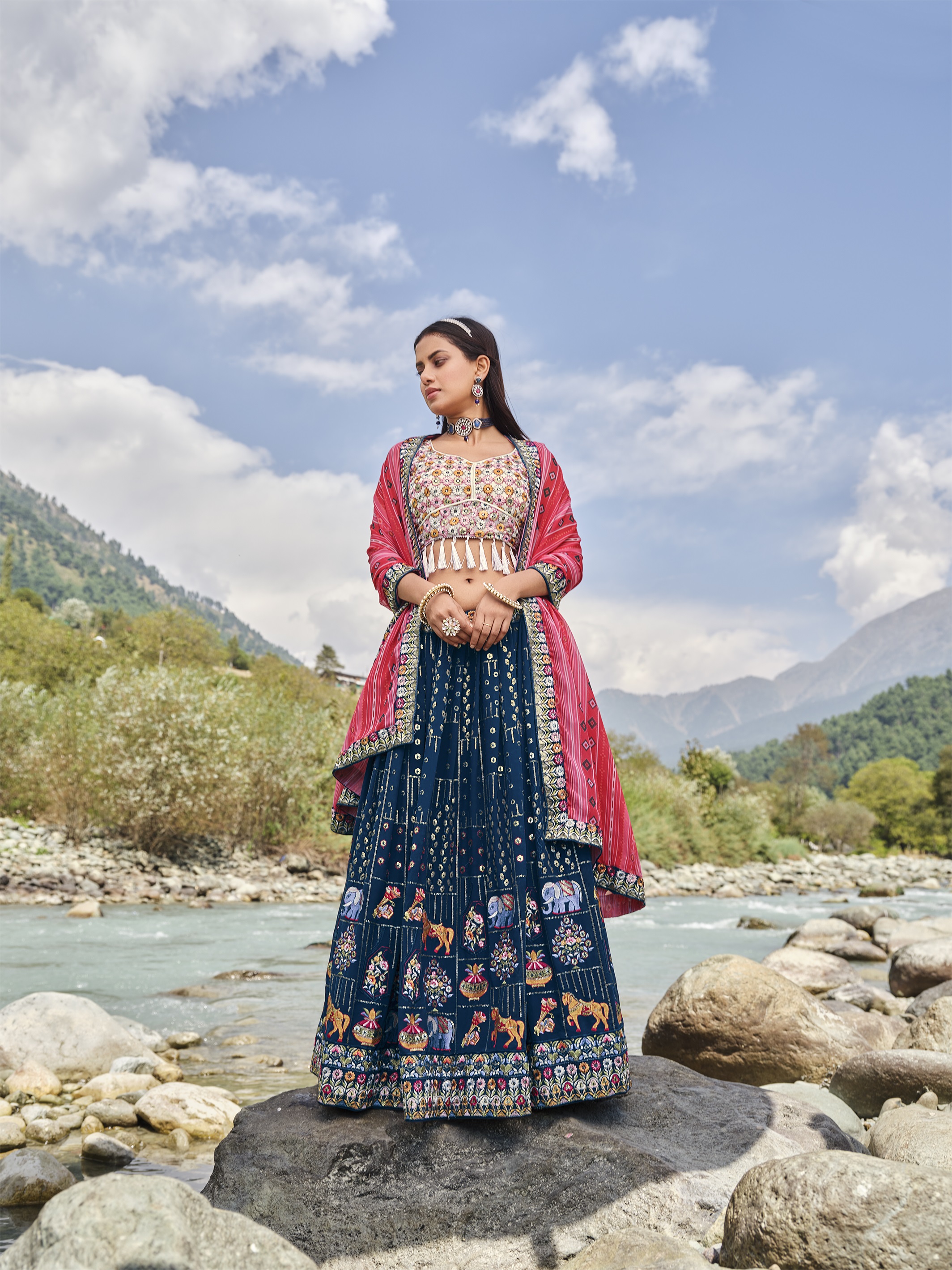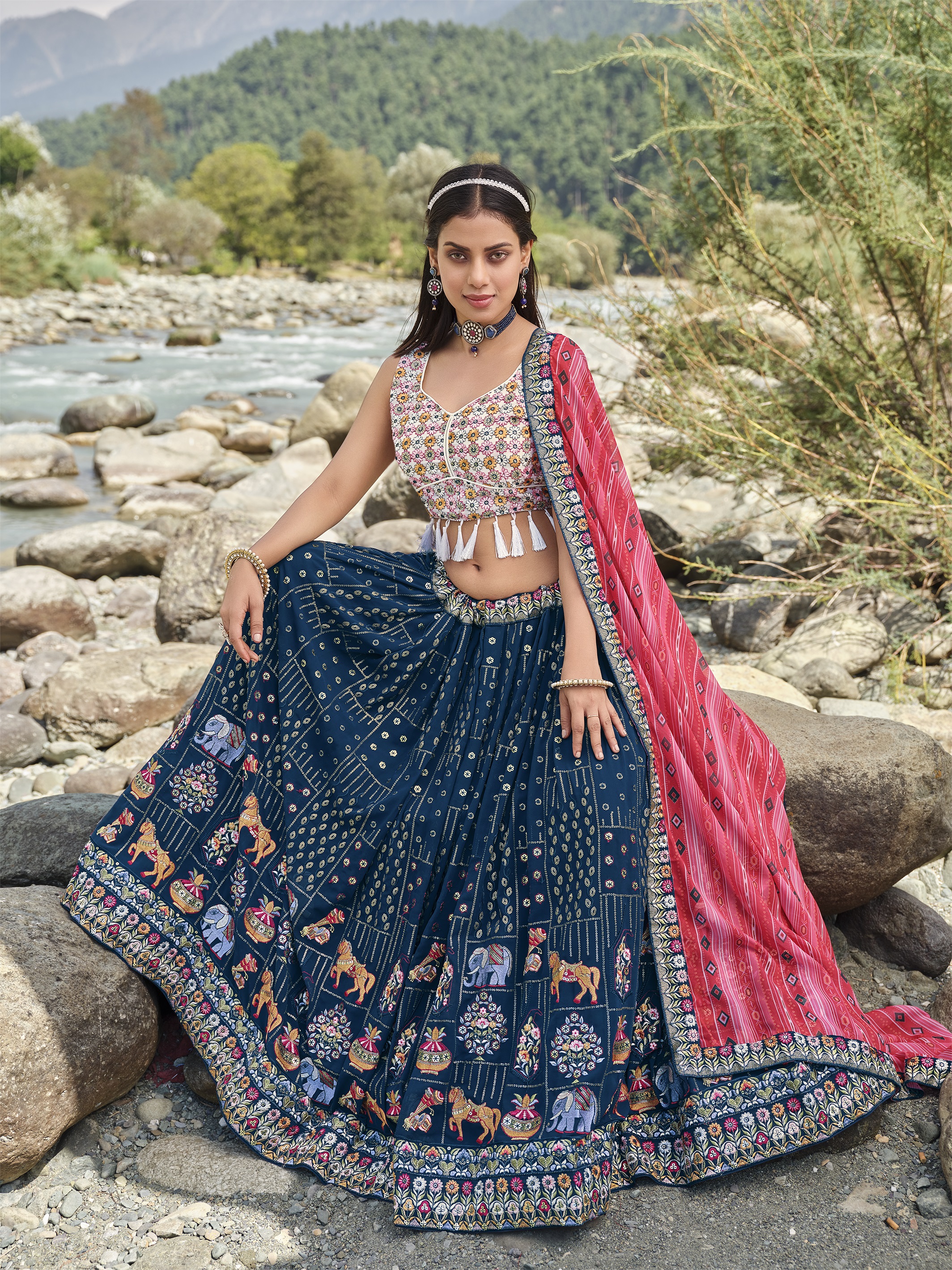 Elevate your ethnic look with this blue faux georgette lehenga featuring thread embroidery work. Designed for festive occasions and celebrations, it offers a graceful flow and timeless appeal.Crafted from lightweight faux georgette fabric with a semi-stitched finish, this lehenga ensures comfort and easy customization. Dry clean recommended.
