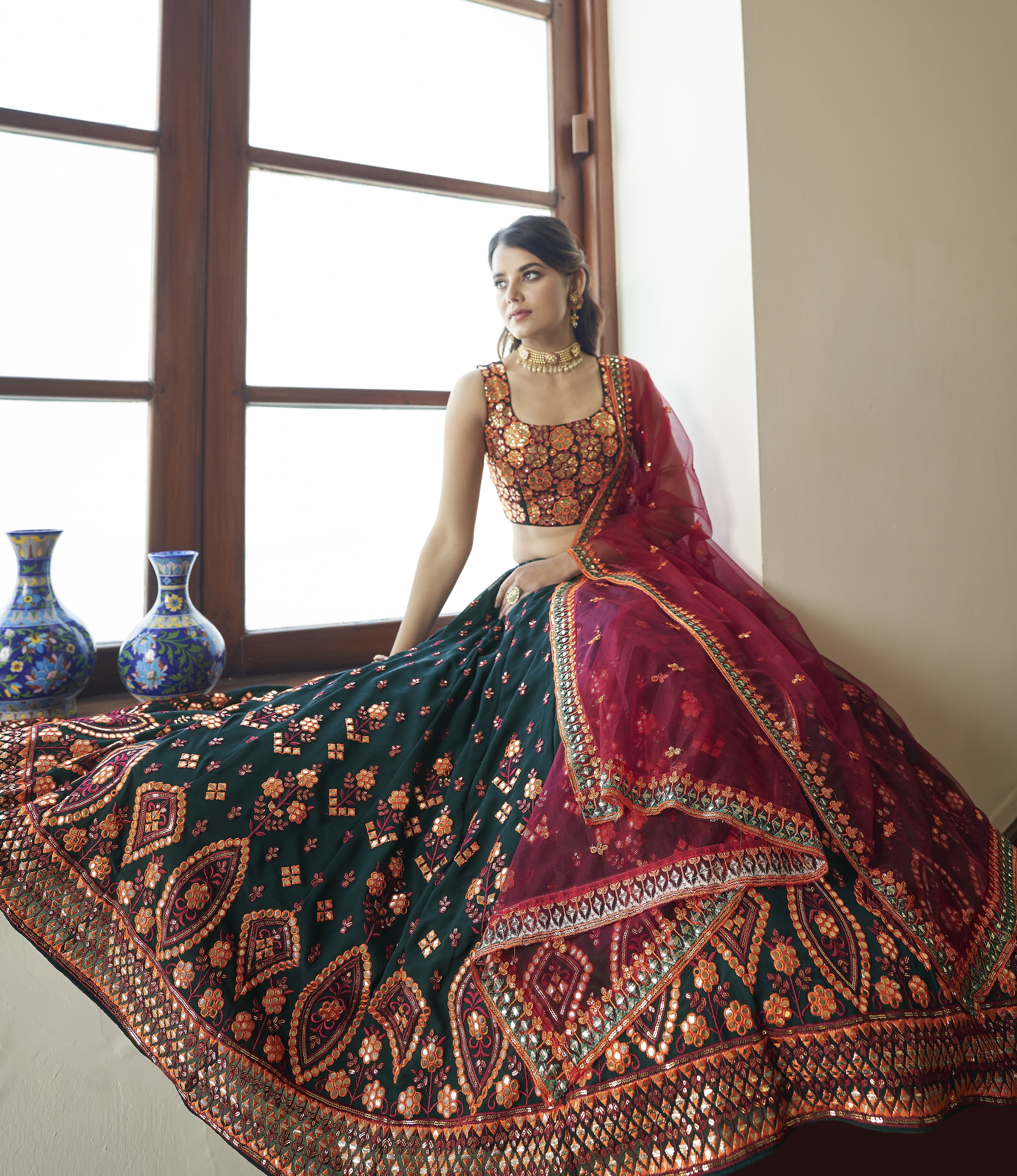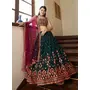 Elevate your ethnic look with this dark green faux georgette lehenga featuring thread embroidery work. Designed for festive occasions and celebrations, it offers a graceful flow and timeless appeal.Crafted from lightweight faux georgette fabric with a semi-stitched finish, this lehenga ensures comfort and easy customization. Dry clean recommended.