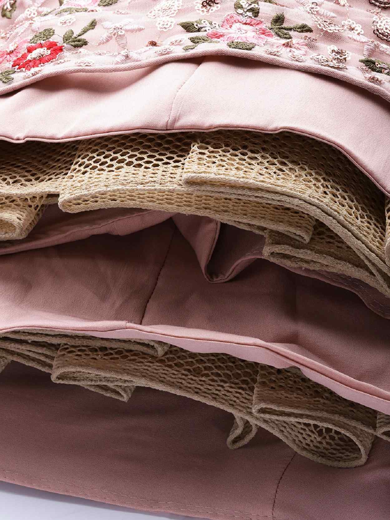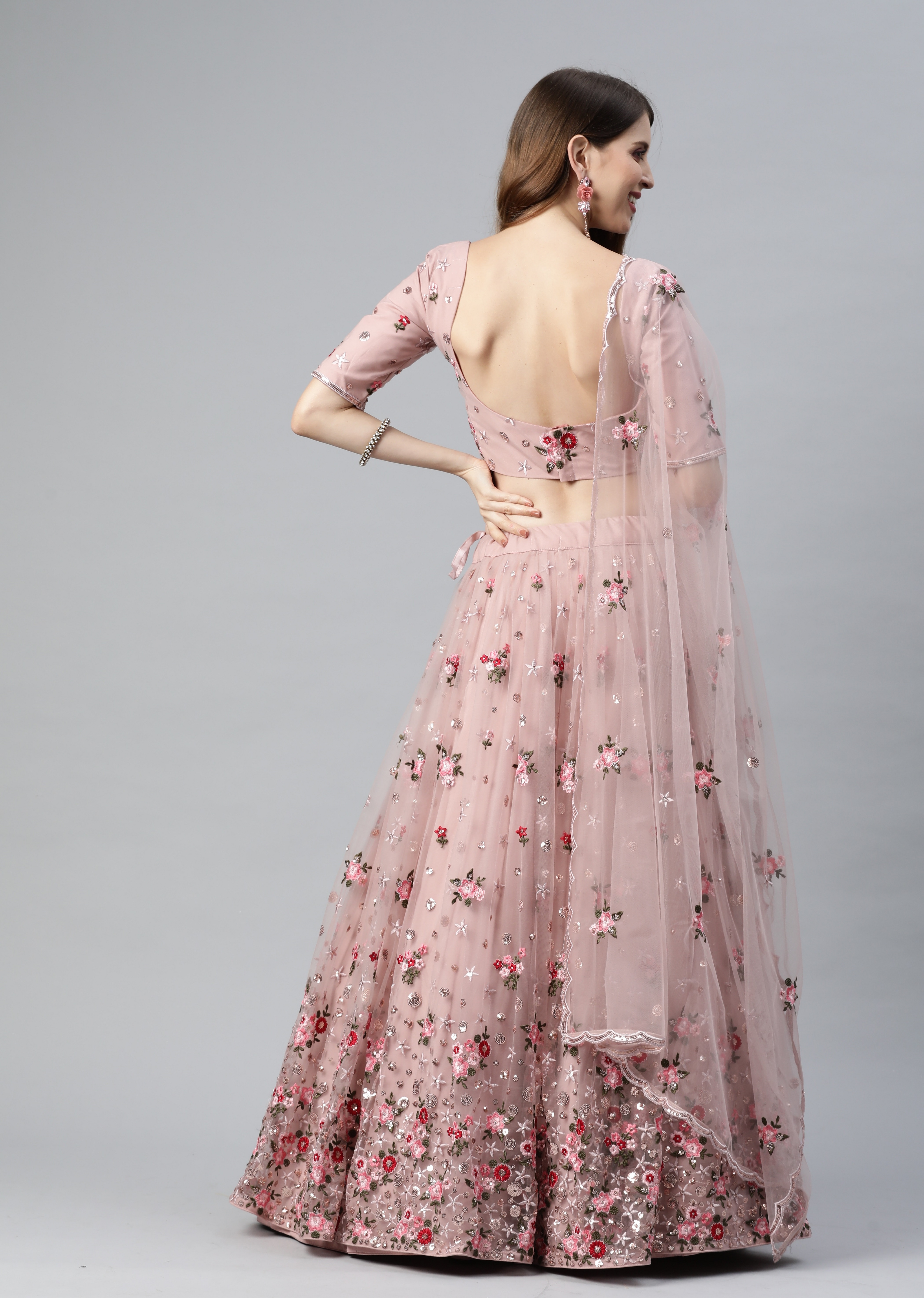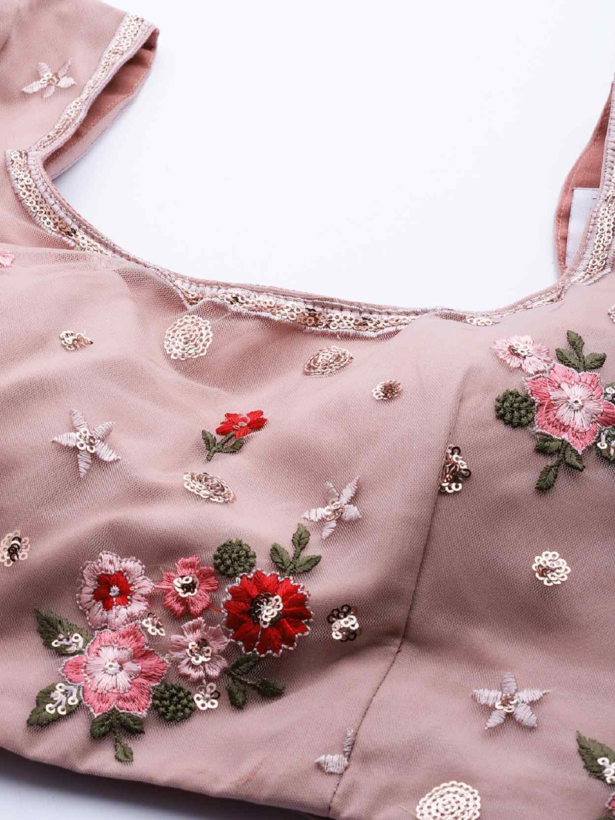 Elevate your ethnic look with this dusty pink net lehenga featuring thread embroidery work. Designed for festive occasions and celebrations, it offers a graceful flow and timeless appeal.Crafted from lightweight net fabric with a semi-stitched finish, this lehenga ensures comfort and easy customization. Dry clean recommended.