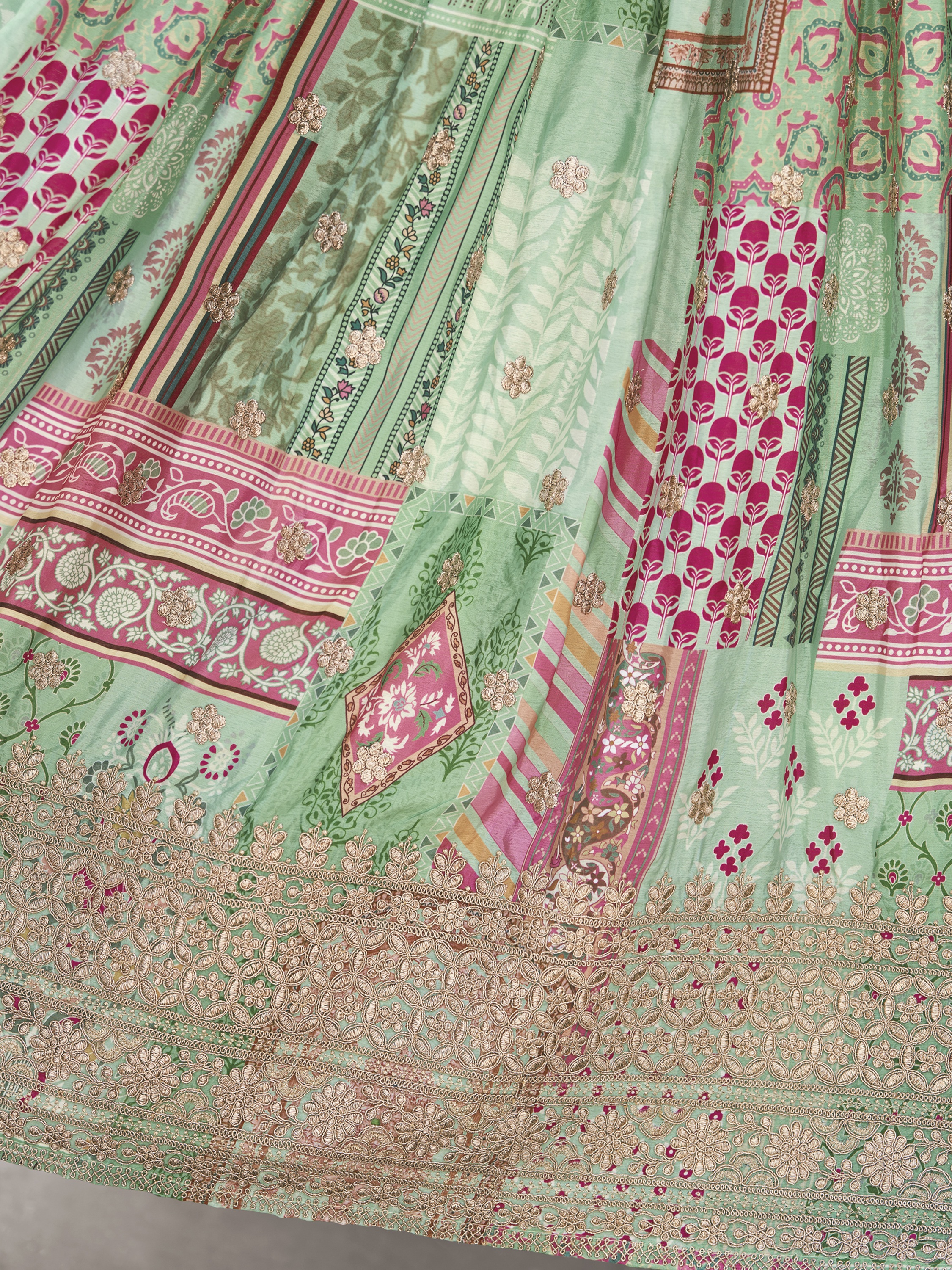 Elevate your ethnic look with this green chinnon lehenga featuring dori embroidery work. Designed for festive occasions and celebrations, it offers a graceful flow and timeless appeal.Crafted from lightweight chinnon fabric with a semi-stitched finish, this lehenga ensures comfort and easy customization. Dry clean recommended.