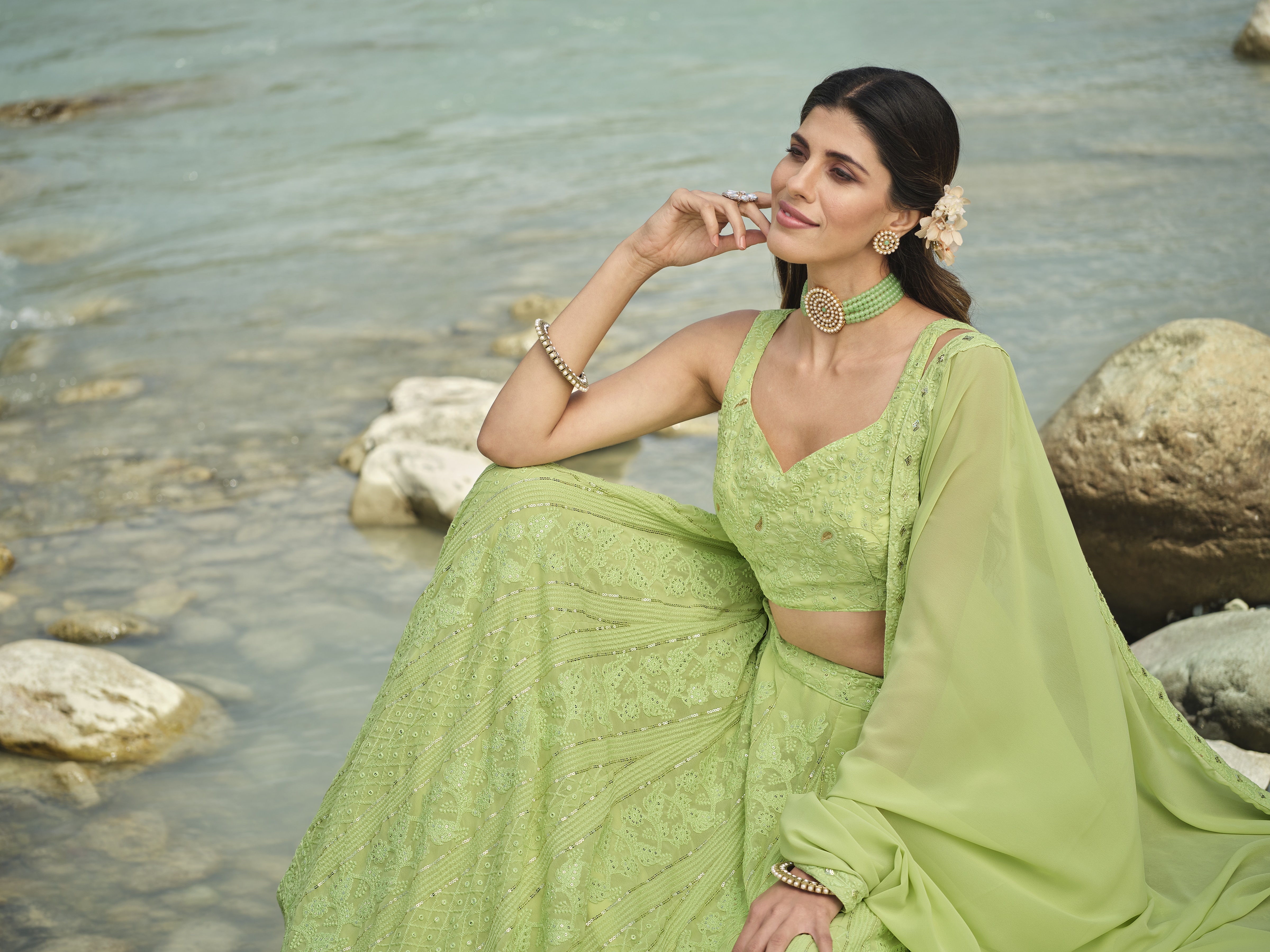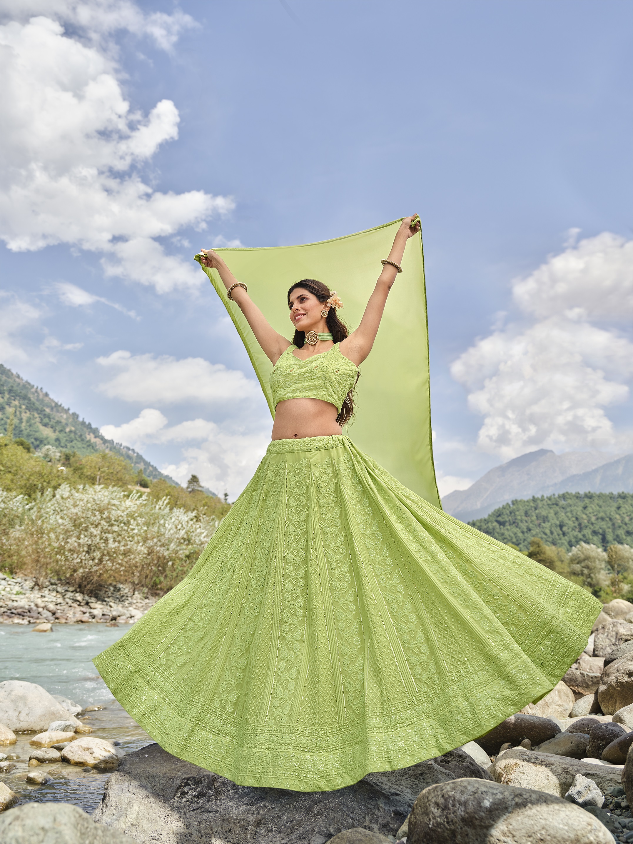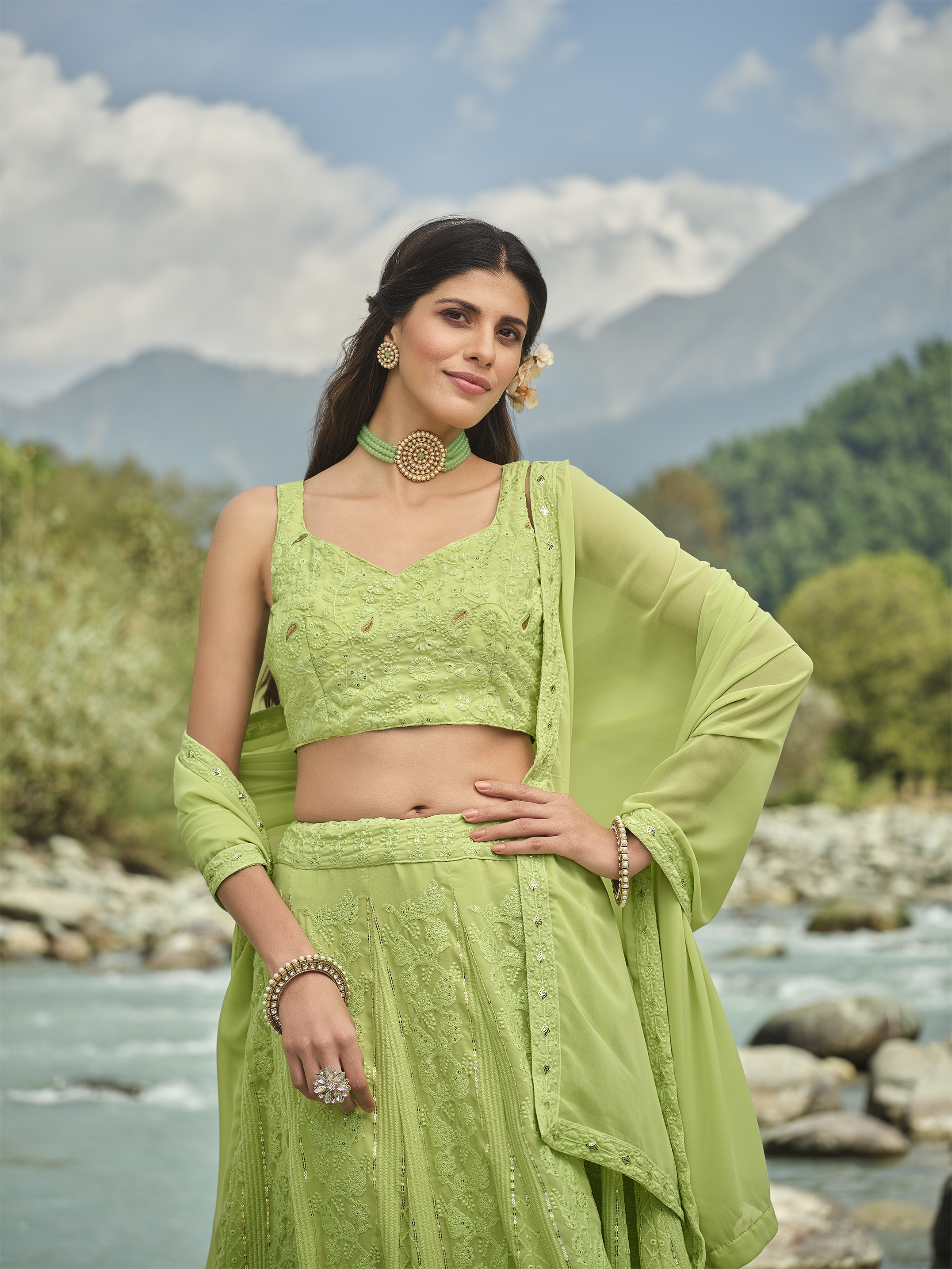 Elevate your ethnic look with this light green faux georgette lehenga featuring thread embroidery work. Designed for festive occasions and celebrations, it offers a graceful flow and timeless appeal.Crafted from lightweight faux georgette fabric with a semi-stitched finish, this lehenga ensures comfort and easy customization. Dry clean recommended.