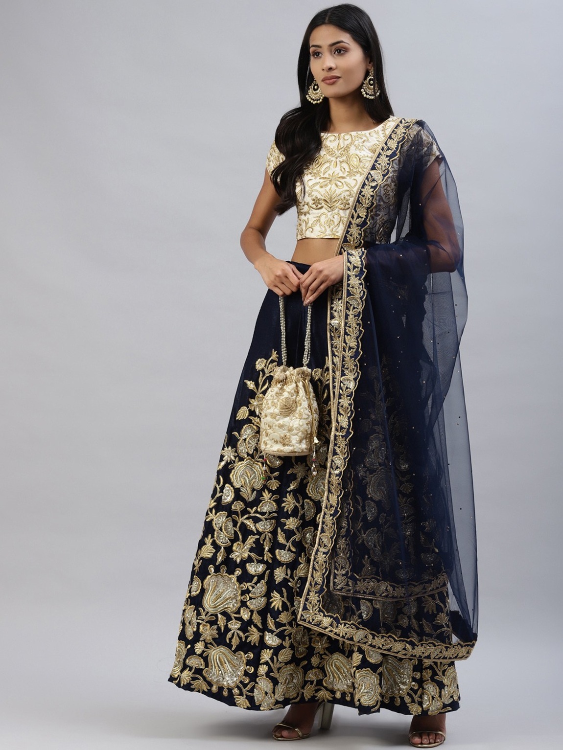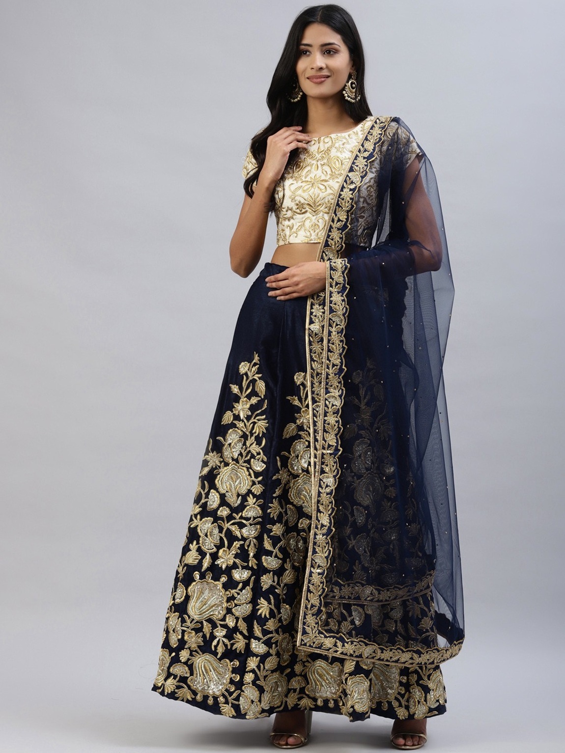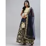 Elevate your ethnic look with this navy blue velvet lehenga featuring embroidered work. Designed for festive occasions and celebrations, it offers a graceful flow and timeless appeal.Crafted from lightweight velvet fabric with a semi-stitched finish, this lehenga ensures comfort and easy customization. Dry clean recommended.