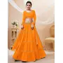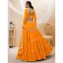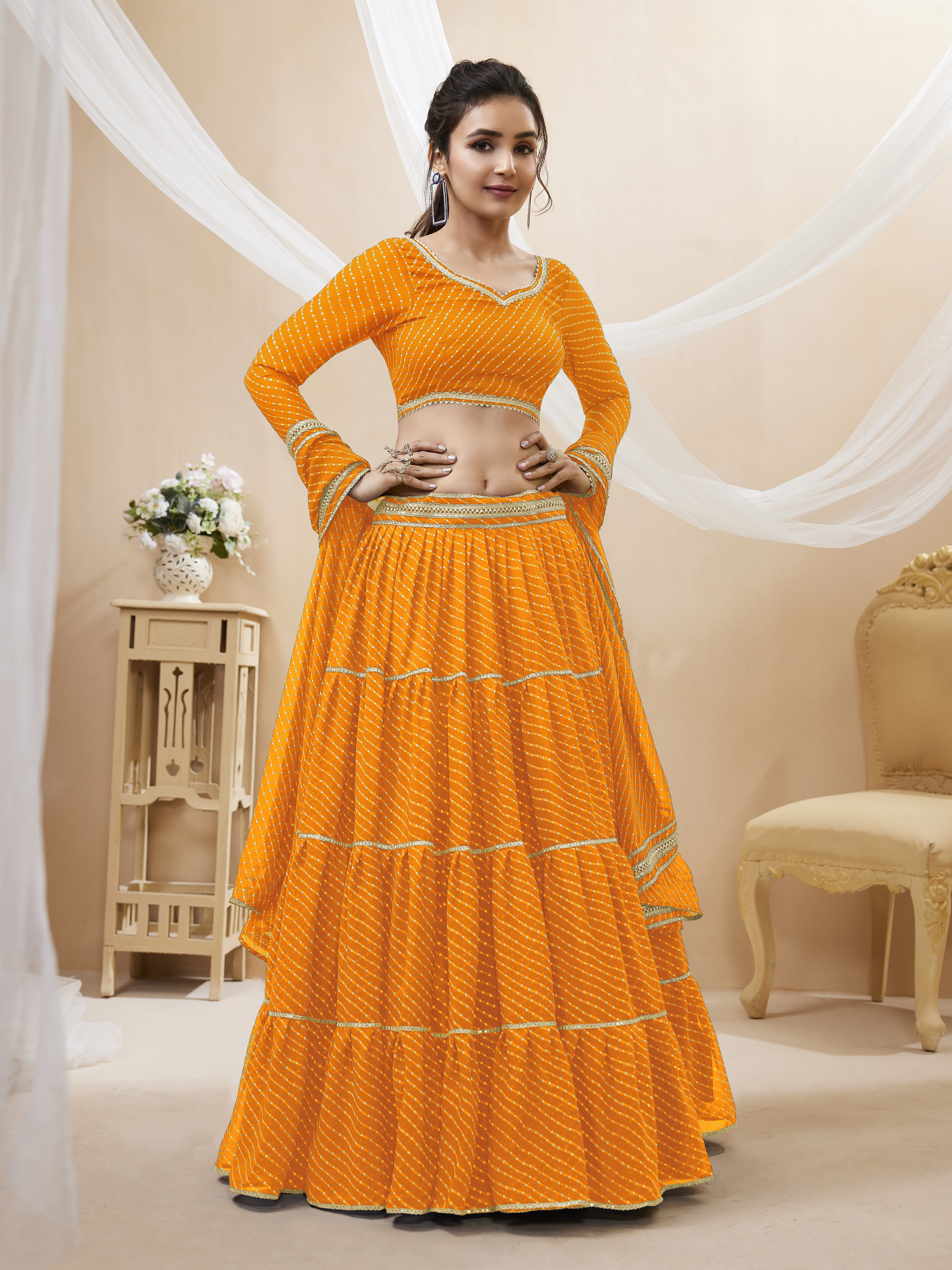 Elevate your ethnic look with this orange georgette lehenga featuring lehariya work. Designed for festive occasions and celebrations, it offers a graceful flow and timeless appeal.Crafted from lightweight georgette fabric with a semi-stitched finish, this lehenga ensures comfort and easy customization. Dry clean recommended.