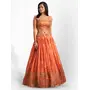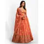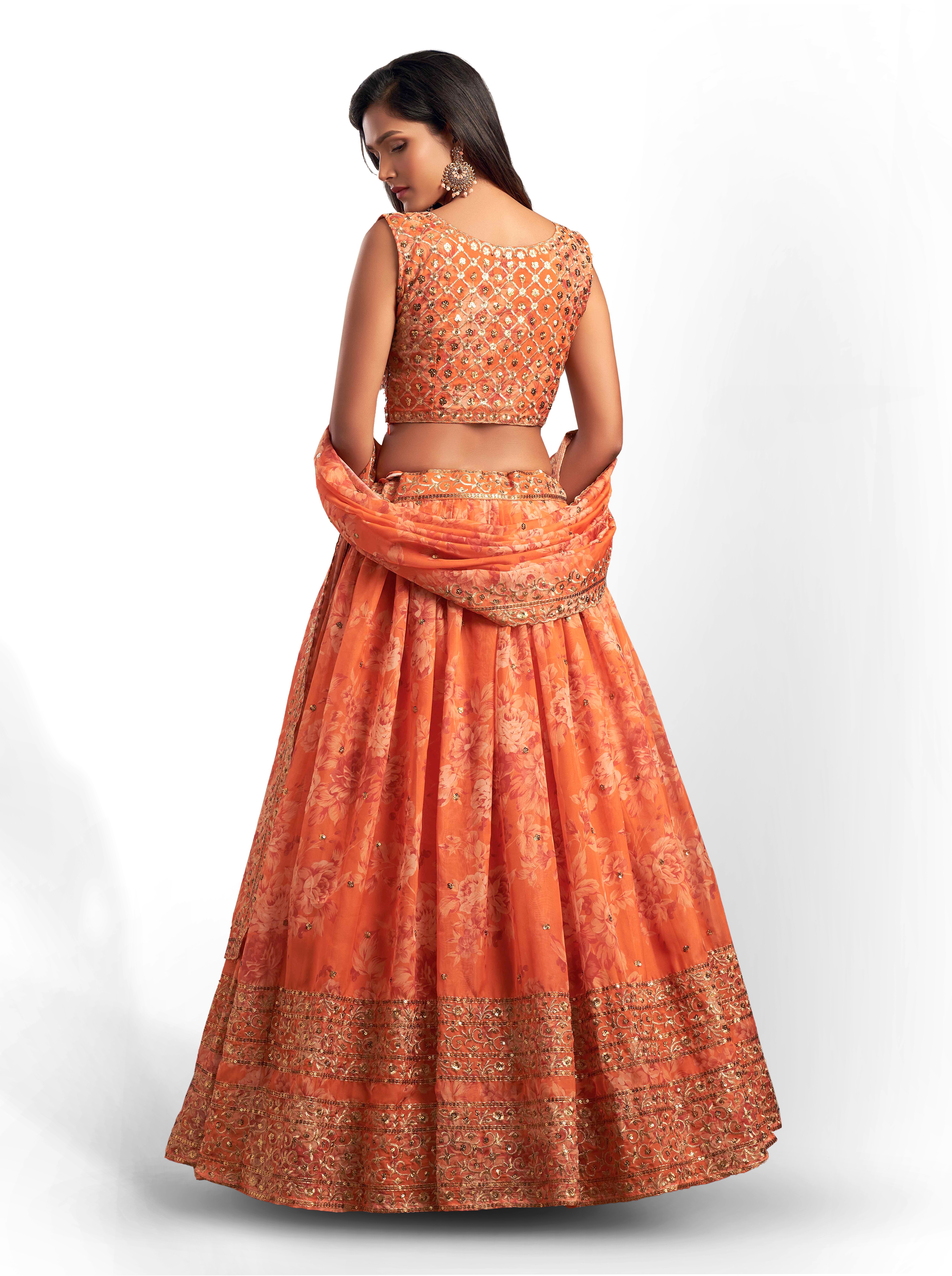 Elevate your ethnic look with this orange organza lehenga featuring sequence work,floral work embroidery work. Designed for festive occasions and celebrations, it offers a graceful flow and timeless appeal.Crafted from lightweight organza fabric with a semi-stitched finish, this lehenga ensures comfort and easy customization. Dry clean recommended.