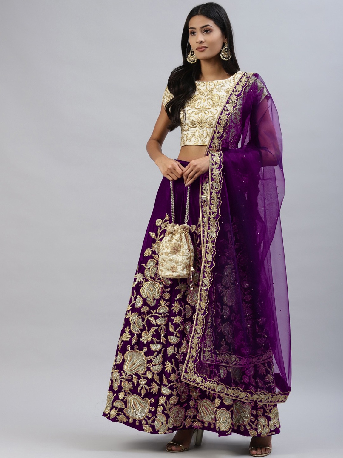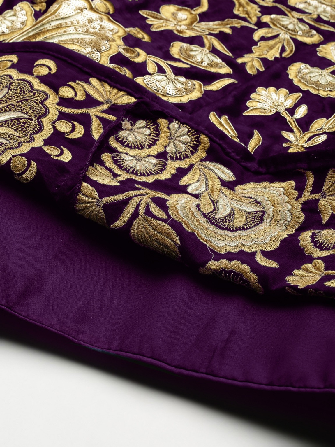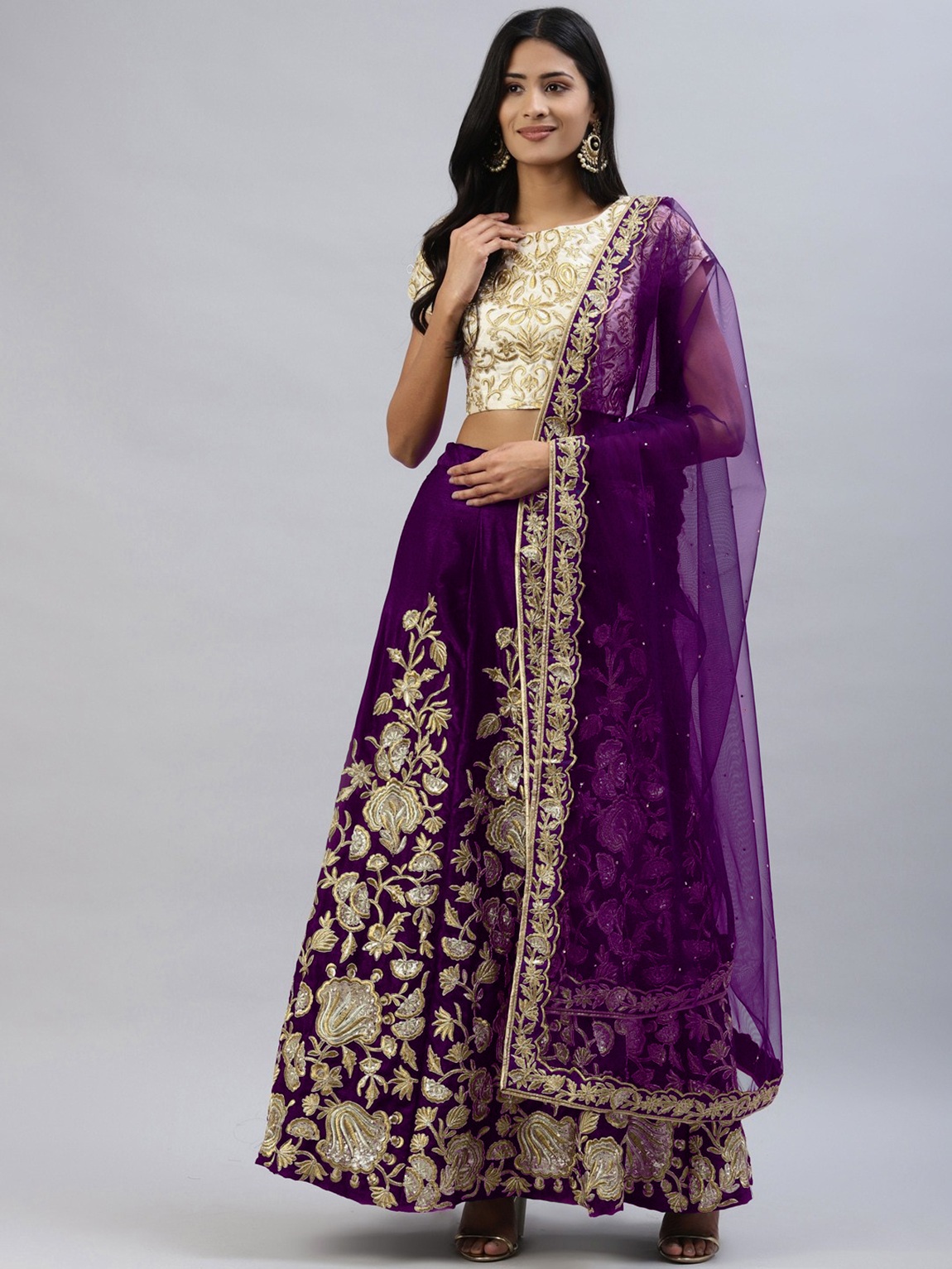 Elevate your ethnic look with this purple velvet lehenga featuring embroidered work. Designed for festive occasions and celebrations, it offers a graceful flow and timeless appeal.Crafted from lightweight velvet fabric with a semi-stitched finish, this lehenga ensures comfort and easy customization. Dry clean recommended.
