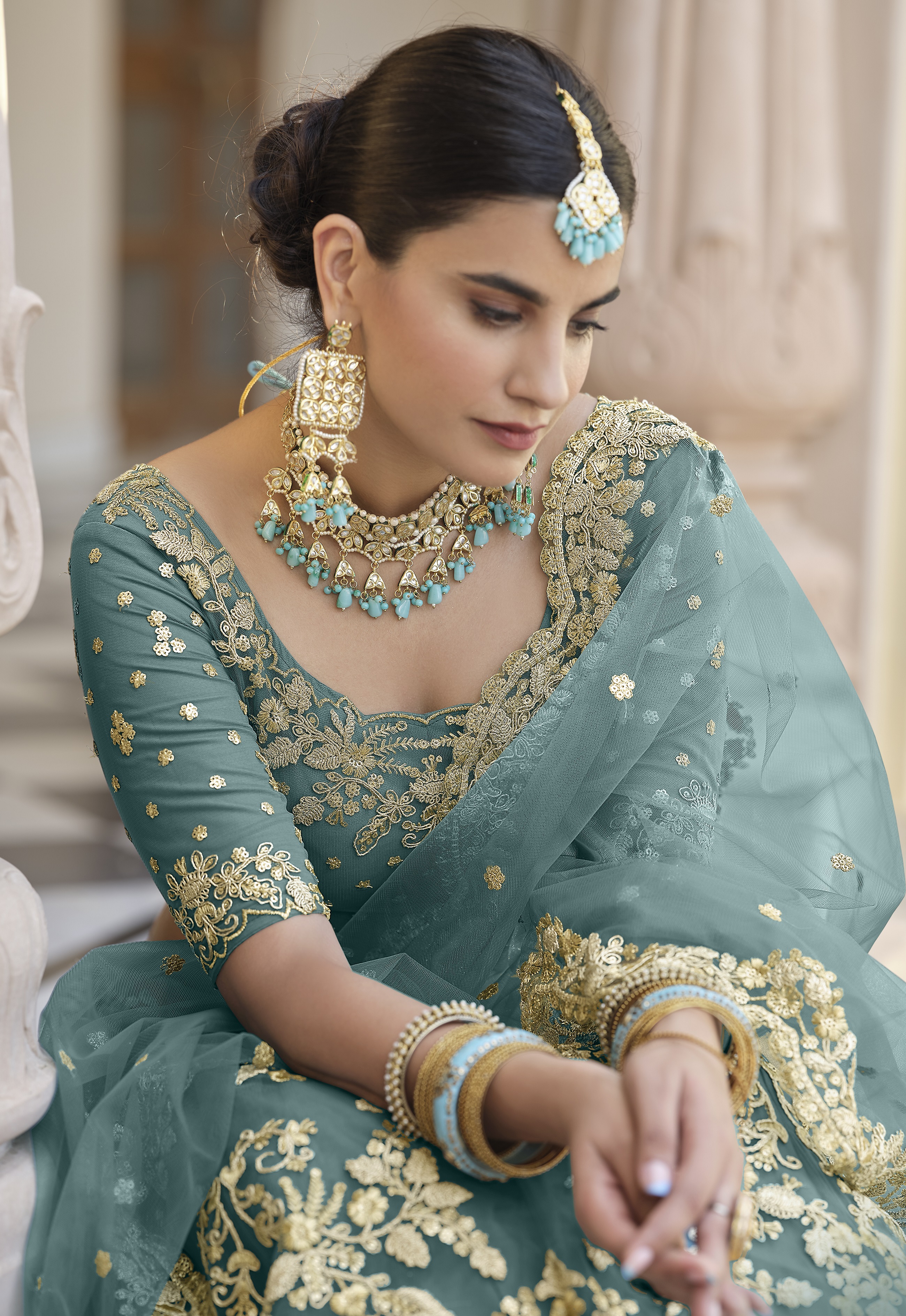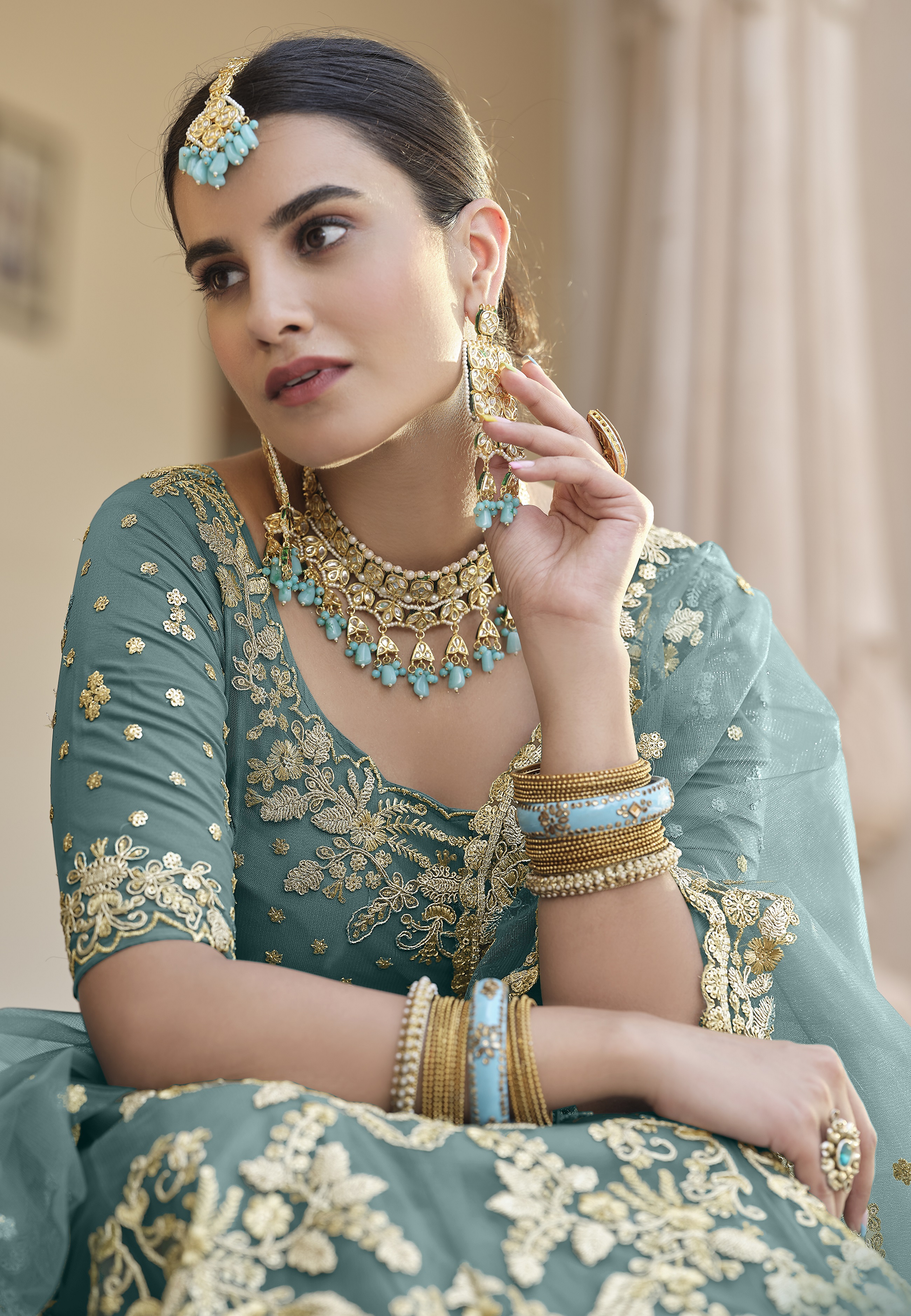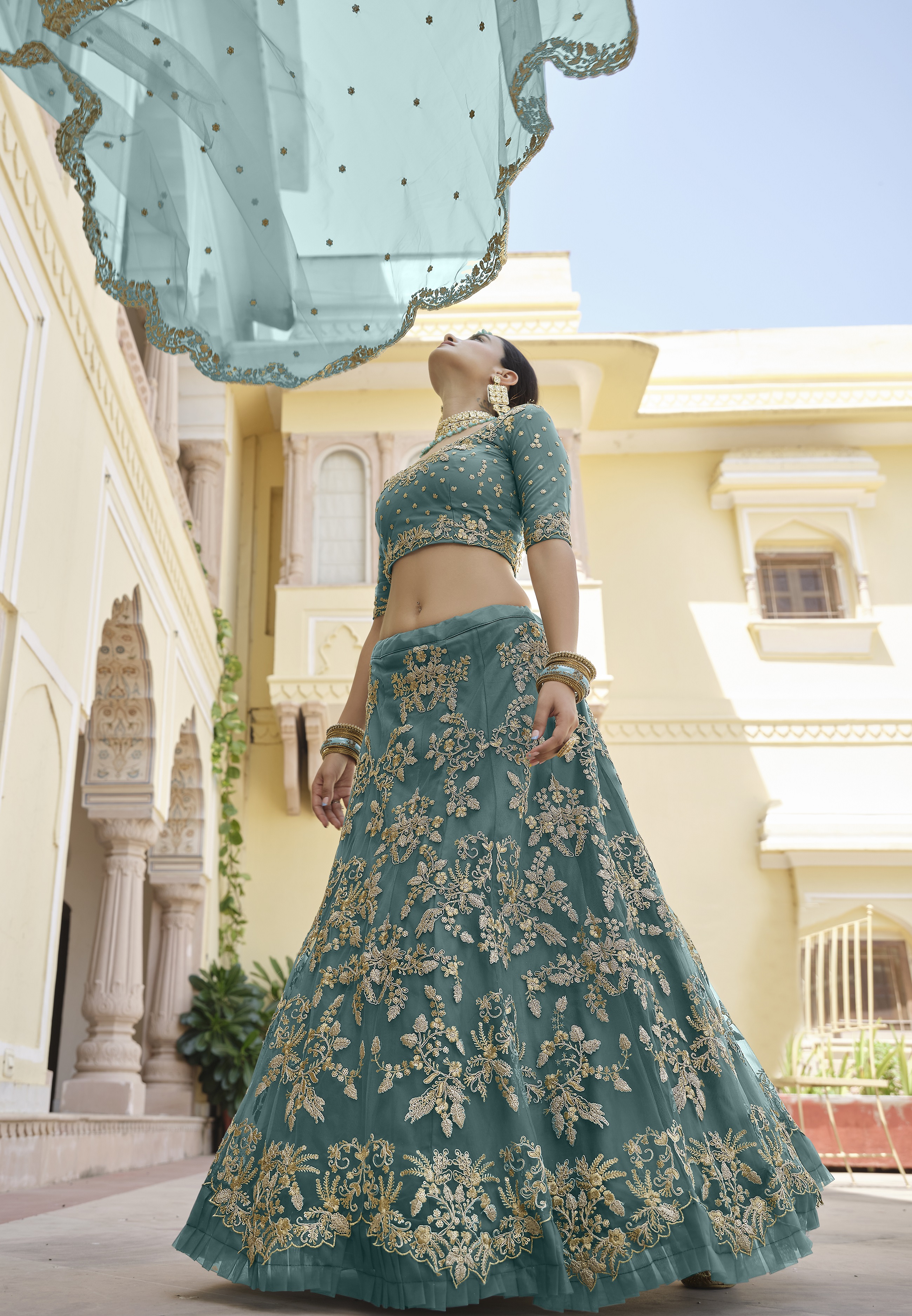 Elevate your ethnic look with this turquoise net lehenga featuring zari work work. Designed for festive occasions and celebrations, it offers a graceful flow and timeless appeal.Crafted from lightweight net fabric with a semi-stitched finish, this lehenga ensures comfort and easy customization. Dry clean recommended.