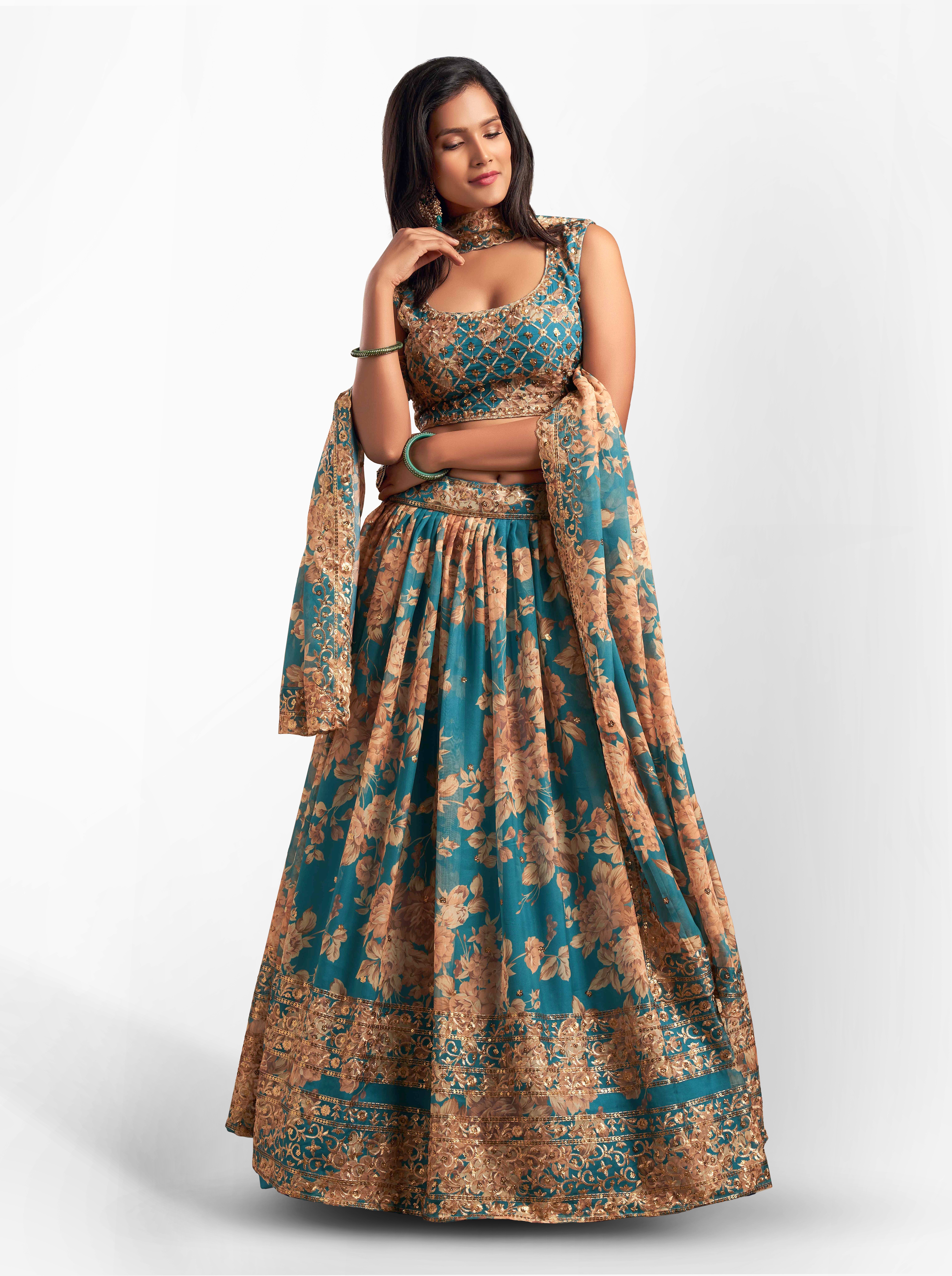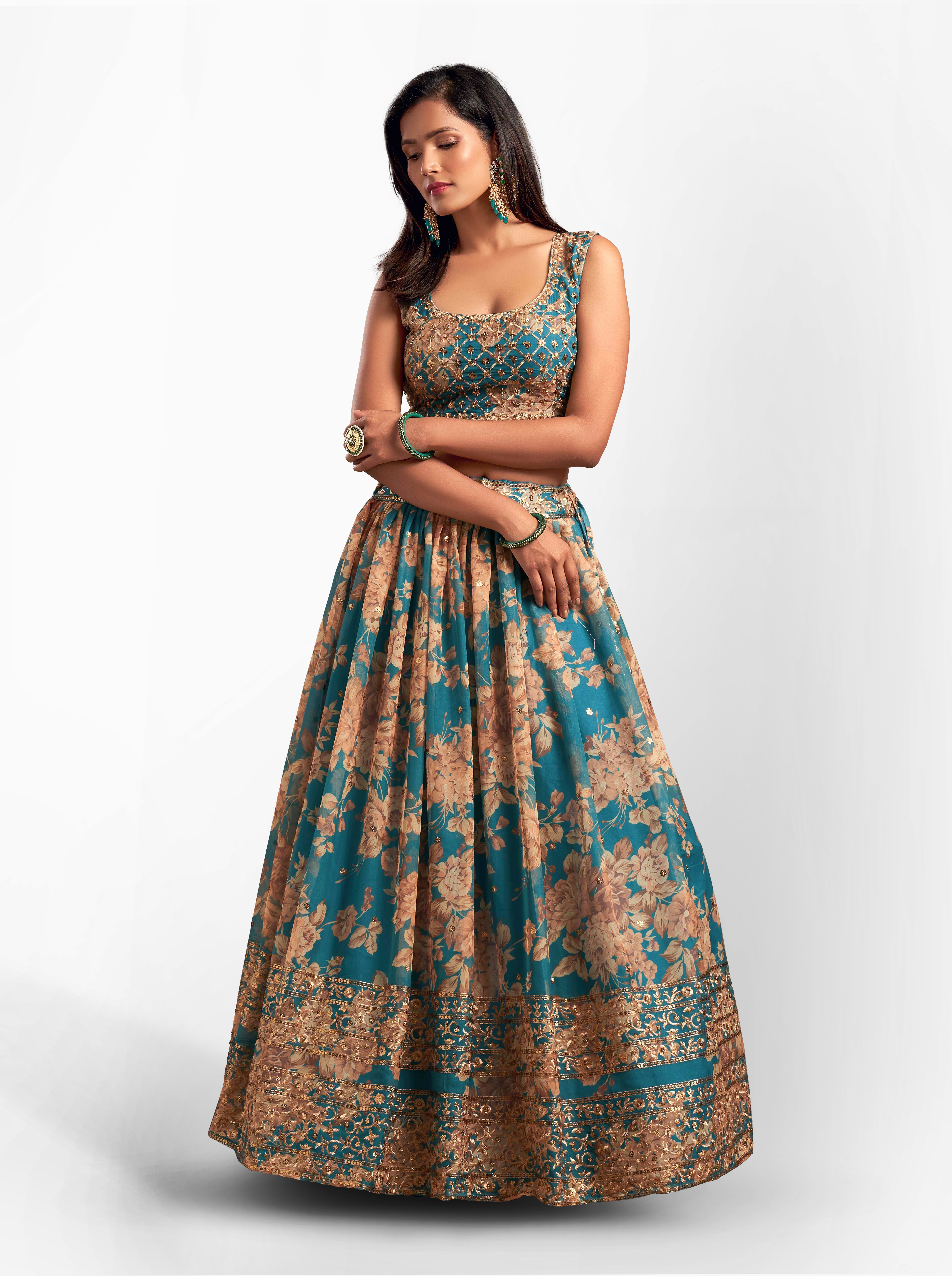 Elevate your ethnic look with this turquoise organza lehenga featuring sequence work,floral work embroidery work. Designed for festive occasions and celebrations, it offers a graceful flow and timeless appeal.Crafted from lightweight organza fabric with a semi-stitched finish, this lehenga ensures comfort and easy customization. Dry clean recommended.