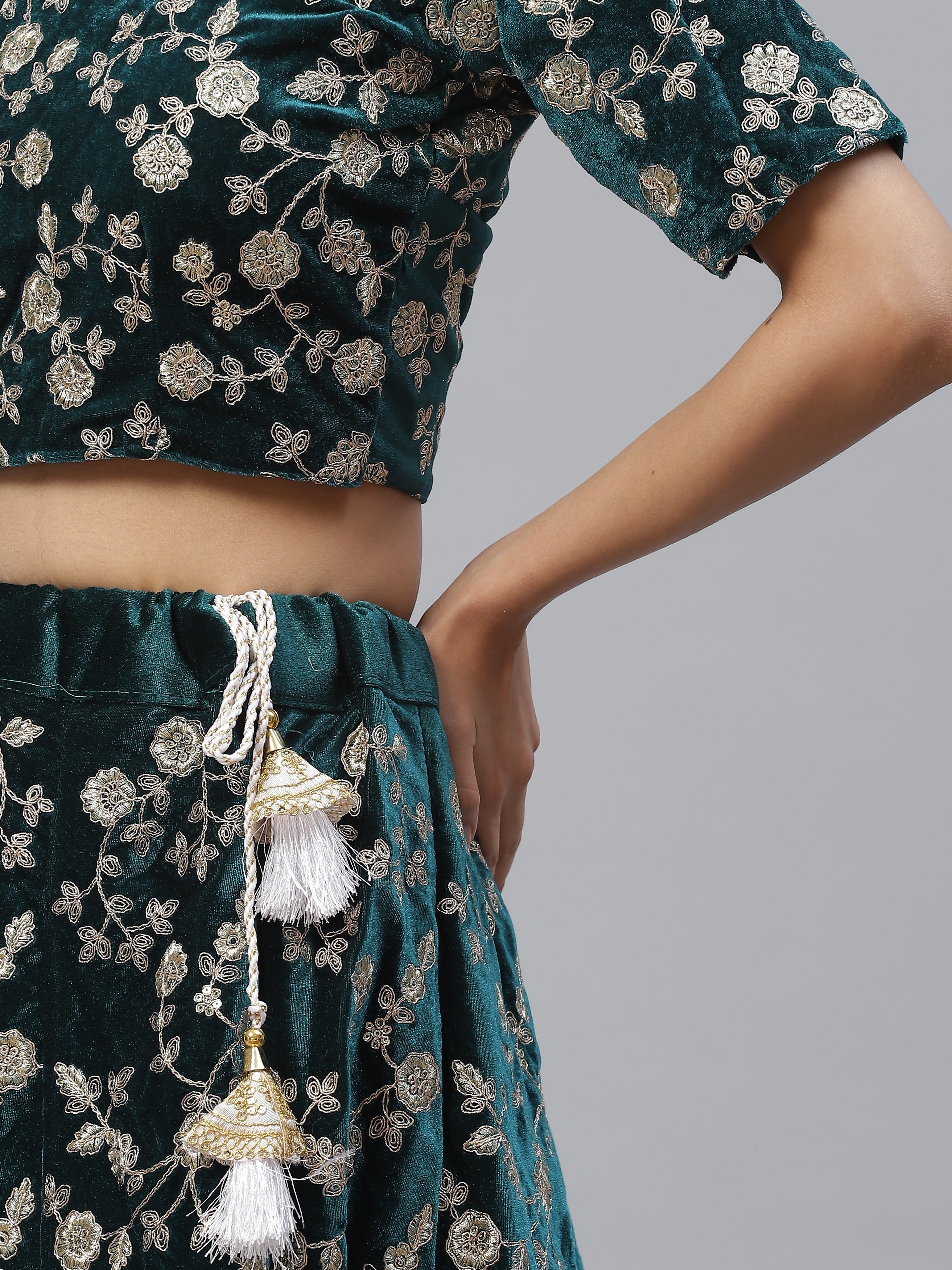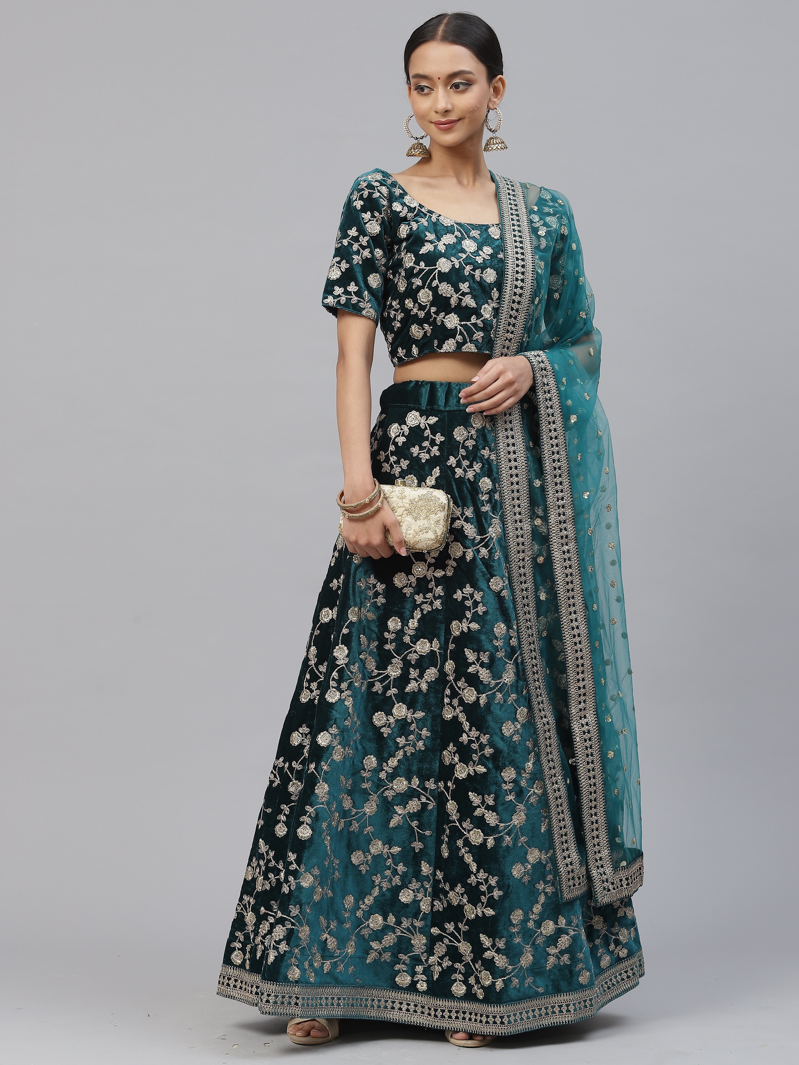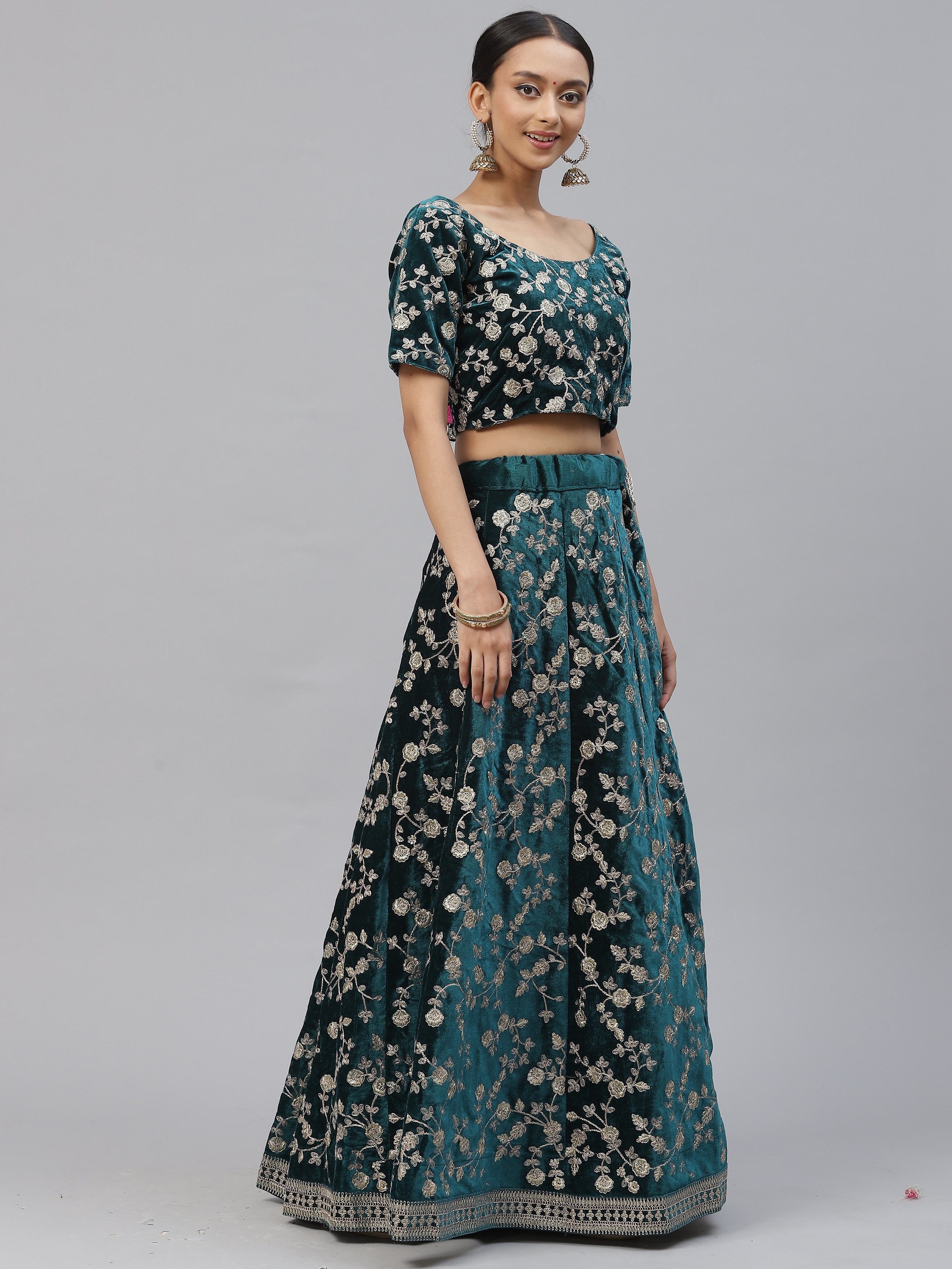 Elevate your ethnic look with this turquoise velvet lehenga featuring dori embroidery work. Designed for festive occasions and celebrations, it offers a graceful flow and timeless appeal.Crafted from lightweight velvet fabric with a semi-stitched finish, this lehenga ensures comfort and easy customization. Dry clean recommended.