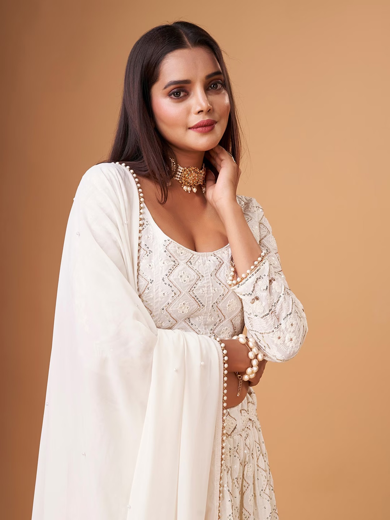 Elevate your ethnic look with this white faux georgette lehenga featuring thread embroidery work. Designed for festive occasions and celebrations, it offers a graceful flow and timeless appeal.Crafted from lightweight faux georgette fabric with a semi-stitched finish, this lehenga ensures comfort and easy customization. Dry clean recommended.