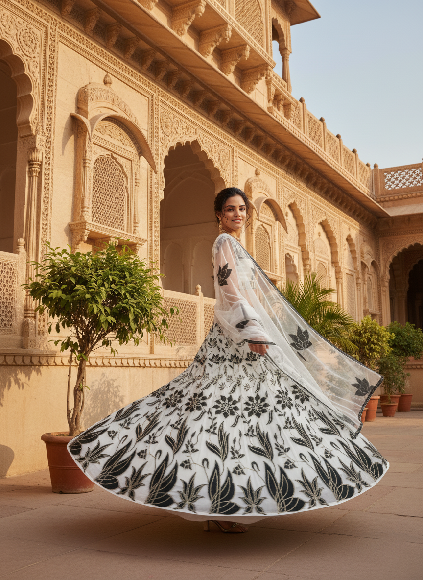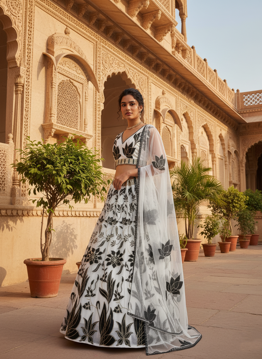 LEHENGA(BOTTOM)FABRIC:- FAUX GEORGETTEINNER:- MICRO FABRICWORK:- BLACK THREAD AND 3MM SEQUINS EMBROIDERY WORKSTITCH:- SEMI STITCHED WITH CANCAN AND CANVASSIZE:- 42HEIGHT AND 42WAISTFLAIR:- 3.50 METER FLAIR COLOR:- BALCK AND OFFWHITECHOLI(TOP):-FABRIC:- FAUX GEORGETTESIZE:- 0.80 METER FABRICWORK:- BLACK THREAD AND 3MM SEQUINS EMBROIDERY WORK STITCH:- UN STITCHED FABRICCOLOR:- BALCK AND OFFWHITEINNER:- MICRO FABRICDUPATTA:-FABRIC:- FAUX GEORGETTEWORK:- BLACK THREAD AND 3MM SEQUINS EMBROIDERY WORKSIZE:- 2.25 METER DUPATTASTITCH:- FULL STITCHEDCOLOR:- BALCK AND OFFWHITEADDITIONALWASH CARE: - DRY CLEAN ONLYCOLOR: - PRODUCT COLOR MAY SLIGHTLY VARY DUE TO PHOTOGRAPHIC LIGHTNING SOURCES OR YOUR DEVICE DISPLAY SETTINGSTHESE ARE MADE TO ORDER DESIGNER STYLES, HENCE EXPECT A SLIGHT VARIATION FROM THE IMAGE DISPLAYEDIN THE BOX 1 PIECE LEHENGA 1 PIECE DUPATTA 1 PIECE BLOUSE FABRIC.