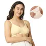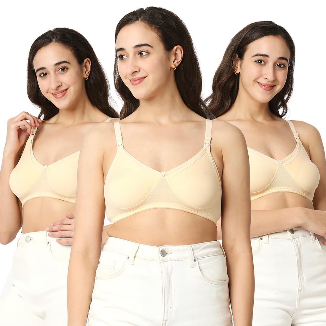 A feeding bra also known as a nursing bra is specially designed to provide comfort support and convenience for breastfeeding mothers. Unlike regular bras it features easy-access panels or cups that can be unclipped or pulled down to allow for quick and discreet breastfeeding or pumping. These bras are essential for new mothers as they make the process of breastfeeding smoother and more comfortable both at home and on the go. Made of 100% cotton with extra-soft elastic for ease of wear Front clasp with drop clip to breastfeed quickly. Non-wired for utmost comfort Equipped with thicker straps broader sides and a deeper center front for complete support Non-wired for utmost comfort Ergonomically designed fabric to aid in breastfeeding. Machine washable. Available in ALL sizes - 34 36 38 85 and cup sizes - B C D and neutral colors to suit your preferences.