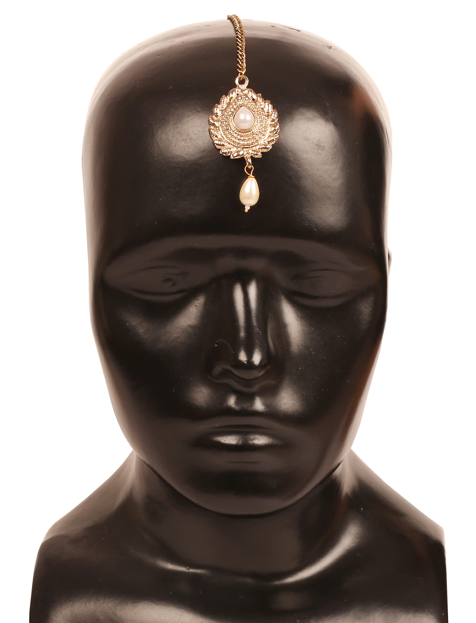 HomeFashionMaang tikkaNew! Touchstone Indian Bollywood Traditional Grain Work Petals Patterns Studded Diamond Look Faux Pearl Designer Jewelry Mangtika Accessory in Antique Gold Tone for Women.