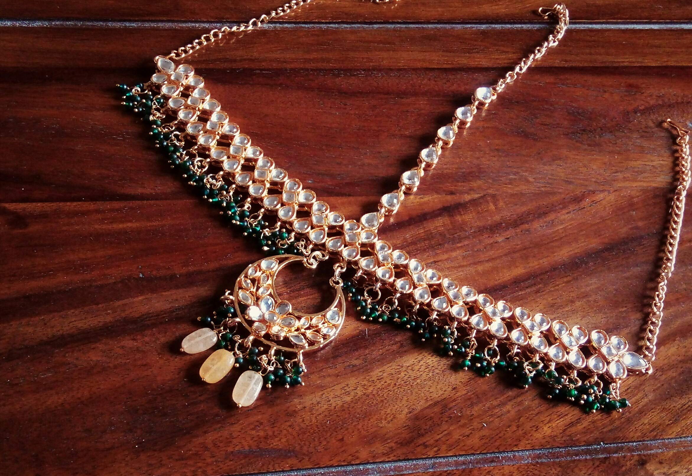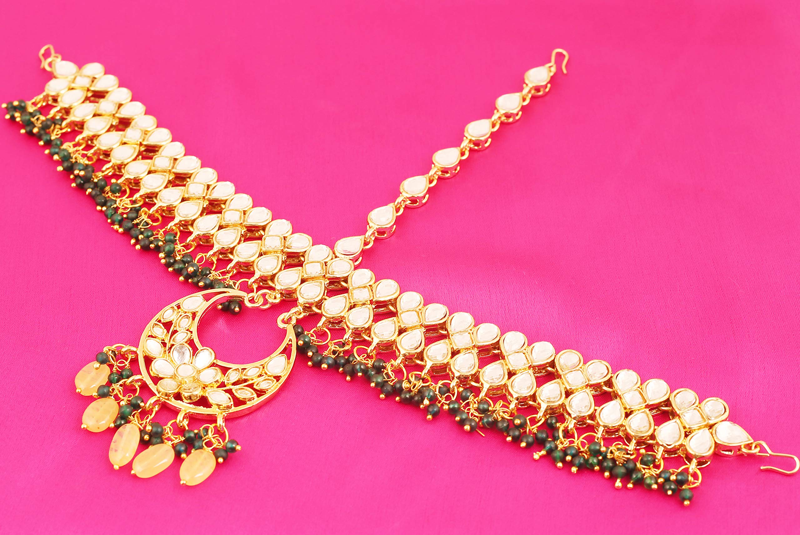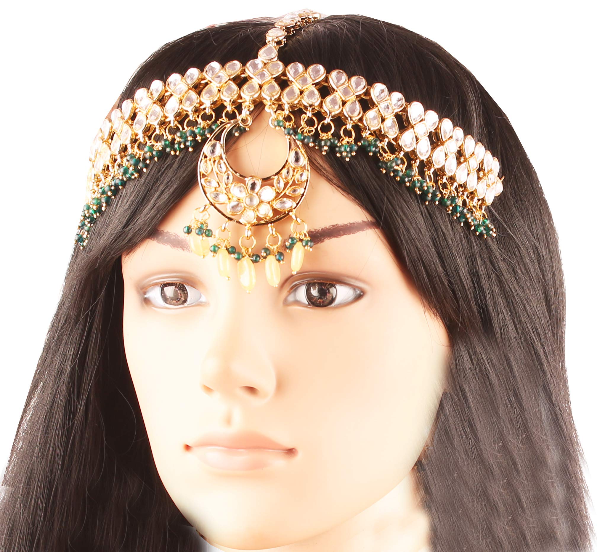 Touchstone Indian Bollywood Exclusive Mughal Era Inspired Stylish Traditional Kundan Polki Look Designer Jewelry Wedding Mathapatti-Forehead Enhancer in Antique Gold Tone Women.