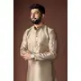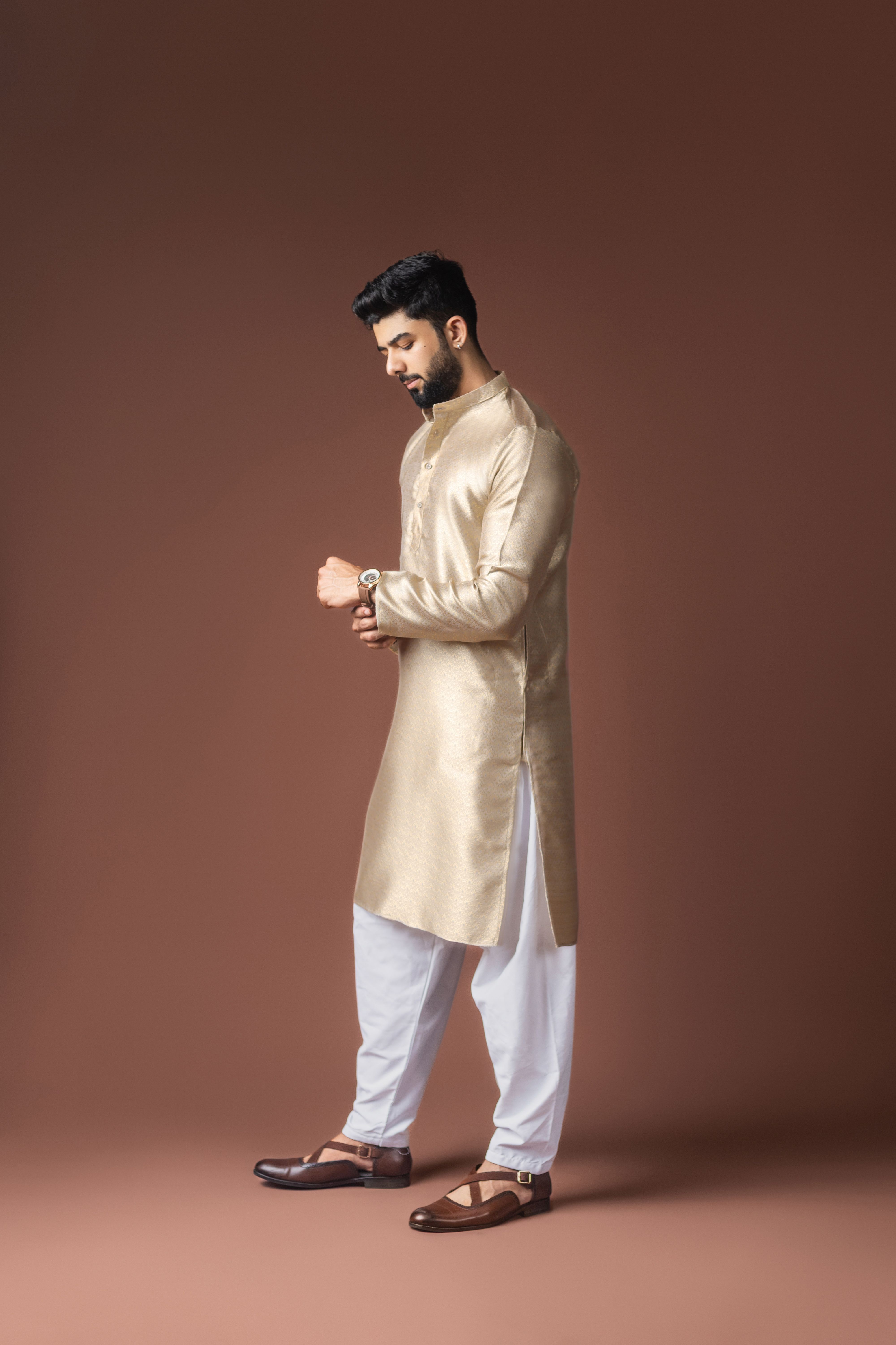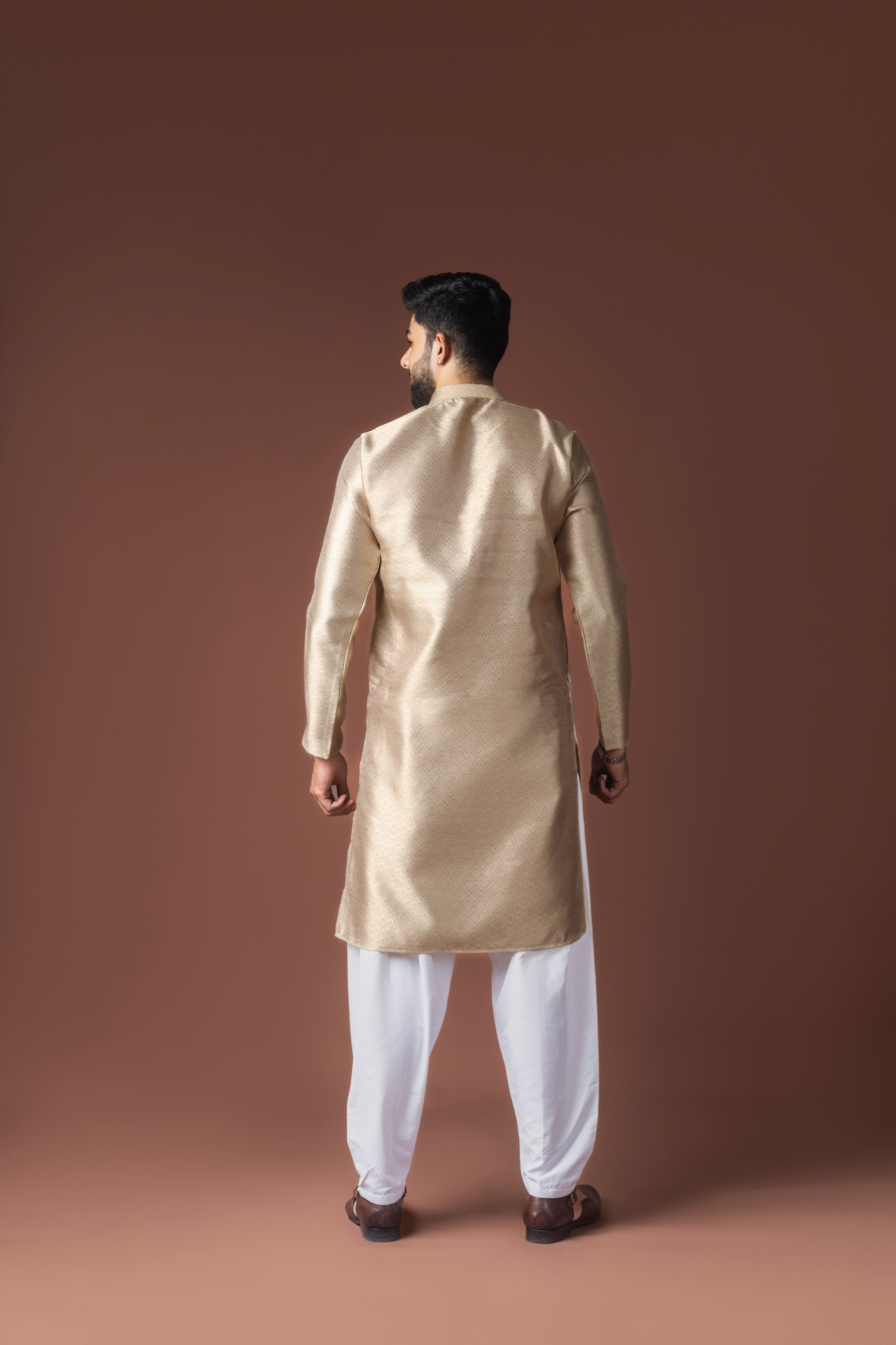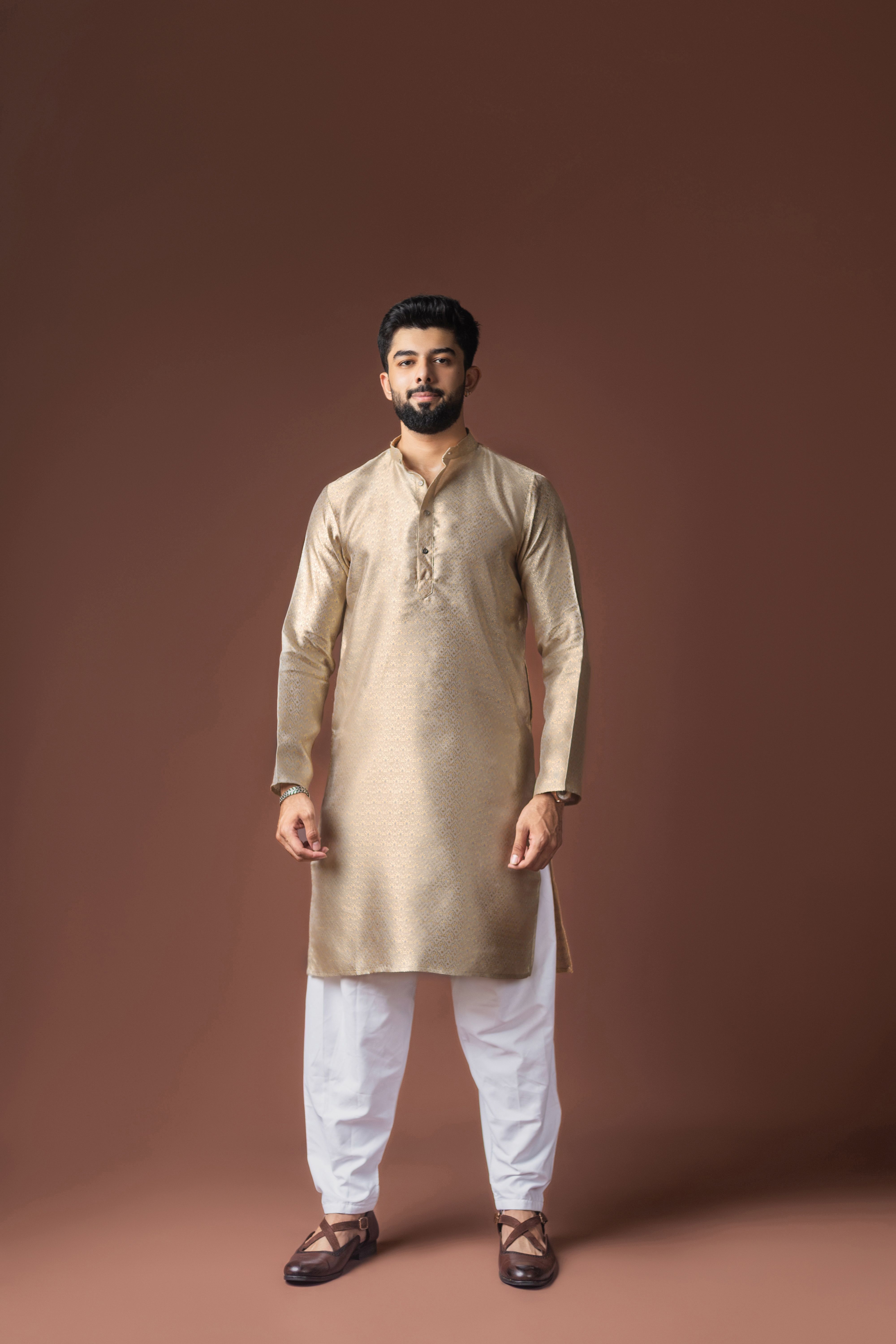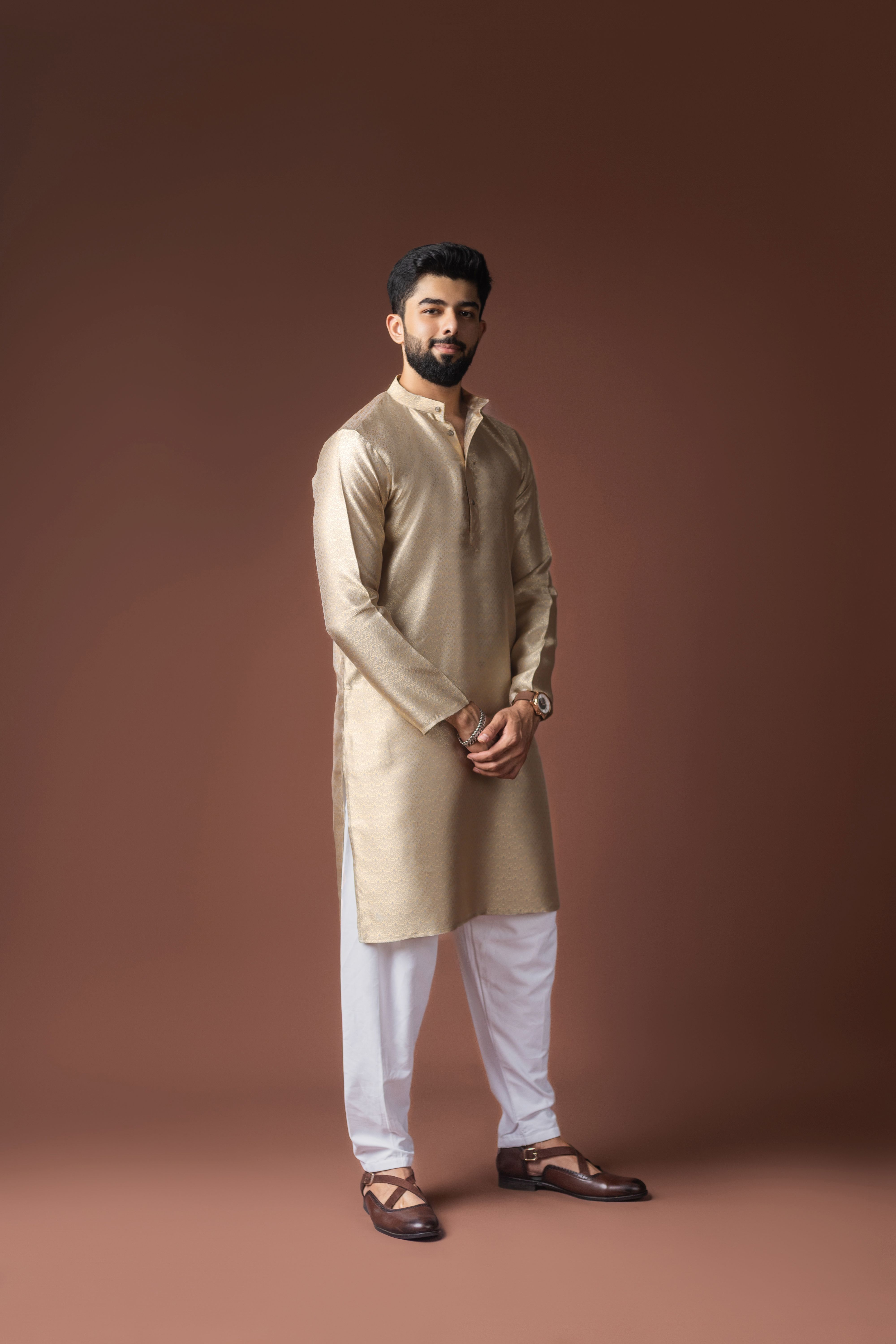 Beige Color Jacquard Designer Ethnic Men's Kurta Payjama For Festive Looks