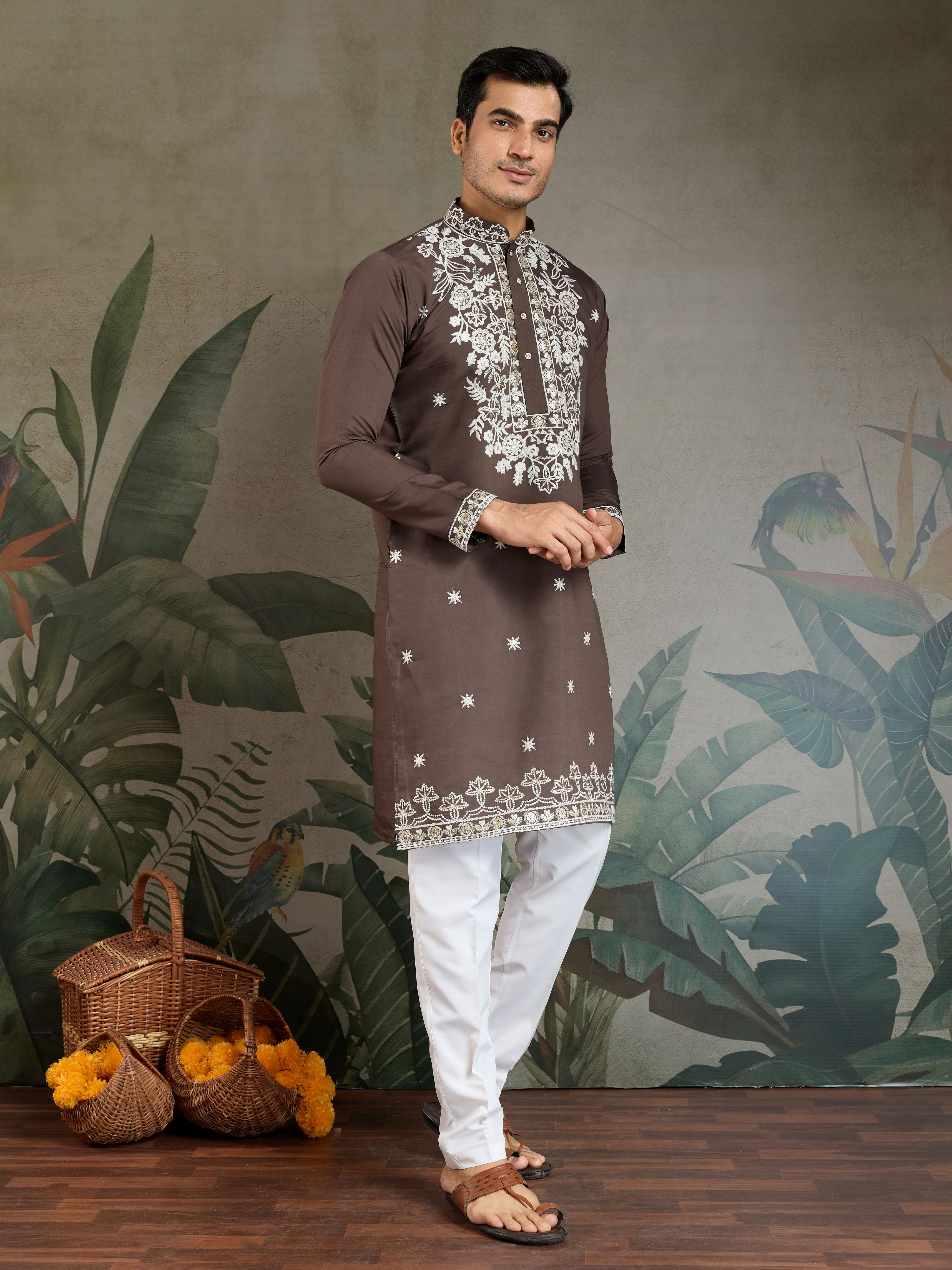 Chocolate Grey Color Rayon Fabric Sequins Embroidery Work Ethnic Ceremonial Wear Men's Kurta