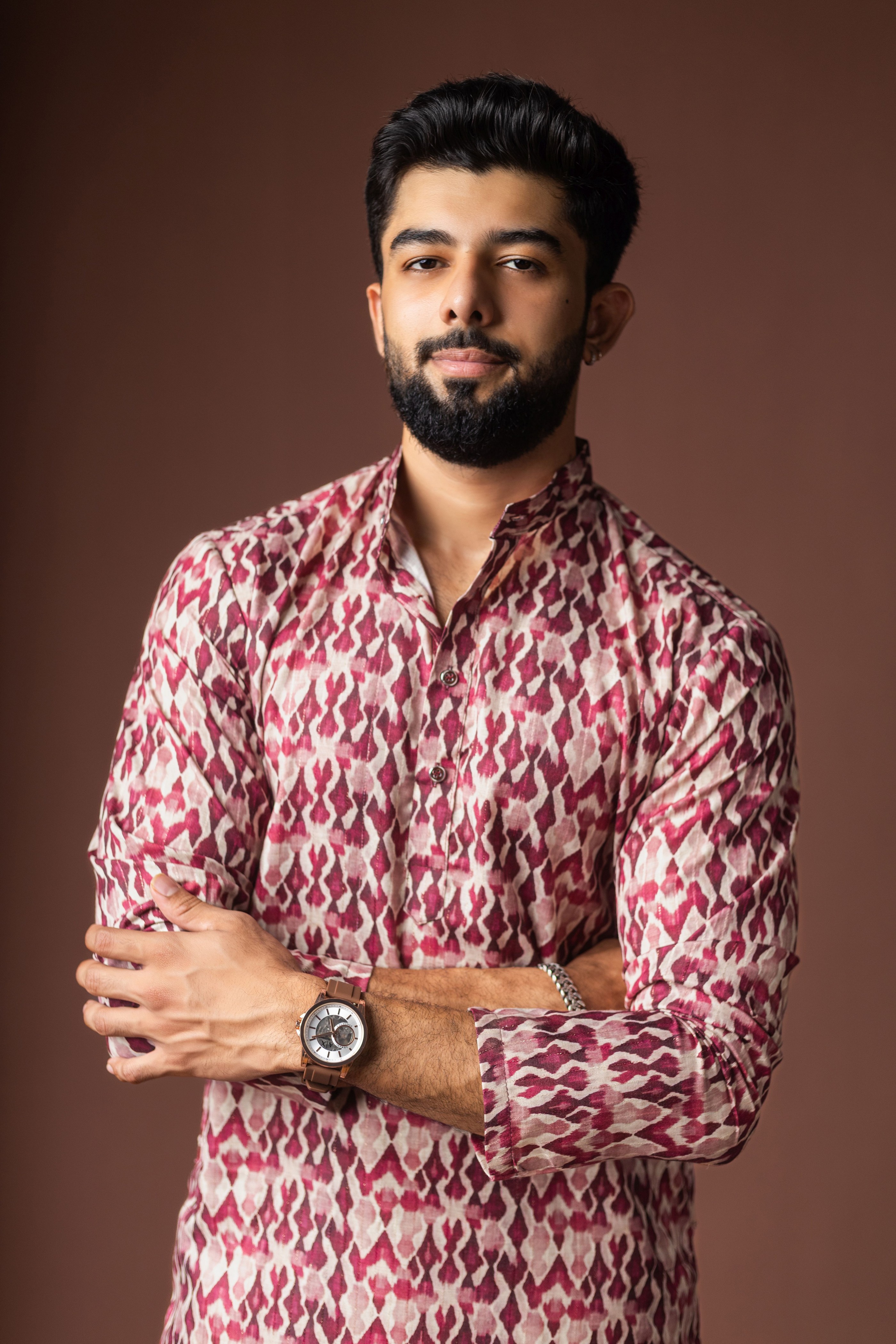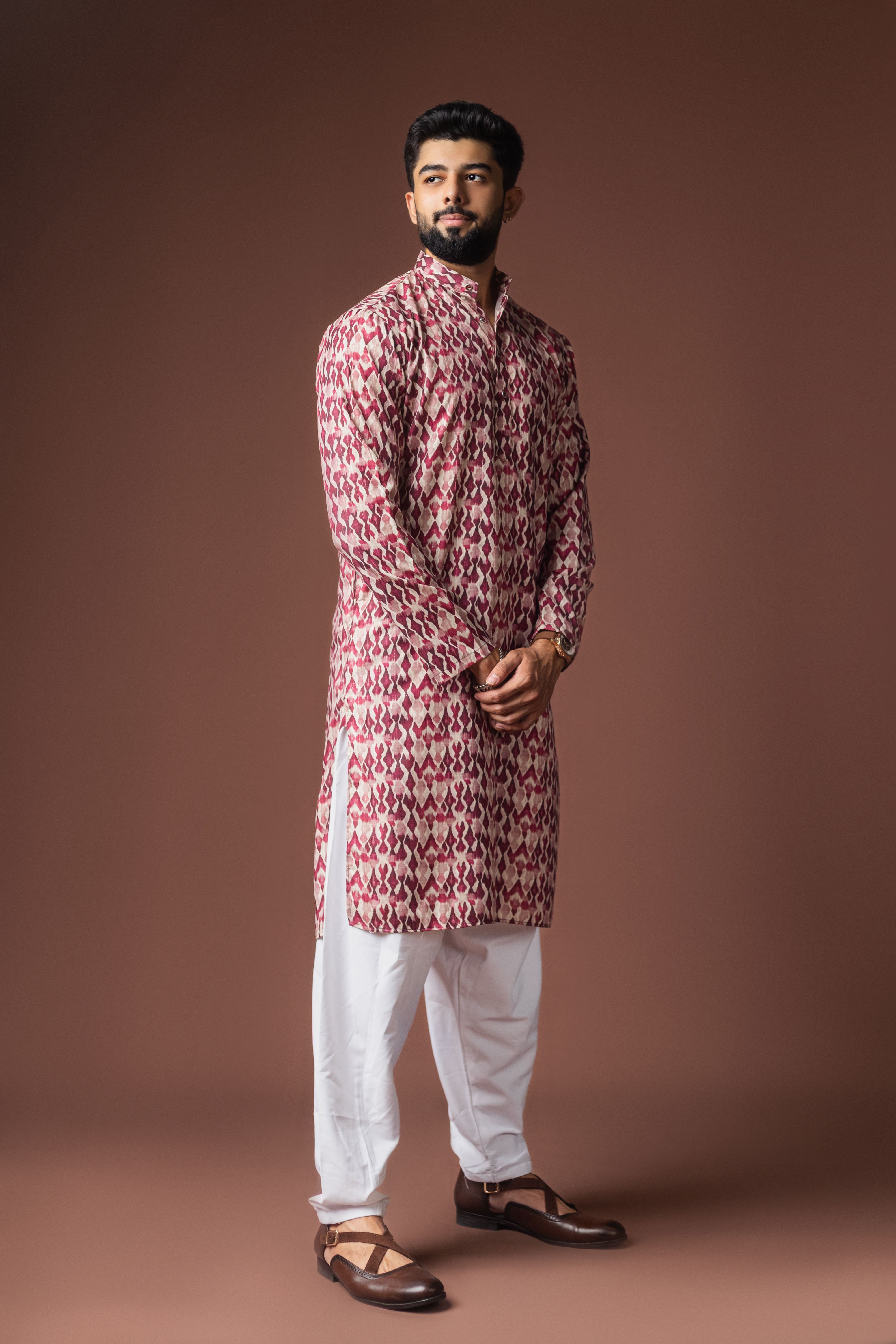 Dusty Rose Color Blended Linen Designer Printed Stylish Kurta Payjama For Mens'