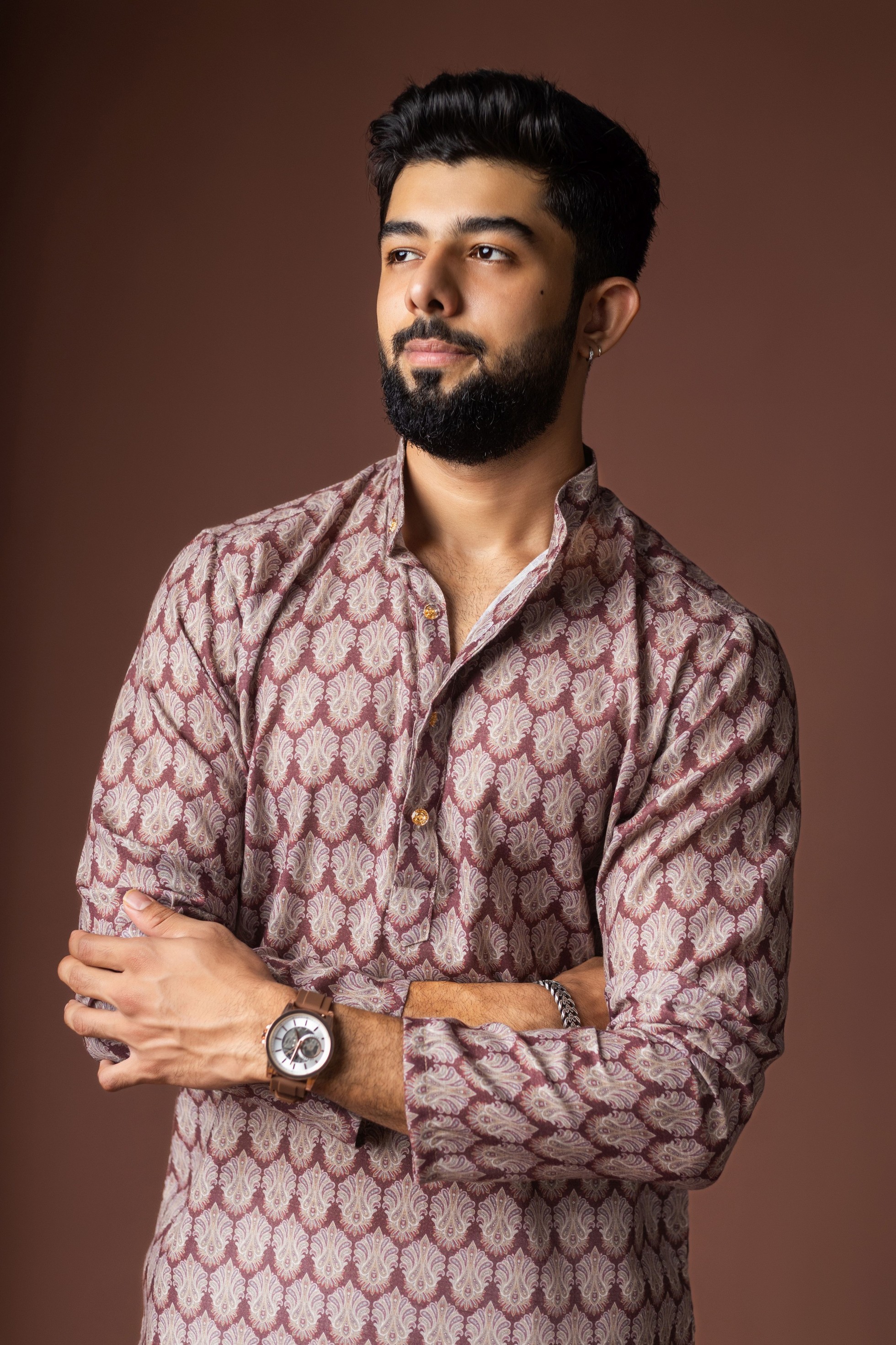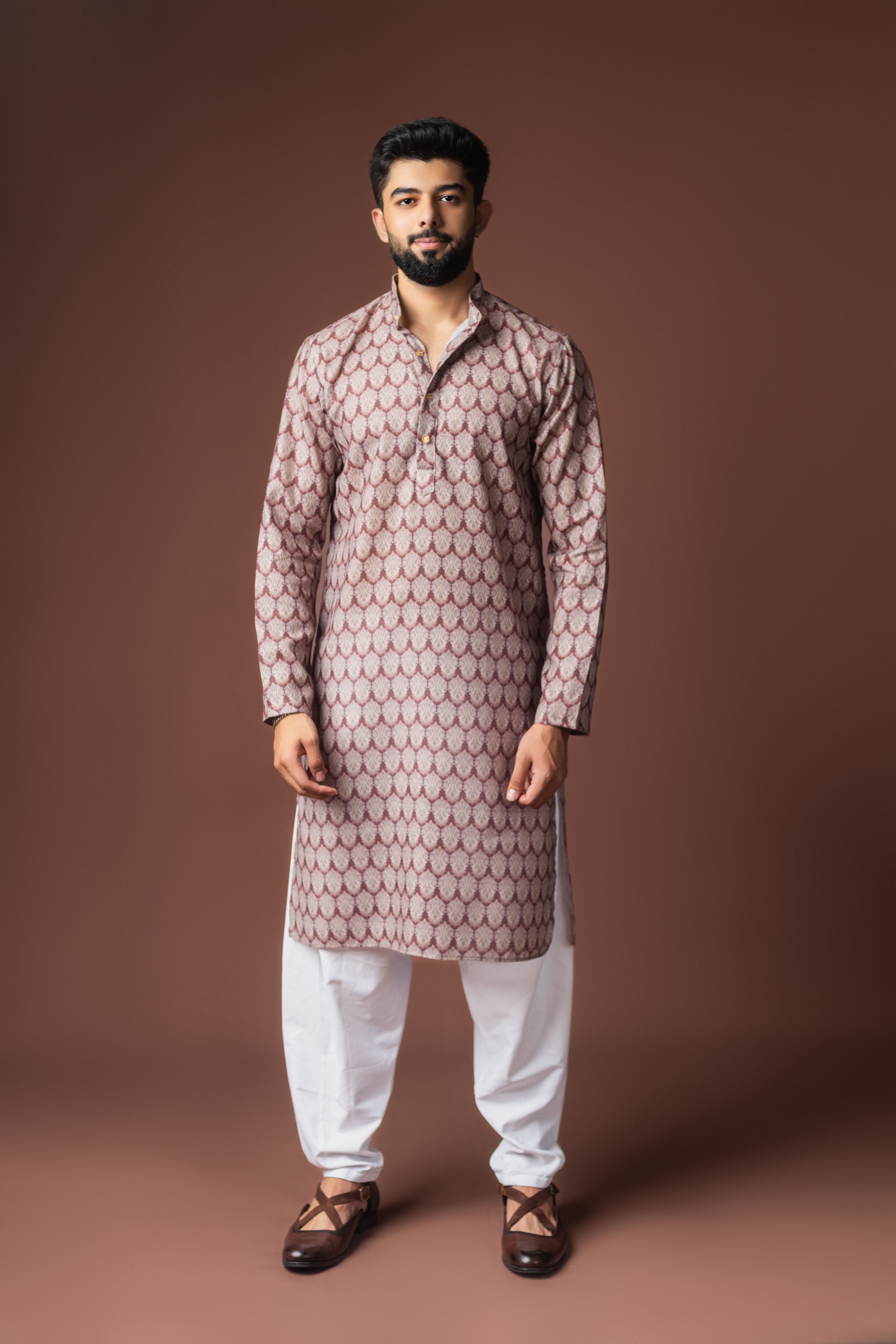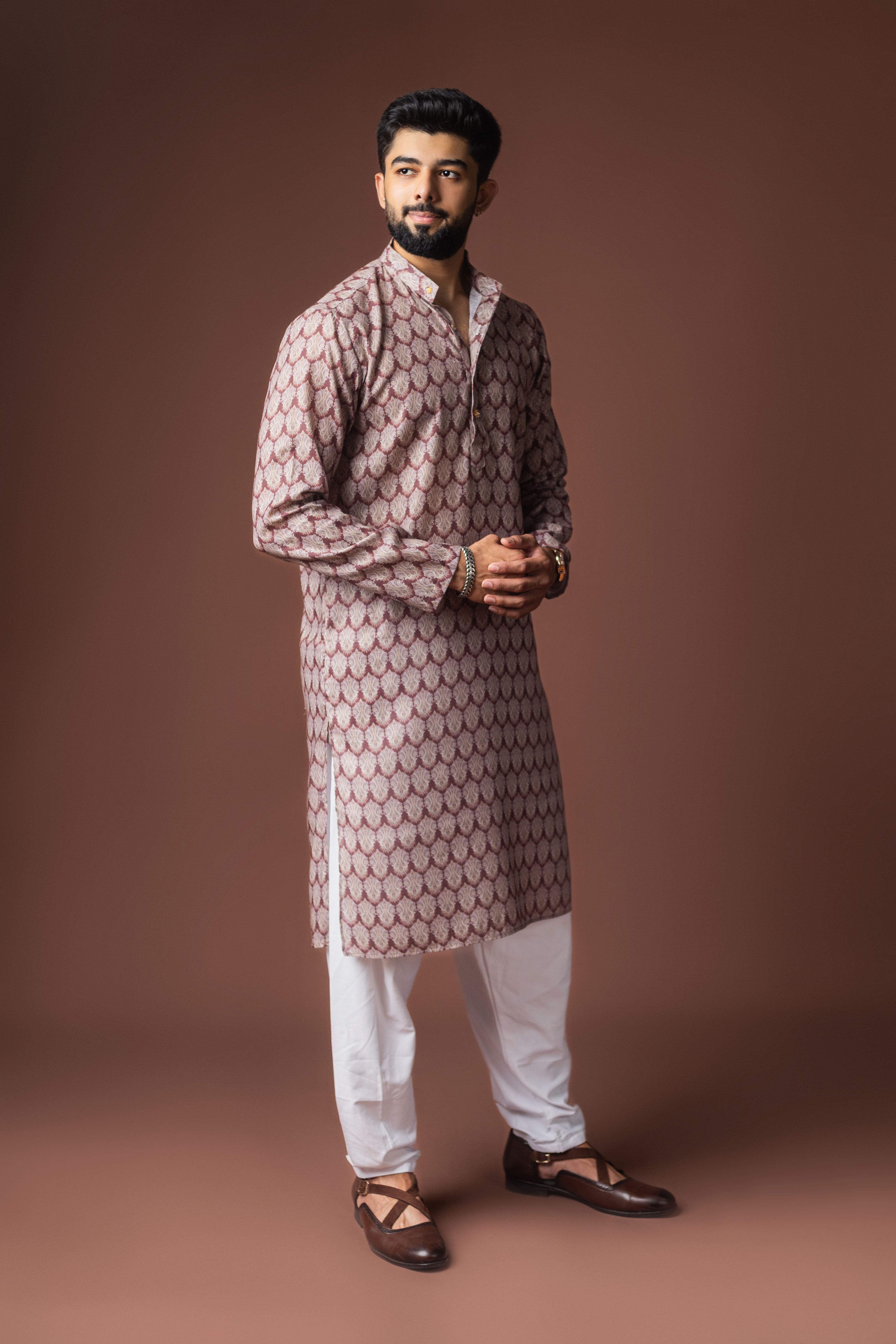 Mauve Color Blended Linen Designer Printed Stylish Kurta Payjama For Mens'