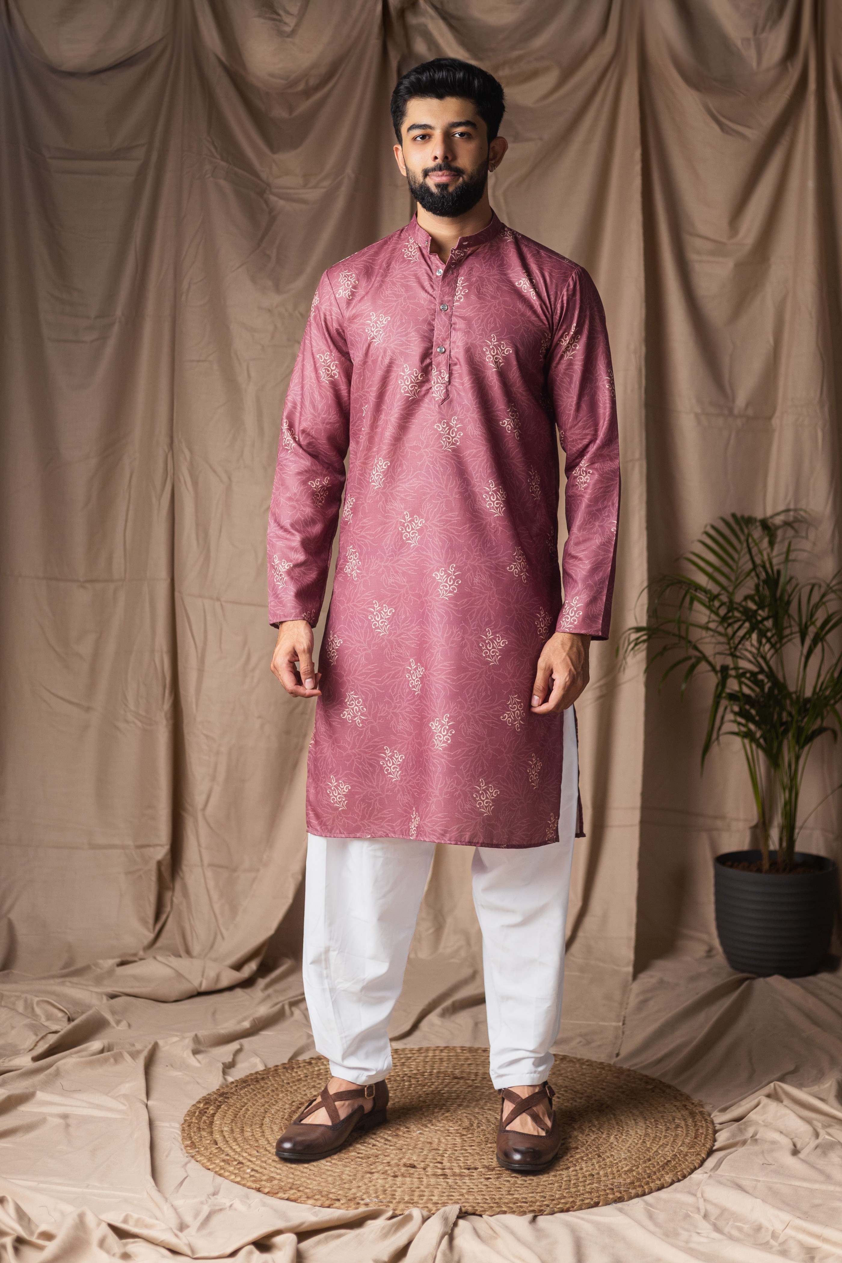 Mauve Color Blended Linen Designer Printed Stylish Kurta Payjama For Mens'