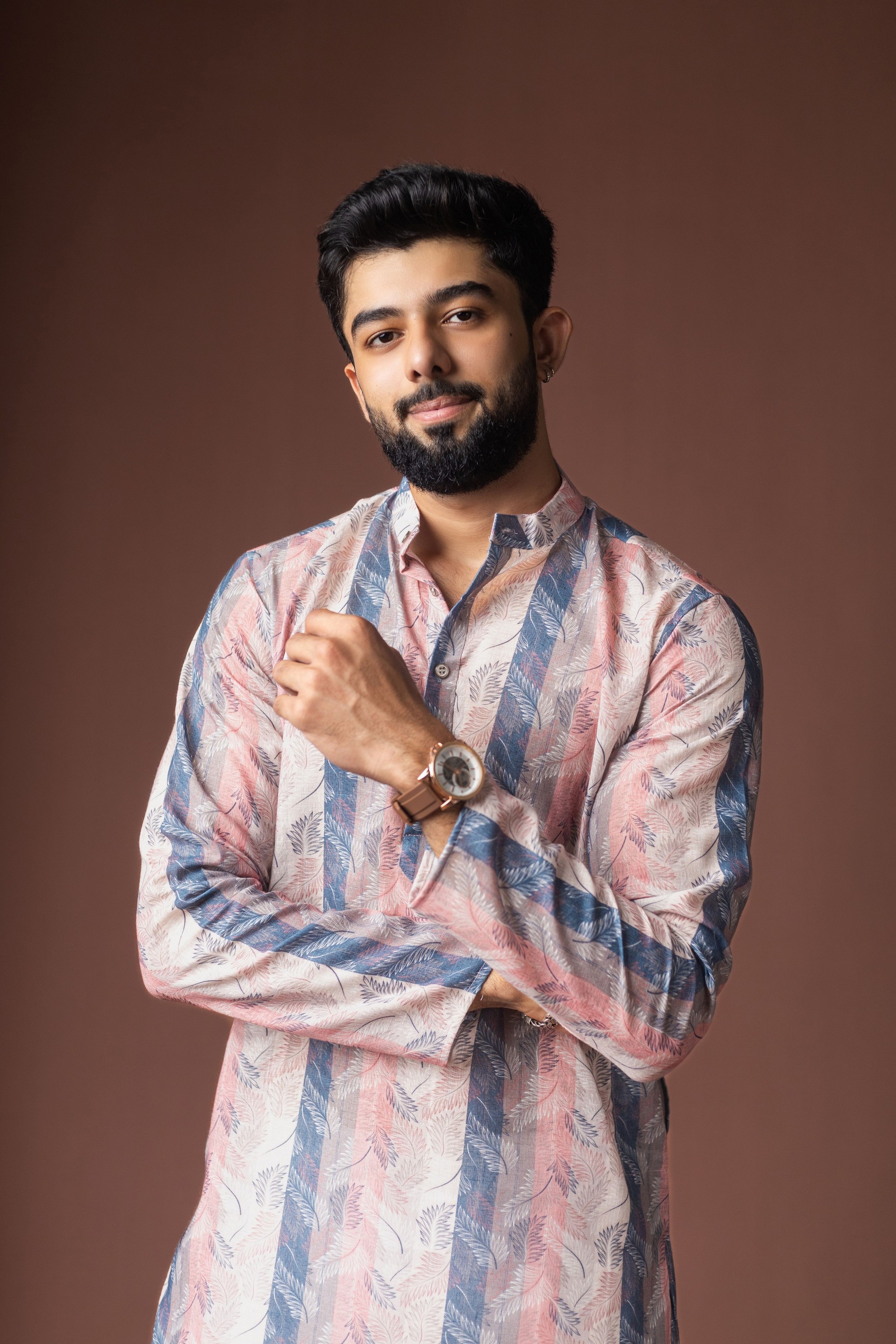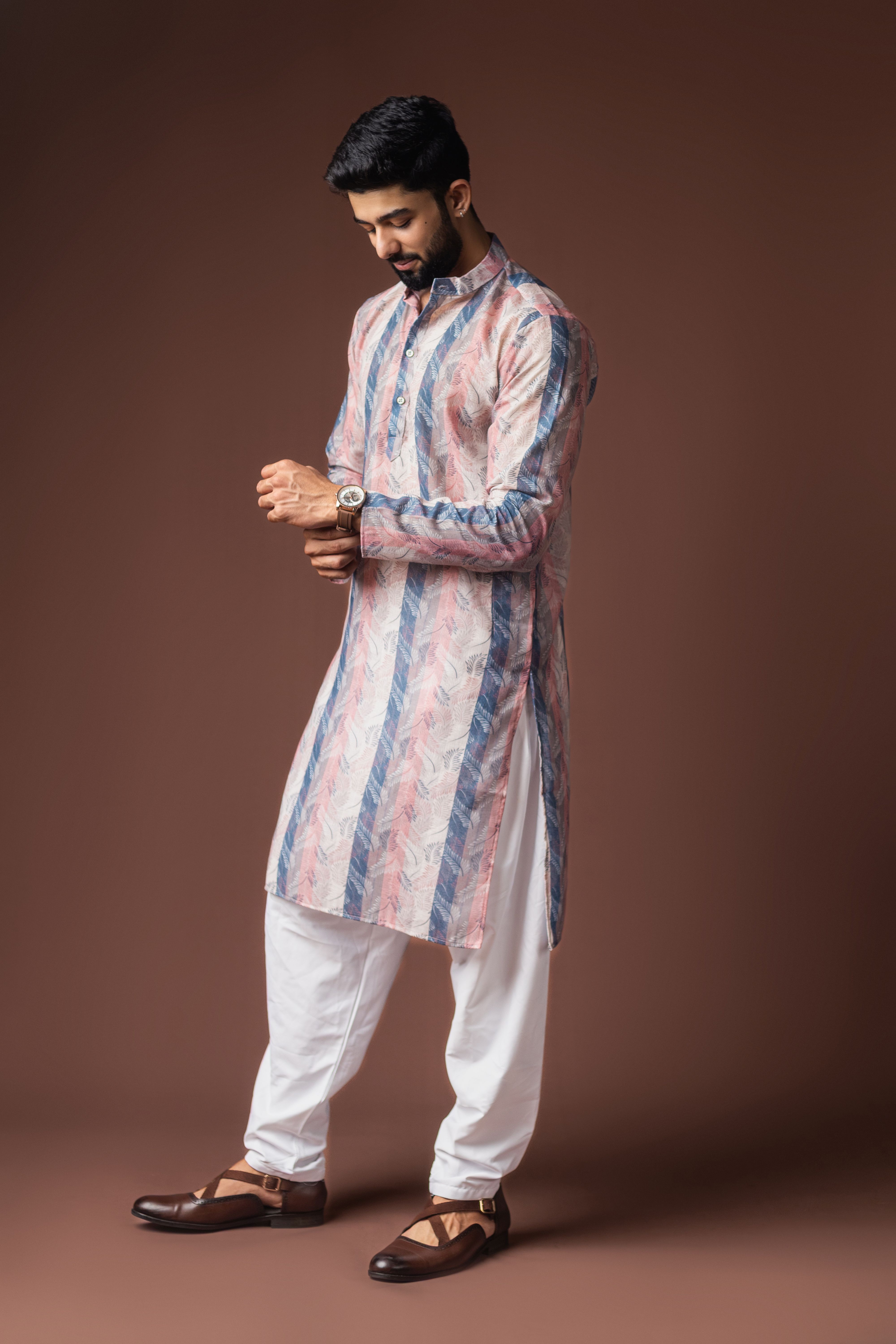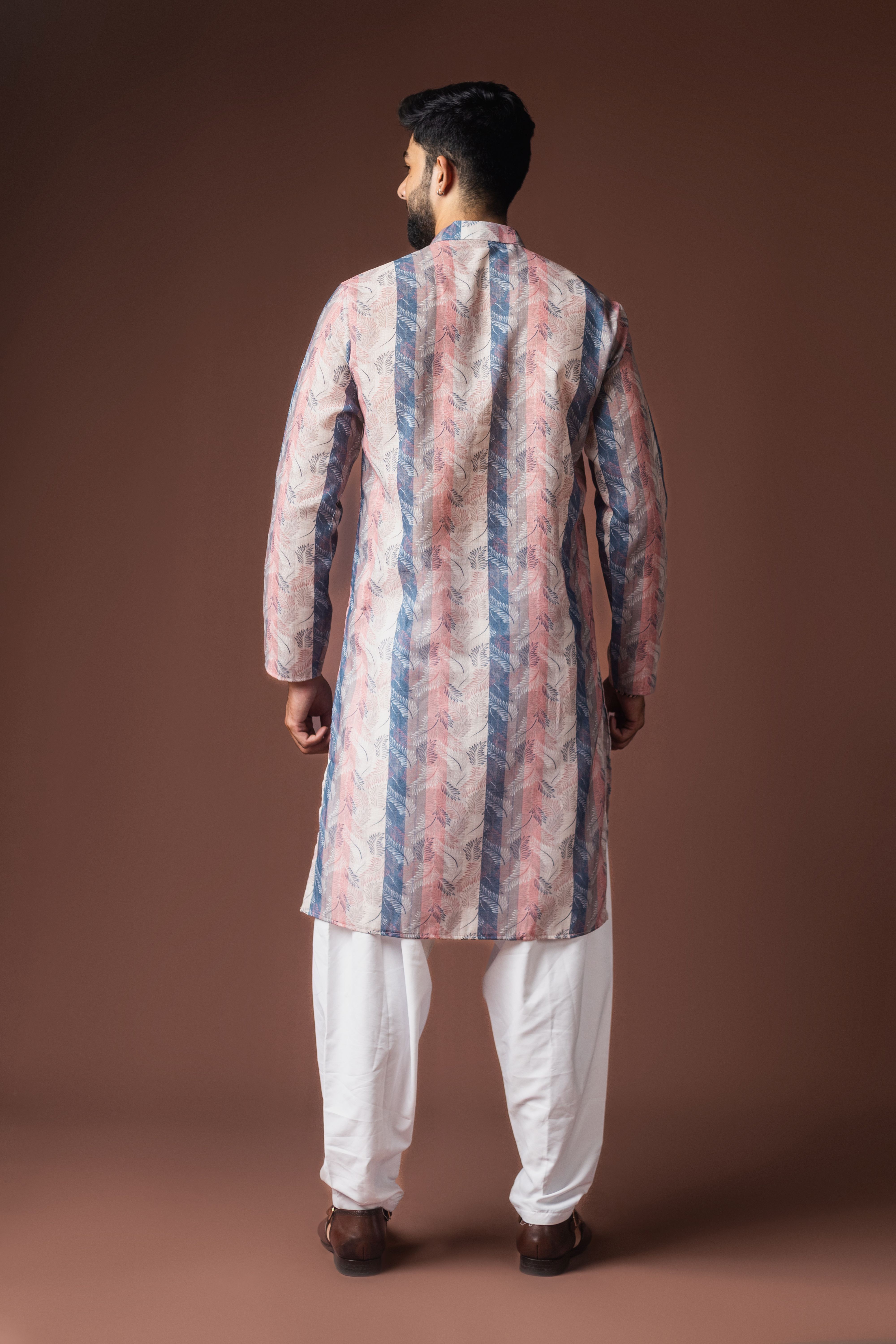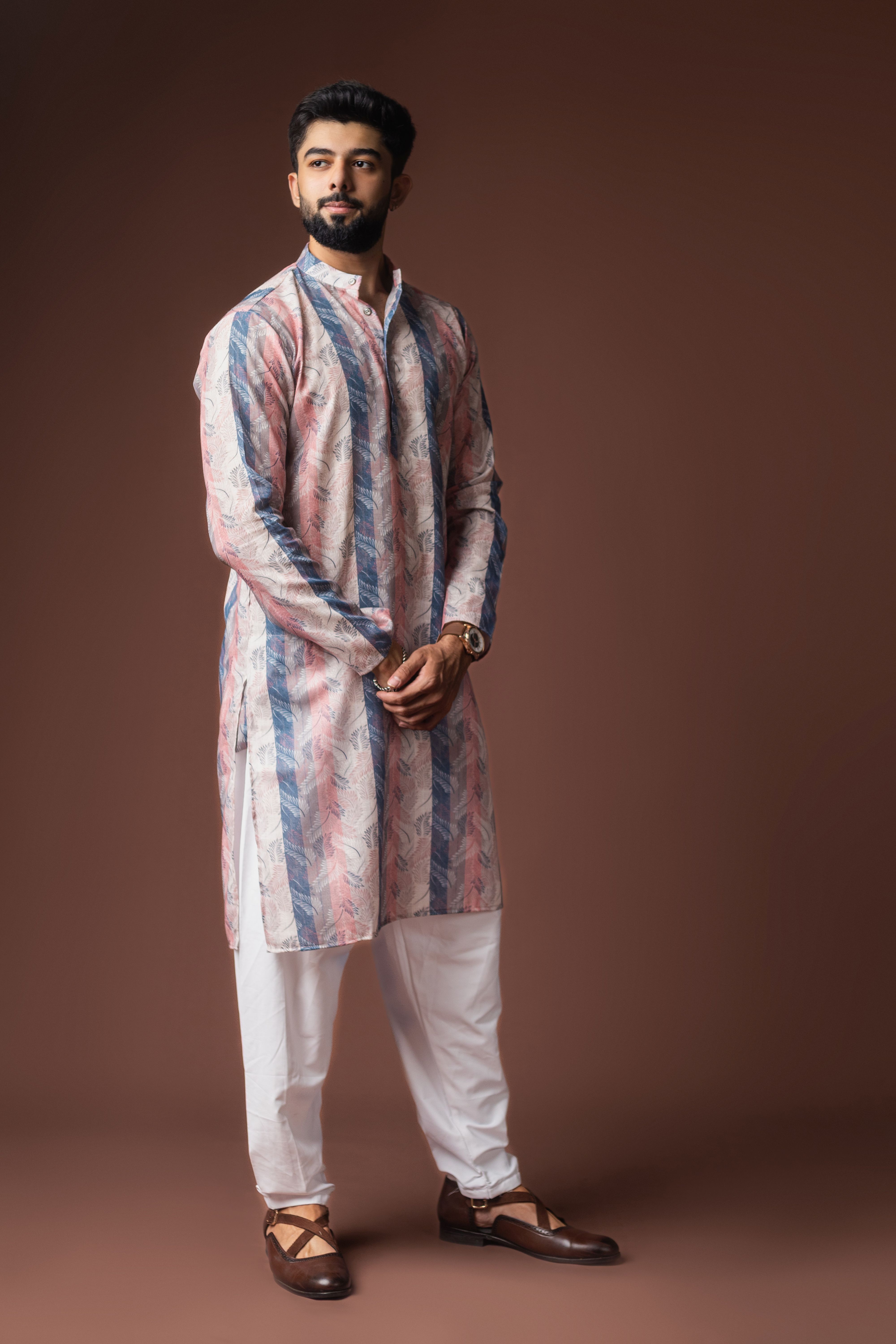 Multy Color Blended Linen Fabric Designer Printed Festive Wear Men's Kurta Payjama